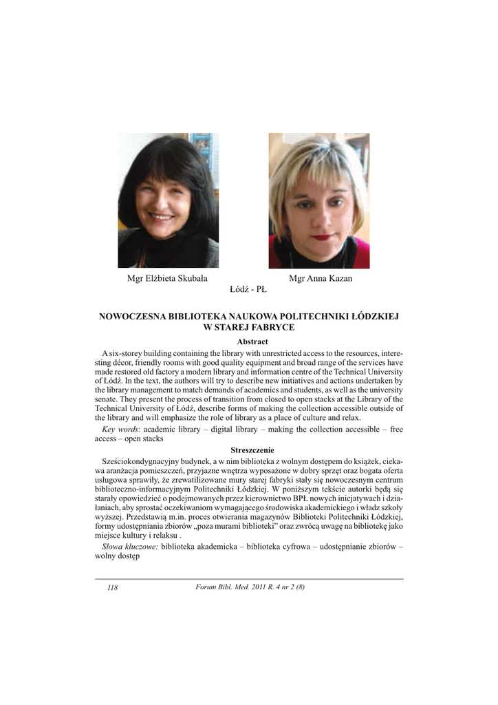 Mgr Elżbieta Skubała Mgr Anna Kazan Łódź - PŁ NOWOCZESNA BIBLIOTEKA NAUKOWA POLITECHNIKI ŁÓDZKIEJ W STAREJ FABRYCE Abstract A six-storey building containing the library with unrestricted access to the resources, interesting décor, friendly rooms with good quality equipment and broad range of the services have made restored old factory a modern library and information centre of the Technical University of Łódź. In the text, the authors will try to describe new initiatives and actions undertaken by the library management to match demands of academics and students, as well as the university senate. They present the process of transition from closed to open stacks at the Library of the Technical University of Łódź, describe forms of making the collection accessible outside of the library and will emphasize the role of library as a place of culture and relax. Key words: academic library – digital library – making the collection accessible – free access – open stacks Streszczenie Sześciokondygnacyjny budynek, a w nim biblioteka z wolnym dostępem do książek, ciekawa aranżacja pomieszczeń, przyjazne wnętrza wyposażone w dobry sprzęt oraz bogata oferta usługowa sprawiły, że zrewatilizowane mury starej fabryki stały się nowoczesnym centrum biblioteczno-informacyjnym Politechniki Łódzkiej. W poniższym tekście autorki będą się starały opowiedzieć o podejmowanych przez kierownictwo BPŁ nowych inicjatywach i działaniach, aby sprostać oczekiwaniom wymagającego środowiska akademickiego i władz szkoły wyższej. Przedstawią m.in. proces otwierania magazynów Biblioteki Politechniki Łódzkiej, formy udostępniania zbiorów „poza murami biblioteki” oraz zwrócą uwagę na bibliotekę jako miejsce kultury i relaksu . Słowa kluczowe: biblioteka akademicka – biblioteka cyfrowa – udostępnianie zbiorów – wolny dostęp 118 Forum Bibl. Med. 2011 R. 4 nr 2 (8) Trochę historii Biblioteka Główna Politechniki Łódzkiej (BGPŁ) została utworzona we wrześniu 1945 roku. Pierwszą siedzibą biblioteki i jej 4-osobowego zespołu było 2-pokojowe pomieszczenie w budynku dość odległym od centrum Politechniki. Dwa lata później biblioteka otrzymała nowy, nieco większy lokal w gmachu wydziału mechanicznego, natomiast w 1958 roku przeniesiono ją do gmachu wydziału włókienniczego, gdzie na powierzchni ok. 2 tys.m2 funkcjonowała do września 2002 roku. Najstarsi pracownicy pamiętają obietnice władz uczelni, że przydzielone pomieszczenia miały być tymczasowe do czasu uzyskania oddzielnego gmachu na potrzeby rozwijającej się biblioteki. Tymczasowość trwała 44 lata. Nowe dla BGPŁ pojawiło się wraz z nowym budynkiem. W 1996 roku, po latach starań władze uczelni podjęły decyzję o zakupie dla potrzeb BGPŁ dwóch budynków przy ul. Wólczańskiej 223. Były to stare budynki pofabryczne wybudowane w pierwszej dekadzie XX w., należące do spółki rodzinnej pod nazwą Towarzystwo Akcyjne Wyrobów Wełnianych F. W. Schweikerta. Pięciokondygnacyjny budynek powstał z przeznaczeniem na skład dla wielowydziałowej fabryki o pełnym cyklu produkcyjnym. W czasie I wojny światowej Towarzystwo Akcyjne Wyrobów Wełnianych F.W. Schweikerta doznało wielu start materialnych w wyniku działań armii niemieckiej. Do roku 1925 pomieszczenia budynku przy Wólczańskiej 223 przeznaczone były na kwatery wojskowe w razie wojny. W listopadzie 1928 roku w budynku przy Wólczańskiej 223 rozpoczęto produkcję kaloszy, śniegowców i obuwia gumowego. Po wkroczeniu armii niemieckiej do Łodzi w 1939 roku Schweikertowie podpisali volkslistę, zgodnie ze swoją wolą i pochodzeniem. Produkcja szła niemal w całości na potrzeby Wermachtu. Ze względu na bliskość dawnej granicy wschodniej znaczną część produkcji wysyłano na front wschodni. Pod koniec 1944 roku rodzina Schweikertów, w obliczu zbliżającej się Armii Czerwonej, podjęła decyzję o opuszczeniu Łodzi. Po wyzwoleniu budynek został uznany za własność poniemiecką i z tego względu podlegał nacjonalizacji w pierwszej kolejności. Przed zakończeniem wojny z fabryki wywieziono do Wiednia część maszyn. W 1946 roku powstała Łódzka Fabryka Wyrobów Gumowych specjalizująca się w produkcji wszelkiego rodzaju obuwia wyjściowego, która od 1972 roku po zjednoczeniu wszystkich zakładów tej branży przyjęła nazwę Stomil. Prace adaptacyjne pofabrycznego budynku na potrzeby BGPŁ w części projektowej rozpoczęły się w 1997 roku, a wykonała je Pracownia Architektoniczna ARTA z Łodzi. Pierwsze oględziny przyszłego gmachu biblioteki mogły przyprawić ówczesne władze BGPŁ o niedowierzanie, że przeprowadzka kiedykolwiek będzie możliwa. Forum Bibl. Med. 2011 R. 4 nr 2 (8) 119 Budynek BPŁ przed remontem - 1997 r. Wnętrze budynku w maju 1998 r. Prace na tym etapie wymagały ogromnej wyobraźni, umiejętności przewidywania funkcjonalności pomieszczeń w kontekście prawdopodobnego kierunku zmian w bibliotekach naukowych, szczególnie w zakresie dystrybucji źródeł informacji oraz dostępu do szeroko pojętej informacji. Władze biblioteki widziały już wówczas 120 Forum Bibl. Med. 2011 R. 4 nr 2 (8) pilną konieczność zwiększania powierzchni dla czytelników, zarówno ze względu na rosnąca ich liczbę, jak i na poziom usług informacyjnych i bibliotecznych. W efekcie prawie 5 letniego wysiłku w 2002 roku Biblioteka Główna Politechniki Łódzkiej uruchomiła działalność w nowym obiekcie. Zadania biblioteki w nowym gmachu Gmach Biblioteki Głównej Politechniki Łódzkiej jest usytuowany w widocznej od strony ulicy Wólczańskiej części kampusu B Politechniki Łódzkiej. Charakterystyczna sylwetka budynku oraz detale architektoniczne budzą zainteresowanie wielu osób. Zwraca uwagę czerwona cegła, kształt okien oraz górująca nad całością niewielka wieżyczka. Delikatnie pastelowe barwy wnętrz i kolorystyka mebli bibliotecznych dodaje pomiesz