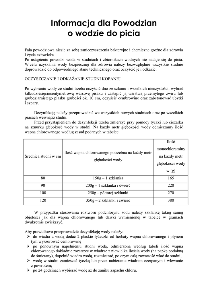 Informacja dla Powodzian o wodzie do picia Fala powodziowa niesie za sobą zanieczyszczenia bakteryjne i chemiczne groźne dla zdrowia i życia człowieka. Po ustąpieniu powodzi woda w studniach i zbiornikach wodnych nie nadaje się do picia. W celu uzyskania wody bezpiecznej dla zdrowia należy bezwzględnie wszystkie studnie doprowadzić do odpowiedniego stanu technicznego oraz oczyścić je i odkazić. OCZYSZCZANIE I ODKAŻANIE STUDNI KOPANEJ Po wybraniu wody ze studni trzeba oczyścić dno ze szlamu i wszelkich nieczystości, wybrać kilkudziesięciocentymetrową warstwę pisaku i zastąpić ją warstwą przemytego żwiru lub gruboziarnistego piasku grubości ok. 10 cm, oczyścić cembrowinę oraz zabetonować ubytki i szpary. Dezynfekcję należy przeprowadzić we wszystkich nowych studniach oraz po wszelkich pracach wewnątrz studni. Przed przystąpieniem do dezynfekcji trzeba zmierzyć przy pomocy tyczki lub ciężarka na sznurku głębokość wody w studni. Na każdy metr głębokości wody odmierzamy ilość wapna chlorowanego według zasad podanych w tabelce: Ilość Średnica studni w cm Ilość wapna chlorowanego potrzebna na każdy metr głębokości wody monochloraminy na każdy metr głębokości wody w [g] 80 150g – 1 szklanka 165 90 200g – 1 szklanka i ćwierć 220 100 250g – półtorej szklanki 270 120 350g – 2 szklanki i ćwierć 380 W przypadku stosowania roztworu podchlorynu sodu należy szklankę takiej samej objętości jak dla wapna chlorowanego lub dawki wymienionej w tabelce w gramach dwukrotnie zwiększyć. Aby prawidłowo przeprowadzić dezynfekcję wody należy: do wiadra z wodą dodać 2 płaskie łyżeczki od herbaty wapna chlorowanego i płynem tym wyszorować cembrowinę po ponownym napełnieniu studni wodą, odmierzoną według tabeli ilość wapna chlorowanego dokładnie rozetrzeć w wiadrze z niewielką ilością wody (na papkę podobną do śmietany), dopełnić wiadro wodą, rozmieszać, po czym całą zawartość wlać do studni; wodę w studni zamieszać tyczką lub przez nabieranie wiadrem czerpanym i wlewanie z powrotem; po 24 godzinach wybierać wodę aż do zaniku zapachu chloru. UWAGA: Środki odkażające należy przechowywać w suchym i ciemnym pomieszczeniu w naczyniu drewnianymi lub szklanym. ODKAŻANIE STUDZIEŃ WIERCONYCH I ABISYŃSKICH W przypadku studni wierconej wymieszanie roztworu odkażającego nastręcza duże trudności. Dlatego w wyjątkowych wypadkach odkaża się je wprowadzając roztwór za pomocą specjalnej pompy. Zazwyczaj w przypadku zanieczyszczenia studni dokładnie się ją przepłukuje przez długotrwałe pompowanie. ODKAŻANIE WEWNĘTRZNEJ CZĘŚCI POMPY ABISYŃSKIEJ Przeprowadza się w następujący sposób: 4 gramy wapna chlorowanego (1 czubata łyżeczka) albo 7 ml podchlorynu sodu ( 1 1/2 łyżeczki) rozpuścić w dwóch kubkach wody. Zdjąć kolumienkę studni, nalać do rury przygotowany roztwór, nałożyć kolumienkę, pompować aż do ukazania się wody w wylocie pompy, pozostawić na 24 godziny, następnie pompować aż do zaniku zapachu chloru w wodzie. Po wykonaniu czyszczenia i odkażania studni, woda z niej powinna być zbadana przez najbliższą stację sanitarno – epidemiologiczną, która wyda orzeczenie, czy woda może być używana do picia i potrzeb gospodarczych. ODKAŻANIE WODY Każdą niepewną wodę przeznaczoną do picia należy odkażać. Dzięki zniszczeniu bakterii, a w szczególności zarazków chorób zakaźnych przewodu pokarmowego, staje się ona bezpieczna dla zdrowia. Odkażanie wody można przeprowadzić różnymi środkami i sposobami: - najprostszym i dobrym sposobem odkażania wody jest jej gotowanie. - można również odkazić wodę za pomocą specjalnych preparatów i pastylek pod różnymi nazwami, przeprowadzić ten zabieg ściśle według przepisów załączonych do tych preparatów. Pamiętaj! Odkażanie nie usuwa zanieczyszczeń chemicznych. Duża zawartość środków chemicznych (azotanów) może wywołać u niemowląt sinice, która przy braku natychmiastowej pomocy lekarskiej bywa śmiertelna; dlatego też wszystkie kobiety ciężarne oraz niemowlęta powinny korzystać wyłącznie z wody badanej i określonej jako: „odpowiadająca wymaganiom sanitarnym”.