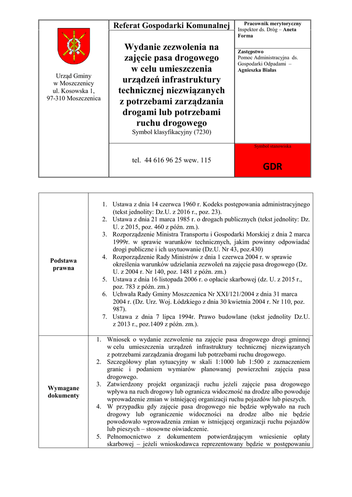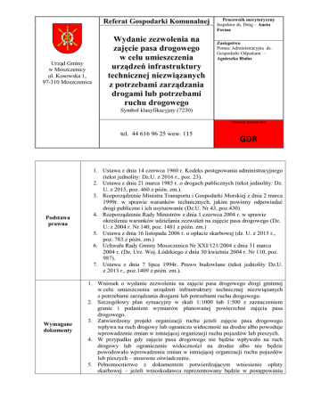 Referat Gospodarki Komunalnej Urząd Gminy w Moszczenicy ul. Kosowska 1, 97-310 Moszczenica Wydanie zezwolenia na zajęcie pasa drogowego w celu umieszczenia urządzeń infrastruktury technicznej niezwiązanych z potrzebami zarządzania drogami lub potrzebami ruchu drogowego Pracownik merytoryczny Inspektor ds. Dróg – Aneta Forma Zastępstwo Pomoc Administracyjna ds. Gospodarki Odpadami – Agnieszka Białas Symbol klasyfikacyjny (7230) Symbol stanowiska tel. 44 616 96 25 wew. 115 Podstawa prawna Wymagane dokumenty GDR 1. Ustawa z dnia 14 czerwca 1960 r. Kodeks postępowania administracyjnego (tekst jednolity: Dz.U. z 2016 r., poz. 23). 2. Ustawa z dnia 21 marca 1985 r. o drogach publicznych (tekst jednolity: Dz. U. z 2015, poz. 460 z późn. zm.). 3. Rozporządzenie Ministra Transportu i Gospodarki Morskiej z dnia 2 marca 1999r. w sprawie warunków technicznych, jakim powinny odpowiadać drogi publiczne i ich usytuowanie (Dz.U. Nr 43, poz.430) 4. Rozporządzenie Rady Ministrów z dnia 1 czerwca 2004 r. w sprawie określenia warunków udzielania zezwoleń na zajęcie pasa drogowego (Dz. U. z 2004 r. Nr 140, poz. 1481 z późn. zm.) 5. Ustawa z dnia 16 listopada 2006 r. o opłacie skarbowej (dz. U. z 2015 r., poz. 783 z późn. zm.) 6. Uchwała Rady Gminy Moszczenica Nr XXI/121/2004 z dnia 31 marca 2004 r. (Dz. Urz. Woj. Łódzkiego z dnia 30 kwietnia 2004 r. Nr 110, poz. 987). 7. Ustawa z dnia 7 lipca 1994r. Prawo budowlane (tekst jednolity Dz.U. z 2013 r., poz.1409 z późn. zm.). 1. Wniosek o wydanie zezwolenie na zajęcie pasa drogowego drogi gminnej w celu umieszczenia urządzeń infrastruktury technicznej niezwiązanych z potrzebami zarządzania drogami lub potrzebami ruchu drogowego. 2. Szczegółowy plan sytuacyjny w skali 1:1000 lub 1:500 z zaznaczeniem granic i podaniem wymiarów planowanej powierzchni zajęcia pasa drogowego. 3. Zatwierdzony projekt organizacji ruchu jeżeli zajęcie pasa drogowego wpływa na ruch drogowy lub ogranicza widoczność na drodze albo powoduje wprowadzenie zmian w istniejącej organizacji ruchu pojazdów lub pieszych. 4. W przypadku gdy zajęcie pasa drogowego nie będzie wpływało na ruch drogowy lub ograniczenie widoczności na drodze albo nie będzie powodowało wprowadzenia zmian w istniejącej organizacji ruchu pojazdów lub pieszych – stosowne oświadczenie. 5. Pełnomocnictwo z dokumentem potwierdzającym wniesienie opłaty skarbowej – jeżeli wnioskodawca reprezentowany będzie w postępowaniu przez pełnomocnika. 6. Kopię decyzji lokalizacyjnej wydanej przez zarządcę drogi. Forma załatwienia sprawy Opłaty Miejsce złożenia wniosku Termin rozpatrzenia wniosku Tryb odwoławczy Decyzja administracyjna. 1. Opłata skarbowa w przypadku dołączenia do wniosku dokumentu stwierdzającego udzielenie pełnomocnictwa lub prokury oraz jego odpisu, wypisu lub kopii – 17,00 zł od każdego stosunku pełnomocnictwa (prokury). 2. Opłata za zajęcie pasa drogowego w celu umieszczenia urządzeń infrastruktury technicznej w pasie drogowym ustala się na podstawie art. 40 ust. 5 ustawy o drogach publicznych, jako iloczyn liczby metrów kwadratowych powierzchni pasa drogowego zajętej przez rzut poziomy urządzenia, stawki opłaty za zajęcie 1m2 pasa drogowego pobieranej za każdy rok umieszczenia urządzenia i ustalonej na podstawie Uchwały Rady Gminy Moszczenica Nr XXI/121/2004 z dnia 31 marca 2004 r. W przypadku gdy urządzenie obce jest umieszczane w pasie drogowym na okres krótszy niż jeden rok opłatę pobiera się proporcjonalne do czasu zajęcia. Urząd Gminy w Moszczenicy ul. Kosowska 1, 97-310 Moszczenica Biuro Obsługi Mieszkańców Do 30 dni od dnia złożenia przez stronę kompletu wymaganych dokumentów. Do 2 miesięcy w przypadku spraw szczególnie skomplikowanych. Od wydanej decyzji administracyjnej przysługuje odwołanie do Samorządowego Kolegium Odwoławczego w Piotrkowie Trybunalskim za pośrednictwem Wójta Gminy Moszczenica w terminie 14 dni od daty otrzymania decyzji. Jednostka Referat Gospodarki Komunalnej odpowiedzialna Uwagi 1. Wniosek o wydanie zezwolenie na zajęcie pasa drogowego drogi gminnej w celu umieszczenia urządzenia infrastruktury technicznej należy złożyć z wyprzedzeniem umożliwiającym rozpatrzenie wniosku i wydanie zezwolenia przed terminem rozpoczęcia robót. 2. Ze względu na potrzeby związane z zarządzaniem drogami, wymogi wynikające z warunków technicznych dróg publicznych i bezpieczeństwa ruchu drogowego oraz istniejące warunki atmosferyczne, może nastąpić odmowa wydania zezwolenia. 3. przed faktycznym umieszczeniem urządzeń infrastruktury technicznej w pasie drogowym należy wystąpić o wydanie odrębnego zezwolenia na zajęcie pasa drogowego drogi gminnej w celu prowadzenia robót.