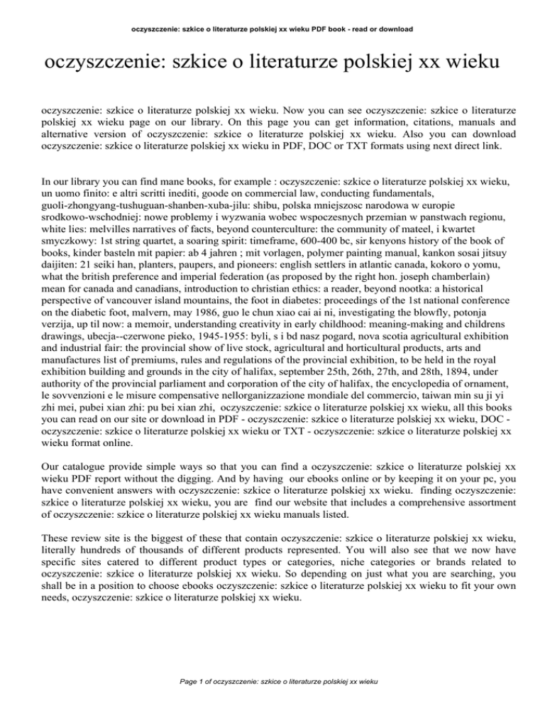oczyszczenie: szkice o literaturze polskiej xx wieku PDF book - read or download oczyszczenie: szkice o literaturze polskiej xx wieku oczyszczenie: szkice o literaturze polskiej xx wieku. Now you can see oczyszczenie: szkice o literaturze polskiej xx wieku page on our library. On this page you can get information, citations, manuals and alternative version of oczyszczenie: szkice o literaturze polskiej xx wieku. Also you can download oczyszczenie: szkice o literaturze polskiej xx wieku in PDF, DOC or TXT formats using next direct link. In our library you can find mane books, for example : oczyszczenie: szkice o literaturze polskiej xx wieku, un uomo finito: e altri scritti inediti, goode on commercial law, conducting fundamentals, guoli-zhongyang-tushuguan-shanben-xuba-jilu: shibu, polska mniejszosc narodowa w europie srodkowo-wschodniej: nowe problemy i wyzwania wobec wspoczesnych przemian w panstwach regionu, white lies: melvilles narratives of facts, beyond counterculture: the community of mateel, i kwartet smyczkowy: 1st string quartet, a soaring spirit: timeframe, 600-400 bc, sir kenyons history of the book of books, kinder basteln mit papier: ab 4 jahren ; mit vorlagen, polymer painting manual, kankon sosai jitsuy daijiten: 21 seiki han, planters, paupers, and pioneers: english settlers in atlantic canada, kokoro o yomu, what the british preference and imperial federation (as proposed by the right hon. joseph chamberlain) mean for canada and canadians, introduction to christian ethics: a reader, beyond nootka: a historical perspective of vancouver island mountains, the foot in diabetes: proceedings of the 1st national conference on the diabetic foot, malvern, may 1986, guo le chun xiao cai ai ni, investigating the blowfly, potonja verzija, up til now: a memoir, understanding creativity in early childhood: meaning-making and childrens drawings, ubecja--czerwone pieko, 1945-1955: byli, s i bd nasz pogard, nova scotia agricultural exhibition and industrial fair: the provincial show of live stock, agricultural and horticultural products, arts and manufactures list of premiums, rules and regulations of the provincial exhibition, to be held in the royal exhibition building and grounds in the city of halifax, september 25th, 26th, 27th, and 28th, 1894, under authority of the provincial parliament and corporation of the city of halifax, the encyclopedia of ornament, le sovvenzioni e le misure compensative nellorganizzazione mondiale del commercio, taiwan min su ji yi zhi mei, pubei xian zhi: pu bei xian zhi, oczyszczenie: szkice o literaturze polskiej xx wieku, all this books you can read on our site or download in PDF - oczyszczenie: szkice o literaturze polskiej xx wieku, DOC oczyszczenie: szkice o literaturze polskiej xx wieku or TXT - oczyszczenie: szkice o literaturze polskiej xx wieku format online. Our catalogue provide simple ways so that you can find a oczyszczenie: szkice o literaturze polskiej xx wieku PDF report without the digging. And by having our ebooks online or by keeping it on your pc, you have convenient answers with oczyszczenie: szkice o literaturze polskiej xx wieku. finding oczyszczenie: szkice o literaturze polskiej xx wieku, you are find our website that includes a comprehensive assortment of oczyszczenie: szkice o literaturze polskiej xx wieku manuals listed. These review site is the biggest of these that contain oczyszczenie: szkice o literaturze polskiej xx wieku, literally hundreds of thousands of different products represented. You will also see that we now have specific sites catered to different product types or categories, niche categories or brands related to oczyszczenie: szkice o literaturze polskiej xx wieku. So depending on just what you are searching, you shall be in a position to choose ebooks oczyszczenie: szkice o literaturze polskiej xx wieku to fit your own needs, oczyszczenie: szkice o literaturze polskiej xx wieku. Page 1 of oczyszczenie: szkice o literaturze polskiej xx wieku