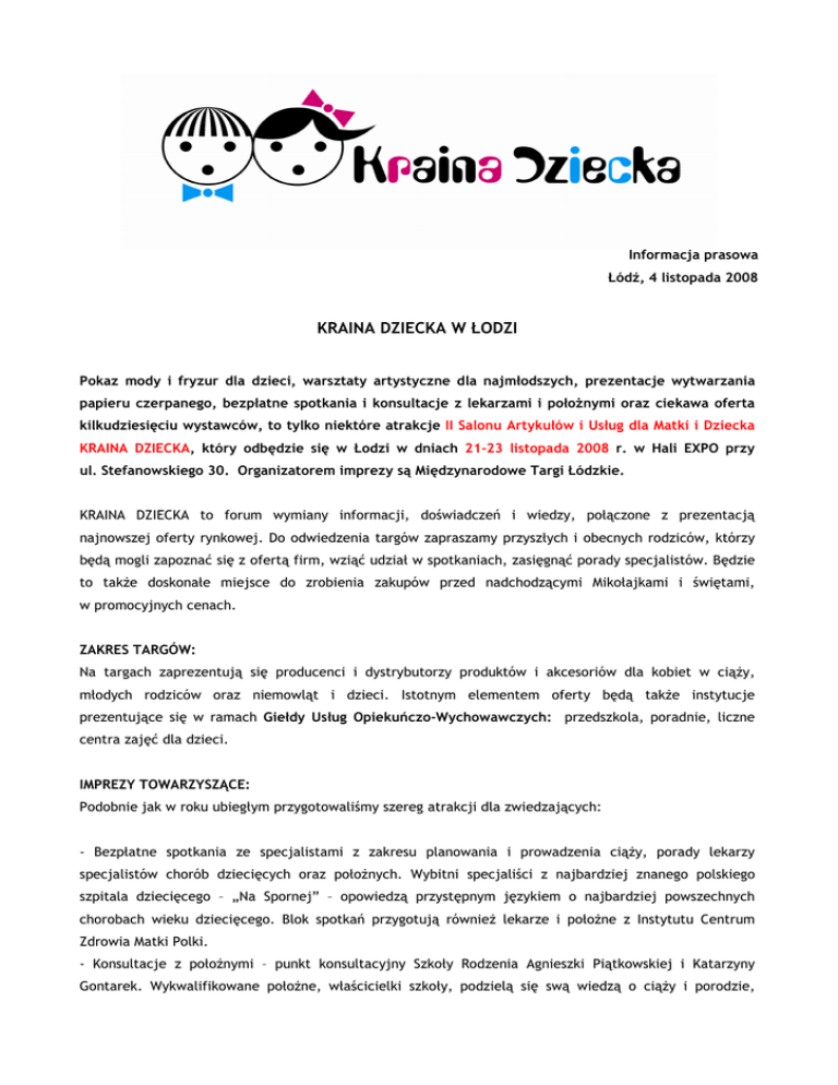 Informacja prasowa Łódź, 4 listopada 2008 KRAINA DZIECKA W ŁODZI Pokaz mody i fryzur dla dzieci, warsztaty artystyczne dla najmłodszych, prezentacje wytwarzania papieru czerpanego, bezpłatne spotkania i konsultacje z lekarzami i połoŜnymi oraz ciekawa oferta kilkudziesięciu wystawców, to tylko niektóre atrakcje II Salonu Artykułów i Usług dla Matki i Dziecka KRAINA DZIECKA, który odbędzie się w Łodzi w dniach 21-23 listopada 2008 r. w Hali EXPO przy ul. Stefanowskiego 30. Organizatorem imprezy są Międzynarodowe Targi Łódzkie. KRAINA DZIECKA to forum wymiany informacji, doświadczeń i wiedzy, połączone z prezentacją najnowszej oferty rynkowej. Do odwiedzenia targów zapraszamy przyszłych i obecnych rodziców, którzy będą mogli zapoznać się z ofertą firm, wziąć udział w spotkaniach, zasięgnąć porady specjalistów. Będzie to takŜe doskonałe miejsce do zrobienia zakupów przed nadchodzącymi Mikołajkami i świętami, w promocyjnych cenach. ZAKRES TARGÓW: Na targach zaprezentują się producenci i dystrybutorzy produktów i akcesoriów dla kobiet w ciąŜy, młodych rodziców oraz niemowląt i dzieci. Istotnym elementem oferty będą takŜe instytucje prezentujące się w ramach Giełdy Usług Opiekuńczo-Wychowawczych: przedszkola, poradnie, liczne centra zajęć dla dzieci. IMPREZY TOWARZYSZĄCE: Podobnie jak w roku ubiegłym przygotowaliśmy szereg atrakcji dla zwiedzających: - Bezpłatne spotkania ze specjalistami z zakresu planowania i prowadzenia ciąŜy, porady lekarzy specjalistów chorób dziecięcych oraz połoŜnych. Wybitni specjaliści z najbardziej znanego polskiego szpitala dziecięcego – „Na Spornej” – opowiedzą przystępnym językiem o najbardziej powszechnych chorobach wieku dziecięcego. Blok spotkań przygotują równieŜ lekarze i połoŜne z Instytutu Centrum Zdrowia Matki Polki. - Konsultacje z połoŜnymi – punkt konsultacyjny Szkoły Rodzenia Agnieszki Piątkowskiej i Katarzyny Gontarek. Wykwalifikowane połoŜne, właścicielki szkoły, podzielą się swą wiedzą o ciąŜy i porodzie, doświadczeniem osobistym i zawodowym. Powiedzą rodzicom jak przygotować się do świadomego i sprawnego porodu, a takŜe jak zająć się niemowlakiem. Szkoła zaprezentuje równieŜ ćwiczenia prowadzone w ramach zajęć. - Bezpłatne badania stóp. Firma MDH, producent obuwia profilaktyczno-korekcyjnego Memo, laureat specjalnej edycji konkursu Łódź Proponuje 2008, w ramach Programu Profilaktyki Zdrowotnej "Moda na Zdrowie" przeprowadzi 22 i 23 listopada 2008 w godzinach 11.00-14.00 bezpłatne badania stóp dzieci i młodzieŜy. Badania wykonywane będą przez specjalistów z dziedziny rehabilitacji i ortopedii. KaŜdy klient, który odwiedzi stoisko, otrzyma moŜliwość dokonania zakupów internetowych z 5% rabatem. Więcej informacji na stronie www.memoinfo.pl w zakładce Aktualności. - Wielki show - pokaz mody i fryzur dla dzieci zorganizowany przez Salon BARBARA – Krzysztof Rajca. Ubrania dziecięce uŜyczy sklep SMYK Cały dla Małych oraz marka Hot Oil. Dla wszystkich dzieci dodatkowe atrakcje – kolorowe fryzury, malowanie pasemek, malowanie twarzy. - Kobiety w ciąŜy będą mogły przekonać się na własne oczy, Ŝe ruch okresie ciąŜy to zdrowie – pokaz gimnastyki dla kobiet w ciąŜy poprowadzi Klub RYTM. - Rodzice będą mieli okazję poznać róŜnorodne formy pracy z dziećmi niepełnosprawnymi - na targach pojawią się między innymi specjaliści od dogoterapii. - Bogaty blok warsztatowy poprowadzi Pracownia Alternatywnego Wychowania z Łodzi – wszystkie dzieci będą mogły zapoznać się z techniką wytwarzania papieru czerpanego i modeliny, a takŜe skomponować własne ciastka i desery. - Fundacja ABCXXI – Cała Polska czyta dzieciom będzie propagowała wartość głośnego czytania dzieciom na warsztatach artystycznych opartych o czytaną literaturę. O zaletach czytania opowie w sobotę pani Barbara Baklińska, łódzki koordynator akcji „Cała Polska czyta dzieciom”. - Indywidualne konsultacje w zakresie odpowiedniego dobrania chust do noszenia dzieci oraz prawidłowego wiązania chust. - Prezentacja metody nauczania języka angielskiego metodą Helen Doron, przygotowana przez Centrum Helen Doron z Łodzi. - Liczne konkursy dla dzieci. - A nawet pokaz wielkich baniek mydlanych !! Na warsztaty zapraszamy zarówno grupy zorganizowane z łódzkich przedszkoli, jak i rodziców z pociechami. Dzieci do lat 10 wchodzą na targi bezpłatnie. Z co 15. biletem atrakcyjny prezent !! Do odwiedzenia Salonu zapraszamy: Bilety: 21 listopada 2008 10.00 – 18.00 5 pln – bilet normalny 22 listopada 2008 10.00 – 18.00 8 pln – bilet rodzinny (2+1, 2+2) 23 listopada 2008 10.00 – 16.00 (kasa zamykana jest pół godziny przed końcem targów) PATRONATY: Patronat Honorowy: Prezydent Miasta Łodzi. Patronaty Medialne: największy polski portal parentingowy eDziecko.pl, magazyn „Świat Zabawek” oraz „BranŜa Dziecięca”, Gazeta Wyborcza, Metro i TVP Łódź. Więcej informacji na temat targów: WWW.mtl.lodz.pl/dziecko ZAPRASZAMY. Iwona Chlewińska Specjalista ds. promocji i reklamy tel. + 48 42 638 62 85 tel. kom. 605 093 816 [email protected]