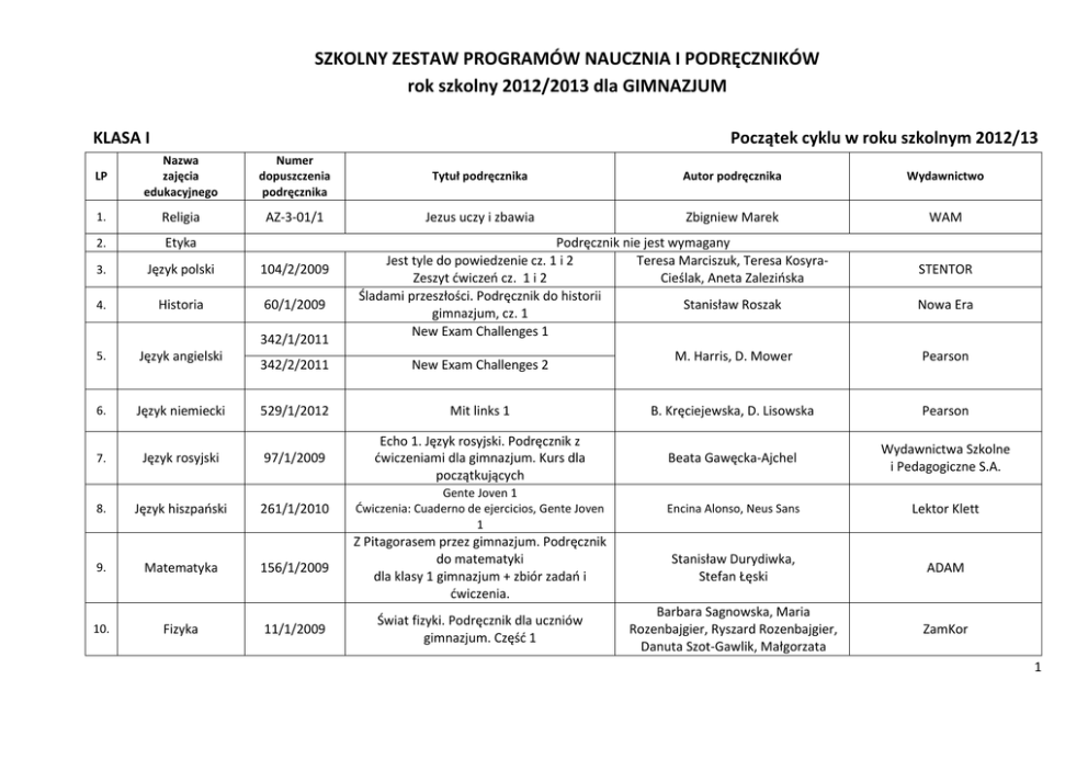 SZKOLNY ZESTAW PROGRAMÓW NAUCZNIA I PODRĘCZNIKÓW rok szkolny 2012/2013 dla GIMNAZJUM KLASA I Początek cyklu w roku szkolnym 2012/13 LP Nazwa zajęcia edukacyjnego Numer dopuszczenia podręcznika Tytuł podręcznika Autor podręcznika Wydawnictwo 1. Religia AZ-3-01/1 Jezus uczy i zbawia Zbigniew Marek WAM 2. Etyka 3. Język polski 104/2/2009 4. Historia 60/1/2009 5. Język angielski 6. 342/1/2011 Podręcznik nie jest wymagany Jest tyle do powiedzenie cz. 1 i 2 Teresa Marciszuk, Teresa KosyraZeszyt ćwiczeń cz. 1 i 2 Cieślak, Aneta Zalezińska Śladami przeszłości. Podręcznik do historii Stanisław Roszak gimnazjum, cz. 1 New Exam Challenges 1 STENTOR Nowa Era M. Harris, D. Mower Pearson Mit links 1 B. Kręciejewska, D. Lisowska Pearson 97/1/2009 Echo 1. Język rosyjski. Podręcznik z ćwiczeniami dla gimnazjum. Kurs dla początkujących Beata Gawęcka-Ajchel Wydawnictwa Szkolne i Pedagogiczne S.A. 261/1/2010 Gente Joven 1 Ćwiczenia: Cuaderno de ejercicios, Gente Joven 1 Encina Alonso, Neus Sans Lektor Klett Stanisław Durydiwka, Stefan Łęski ADAM Barbara Sagnowska, Maria Rozenbajgier, Ryszard Rozenbajgier, Danuta Szot-Gawlik, Małgorzata ZamKor 342/2/2011 New Exam Challenges 2 Język niemiecki 529/1/2012 7. Język rosyjski 8. Język hiszpański 9. Matematyka 156/1/2009 Z Pitagorasem przez gimnazjum. Podręcznik do matematyki dla klasy 1 gimnazjum + zbiór zadań i ćwiczenia. 10. Fizyka 11/1/2009 Świat fizyki. Podręcznik dla uczniów gimnazjum. Część 1 1 Godlewska 11. Chemia 49/1/2009 12. Biologia 92/1/2009 13. Geografia 183/1/2009 14. Plastyka 47/2009 15. Muzyka 81/2009 16. Zajęcia techniczne 199/2009 17. Informatyka 75/2009 18. Wychowanie fizyczne Chemia Nowej Ery. Część 1. Podręcznik dla gimnazjum + ćwiczenia cz.1 Świat biologii część 1. Podręcznik dla gimnazjum Geografia 1 Plastyka. Podręcznik dla gimnazjum Świat muzyki. Podręcznik dla gimnazjum Zajęcia techniczne. Ćwiczenia: Zajęcia papieroplastyczne. Informatyka Europejczyka. Podręcznik dla gimnazjum. Edycja: Windows Vista, Linux Ubuntu, MS Office 2007, OpenOffice.org. Wydanie II Jan Kulawik, Teresa Kulawik, Maria Litwin Nowa Era Małgorzata Kłyś, Joanna Stawarz Nowa Era Grażyna Chmielewska, Jan Świeboda OPERON Katarzyna Czernicka OPERON Wacław Panek Wydawnictwa Szkolne i Pedagogiczne S.A. Urszula Białka Ćw. Zofia Włodarczyk OPERON Jolanta Pańczyk Grupa Wydawnicza "Helion" S.A. Zgodnie z nową PODSTAWĄ PROGRAMOWĄ 2