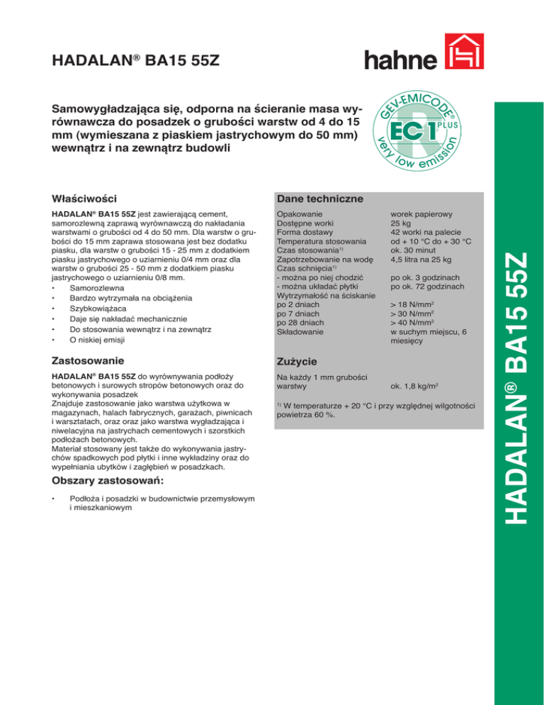 HADALAN® BA15 55Z Właściwości Dane techniczne HADALAN® BA15 55Z jest zawierającą cement, samorozlewną zaprawą wyrównawczą do nakładania warstwami o grubości od 4 do 50 mm. Dla warstw o grubości do 15 mm zaprawa stosowana jest bez dodatku piasku, dla warstw o grubości 15 - 25 mm z dodatkiem piasku jastrychowego o uziarnieniu 0/4 mm oraz dla warstw o grubości 25 - 50 mm z dodatkiem piasku jastrychowego o uziarnieniu 0/8 mm. • Samorozlewna • Bardzo wytrzymała na obciążenia • Szybkowiążaca • Daje się nakładać mechanicznie • Do stosowania wewnątrz i na zewnątrz • O niskiej emisji Opakowanie Dostępne worki Forma dostawy Temperatura stosowania Czas stosowania1) Zapotrzebowanie na wodę Czas schnięcia1) - można po niej chodzić - można układać płytki Wytrzymałość na ściskanie po 2 dniach po 7 dniach po 28 dniach Składowanie Zastosowanie Zużycie HADALAN BA15 55Z do wyrównywania podłoży betonowych i surowych stropów betonowych oraz do wykonywania posadzek Znajduje zastosowanie jako warstwa użytkowa w magazynach, halach fabrycznych, garażach, piwnicach i warsztatach, oraz oraz jako warstwa wygładzająca i niwelacyjna na jastrychach cementowych i szorstkich podłożach betonowych. Materiał stosowany jest także do wykonywania jastrychów spadkowych pod płytki i inne wykładziny oraz do wypełniania ubytków i zagłębień w posadzkach. Na każdy 1 mm grubości warstwy ® Obszary zastosowań: • Podłoża i posadzki w budownictwie przemysłowym i mieszkaniowym worek papierowy 25 kg 42 worki na palecie od + 10 °C do + 30 °C ok. 30 minut 4,5 litra na 25 kg po ok. 3 godzinach po ok. 72 godzinach > 18 N/mm2 > 30 N/mm2 > 40 N/mm2 w suchym miejscu, 6 miesięcy ok. 1,8 kg/m2 W temperaturze + 20 °C i przy względnej wilgotności powietrza 60 %. 1) HADALAN® BA15 55Z Samowygładzająca się, odporna na ścieranie masa wyrównawcza do posadzek o grubości warstw od 4 do 15 mm (wymieszana z piaskiem jastrychowym do 50 mm) wewnątrz i na zewnątrz budowli HADALAN® BA15 55Z Przygotowanie podłoża Wykonanie Podłoże musi być mocne, nośne, czyste, suche oraz wolne od pyłu i środków antyadhezyjnych, np. wosku, olejów lub tłuszczu. Spieczone warstwy, powierzchnie bitumiczne i zużyte (starte przez opony) oraz wszystkie inne nienośne podłoża należy przygotować przez frezowanie, śrutowanie, piaskowanie itp (minimalna wytrzymałość na odrywanie 1,5 N/mm2, minimal;na wytrzymałość na ściskanie 25 N/ mm2). Większe zagłębienia i dziury zamknąć zaprawą HADALAN® BM 55 HSP. Jastrychy cementowe, podłoża betonowe, podłoża o różnej chłonności, istniejące okładziny ceramiczne, stare dobrze przylegające powłoki malarskie należy wstępnie zagruntować materiałem HADALAN® EPUni 12E i na świeżo posypać piaskiem kwarcowym Quartz051 157M . Dopiero po całkowitym utwardzeniu gruntu (z reguły po 24 godzinach) może on być pokrywany masą samopoziomującą. W przypadku wystarczająco szorstkich podłoży można je gruntować materiałem VESTEROL® TG 10D. HADALAN® BA15 55Z należy nakładać na grunt podeschnięty do stopnia matowo-wilgotnego. Jastrychy anhydrytowe oraz stare okładziny płytkowe należy z zasady przeszlifować ( uziarnienie papieru szlifierskiego - 16). Podłoża gładkie, szczelne i niechłonne można gruntować środkiem HADALAN® Multigrund.Proszę przestrzegać informacji podanych w stosownej karcie technicznej. 1. HADALAN® BA15 55Z dosypywać do czystej wody w odpowiednio dobranym pojemniku intensywnie mieszając i następnie wymieszać wiertarką z mieszadłem przy 400 do 800 obr./min. do uzyskania jednorodnej zaprawy bez grudek. Zalecane proporcje mieszanki dla warstw o grubości od 4 do 15 mm: 25 kg HADALAN® BA15 55Z : 4,5 litra wody Zalecane proporcje mieszanki dla warstw o grubości od 15 do 25 mm: 2 części wagowe HADALAN® BA15 55Z : 1 część wagowa piasku jastrychowego 0/4 mm Zalecane proporcje mieszanki dla warstw o grubości od 25 do 50 mm: 1 część wagowa HADALAN® BA15 55Z : 1 część wagowa piasku jastrychowego 0/8 mm Zapotrzebowanie na wodę zarobową wynosi ok. 4,5 l na 25 kg HADALAN® BA15 55Z. Należy uwzględniać wilgotność piasku jastrychowego. Zalecane proporcje mieszanki dla warstw wyrównawczych na jastrychach spadkowych: 2. 3. 4. 5. 6. 25 kg HADALAN® BA15 55Z : 3,5 litra wody Wymieszać do uzyskania gęstej, stabilnej konsystencji. Po wymieszaniu masę należy wylać na podłoże i rozprowadzić za pomocą zębatej kielni, rakli jastrychowej lub gładkiej kielni na powierzchni warstwą o pożądanej grubości. Połączenia dwóch partii wylanej masy należy obrabiać na bieżąco. Następnie, najpóźniej po 15 minutach, należy wylaną masę odpowietrzyć za pomocą kolczastego wałka. Jeżeli HADALAN® BA15 55Z nakładany jest w 2 warstwach, wtedy drugą warstwę należy nałożyć tego samego dnia bez wcześniejszego przygotowania podłoża, w przeciwnym razie przed drugą warstwą należy wykonać gruntowanie za pomocą VESTEROL® TG 10D. Sprzęt i narzędzia czyścić wodą natychmiast po ich użyciu. Przy nakładaniu maszynowym można stosować pompy mieszające np. Putzmeister MP 20/25, Wagner T2S i PC25, PFTG4 lub G5. Produkty systemowe hahne VESTEROL® TG 10D HADALAN® EPUni 12E Quartz051 57M HADALAN® BA15 55Z Ważne wskazówki Dystrybutor • VISBUD Projekt Sp. z o.o. ul. M. Bacciarellego 8E /I 51-649 Wrocław Tel. (+48) 71 344 04 34 Fax (+48) 71 345 17 72 e-mail: [email protected] • • • • • • • • Przestrzegać temperatury stosowania w zakresie od + 10°C do + 30°C. Niskie temperatury wydłużają a wysokie skracają czas wiązania. Świeżo wylaną masę należy chronić przed bezpośrednim oddziaływaniem promieniowania słonecznego. Przy mieszaniu automatycznym mogą ulec zmianie właściwości mechaniczne HADALAN® BA15 55Z. W trakcie wykonywania prac, oprócz podanych tutaj informacji należy także przestrzegać odpowiednich norm i przep