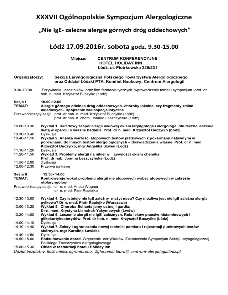 XXXVII Ogólnopolskie Sympozjum Alergologiczne „Nie IgE- zależne alergie górnych dróg oddechowych” Łódź 17.09.2016r. sobota godz. 9.30-15.00 Miejsce: Organizatorzy: 9.30-10.00 CENTRUM KONFERENCYJNE HOTEL HOLIDAY INN Łódź, ul. Piotrkowska 229/231 Sekcja Laryngologiczna Polskiego Towarzystwa Alergologicznego oraz Oddział Łódzki PTA, Komitet Naukowy: Centrum Alergologii Przywitanie uczestników oraz firm farmaceutycznych, wprowadzenie tematu sympozjum -prof. dr hab. n. med. Krzysztof Buczyłko (Łódź) Sesja I TEMAT: 10.00-12.00 Alergie górnego odcinka dróg oddechowych- choroby lokalne, czy fragmenty zmian układowych- spojrzenie wielospecjalistyczne Przewodniczący sesji: prof. dr hab. n. med. Krzysztof Buczyłko (Łódź) prof. dr hab. n. chem. Joanna Leszczyńska (Łódź) 10.00-10.30 10.30-10.40 10.40-11.10 11.10-11.20 11.20-11.50 11.50-12.00 12.00-12.30 Wykład 1. Układowy zespół alergii niklowej okiem laryngologa i alergologa. Skuteczne leczenie dietą w oparciu o własne badania. Prof. dr n. med. Krzysztof Buczyłko (Łódź) Dyskusja Wykład 2. Analiza wartości atopowych testów płatkowych z pokarmami natywnymi w porównaniu do innych testów alergologicznych – doświadczenia własne. Prof. dr n. med. Krzysztof Buczyłko, mgr Angelika Szwed (Łódź) Dyskusja Wyklad 3. Problemy alergii na nikiel w żywności okiem chemika. Prof. dr hab. Joanna Leszczyńska (Łódź) Dyskusja Przerwa na kawę Sesja II TEMAT: 12.30- 14.00 Kontrowersje wokół problemu alergii nie atopowych wobec atopowych w zakresie otolaryngologii Przewodniczący sesji: dr n. med. Aneta Wagner dr n. med. Piotr Rapiejko 12.30-13.00 13.00-13.20 13.20-14.00 14.00-14.10 14.10-14.40 14.40-14.50 14.50-15.00 15.00-15.30 Wykład 4. Czy istnieje nie IgE zależny nieżyt nosa? Czy możliwa jest nie IgE zależna alergia pyłkowa? Dr n. med. Piotr Rapiejko (Warszawa) Wykład 5. Choroba Behceta jamy ustnej i gardła. Dr n. med. Krystyna Lishchuk-Yakymowych (Lwów) Wykład 6. Leczenie alergii nie IgE zależnych. Rola leków przeciw-histaminowych i glikokortykosterydów. Prof. dr hab. n. med. Krzysztof Buczyłko (Łódź) Dyskusja Wykład 7. Zalety i ograniczenia nowej techniki pomiaru i rejestracji punktowych testów skórnych. mgr Karolina Ławicka Dyskusja Podsumowanie obrad. Wręczenie certyfikatów, Zakończenie Sympozjum Sekcji Laryngologicznej Polskiego Towarzystwa Alergologicznego Obiad w restauracji hotelu Holiday Inn Udział bezpłatny. Ilość miejsc ograniczona. Zgłoszenia biuro@ centrum-alergologii.lodz.pl
