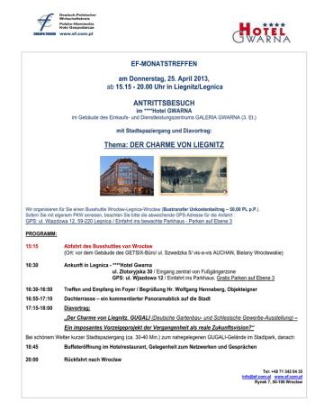 EF-MONATSTREFFEN am Donnerstag, 25. April 2013, ab 15.15 - 20.00 Uhr in Liegnitz/Legnica ANTRITTSBESUCH im ****Hotel GWARNA im Gebäude des Einkaufs- und Dienstleistungszentrums GALERIA GWARNA (3. Et.) mit Stadtspaziergang und Diavortrag: Thema: DER CHARME VON LIEGNITZ Wir organisieren für Sie einen Busshuttle Wrocław-Legnica-Wrocław (Bustransfer Unkostenbeitrag – 50,00 PL p.P.). Sofern Sie mit eigenem PKW anreisen, beachten Sie bitte die abweichende GPS-Adresse für die Anfahrt : GPS: ul. Wjazdowa 12, 59-220 Legnica / Einfahrt ins bewachte Parkhaus - Parken auf Ebene 3 PROGRAMM: 15:15 Abfahrt des Busshuttles von Wrocław (Ort: vor dem Gebäude des GETSIX-Büro/ ul. Szwedzka 5/ vis-a-vis AUCHAN, Bielany Wrocławskie) 16:30 Ankunft in Legnica - ****Hotel Gwarna ul. Złotoryjska 30 / Eingang zentral von Fußgängerzone GPS: ul. Wjazdowa 12 / Einfahrt ins Parkhaus. Gratis Parken auf Ebene 3 16:30-16:50 Treffen und Empfang im Foyer / Begrüßung Hr. Wolfgang Henneberg, Objekteigner 16:55-17:10 Dachterrasse – ein kommentierter Panoramablick auf die Stadt 17:15-18:00 Diavortrag: „Der Charme von Liegnitz. GUGALI (Deutsche Gartenbau- und Schlesische Gewerbe-Ausstellung) – Ein imposantes Vorzeigeprojekt der Vergangenheit als reale Zukunftsvision?“ Bei schönem Wetter kurzer Stadtspaziergang (ca. 30-40 Min.) zum nahegelegenen GUGALI-Gelände im Stadtpark, danach: 18:45 Buffeteröffnung im Hotelrestaurant, Gelegenheit zum Netzwerken und Gesprächen 20:00 Rückfahrt nach Wrocław Tel: +48 71 342 04 35 [email protected] www.ef.com.pl Rynek 7, 50-106 Wrocław SPOTKANIE EUROPA FORUM czwartek, 25 kwietnia 2013, w godz. 15.15 - 20.00 w Legnicy Wizyta u firmy członkowskiej ****Hotel GWARNA w Centrum Handlowo-Usługowym GALERIA GWARNA (3. piętro) oraz spacer miejski i pokaz slajdów z wykładem nt. UROK LEGNICY Organizujemy przejazd busem na trasie Wrocław-Legnica-Wrocław (koszt własny za transfer 50,00 pln/os.). Jeżeli decydujecie się Państwo na dojazd we własnym zakresie, oto adres nawigacyjny GPS: GPS: ul. Wjazdowa 12, 59-220 Legnica / wjazd na strzeżony parking kryty, poziom 3. PROGRAM: 15:15 Wyjazd busem z Wrocławia (miejsce: przed budynkiem biura firmy GETSIX / ul. Szwedzka 5/ vis-a-vis AUCHAN, Bielany Wrocławskie) 16:30 Przyjazd do Legnicy – ****Hotel Gwarna ul. Złotoryjska 30 / wejście od strony deptaku miejskiego GPS: ul. Wjazdowa 12 / wjazd na parking kryty. Parking gratis na poziomie 3 16:30-16:50 Drobny poczęstunek oraz powitanie przez właściciela obiektu p. Wolfganga Henneberga 16:55-17:10 Wyjście na taras na dachu – widok panoramiczny na miasto wraz z komentarzem 17:15-18:00 Pokaz slajdów oraz wykład: „Urok Legnicy. GUGALI (Wystawa Ogrodnictwa Niemieckiego i Przemysłu Śląskiego) – Imponujący projekt z przeszłości jako realna wizja na przyszłość?“ Jeżeli dopisze pogoda, udamy się na krótki spacer miejski do parku, gdzie mieści się obiekt GUGALI (ok. 30-40 min.), po czym: 18:45 Czas na rozmowy indywidualne przy bufecie w restauracji hotelowej 20:00 Powrót do Wrocławia Tel: +48 71 342 04 35 [email protected] www.ef.com.pl Rynek 7, 50-106 Wrocław