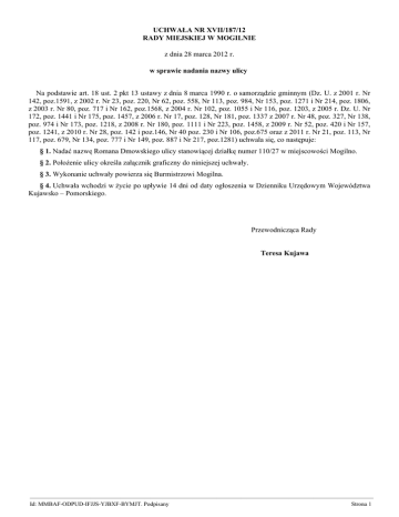 UCHWAŁA NR XVII/187/12 RADY MIEJSKIEJ W MOGILNIE z dnia 28 marca 2012 r. w sprawie nadania nazwy ulicy Na podstawie art. 18 ust. 2 pkt 13 ustawy z dnia 8 marca 1990 r. o samorządzie gminnym (Dz. U. z 2001 r. Nr 142, poz.1591, z 2002 r. Nr 23, poz. 220, Nr 62, poz. 558, Nr 113, poz. 984, Nr 153, poz. 1271 i Nr 214, poz. 1806, z 2003 r. Nr 80, poz. 717 i Nr 162, poz.1568, z 2004 r. Nr 102, poz. 1055 i Nr 116, poz. 1203, z 2005 r. Dz. U. Nr 172, poz. 1441 i Nr 175, poz. 1457, z 2006 r. Nr 17, poz. 128, Nr 181, poz. 1337 z 2007 r. Nr 48, poz. 327, Nr 138, poz. 974 i Nr 173, poz. 1218, z 2008 r. Nr 180, poz. 1111 i Nr 223, poz. 1458, z 2009 r. Nr 52, poz. 420 i Nr 157, poz. 1241, z 2010 r. Nr 28, poz. 142 i poz.146, Nr 40 poz. 230 i Nr 106, poz.675 oraz z 2011 r. Nr 21, poz. 113, Nr 117, poz. 679, Nr 134, poz. 777 i Nr 149, poz. 887 i Nr 217, poz.1281) uchwala się, co następuje: § 1. Nadać nazwę Romana Dmowskiego ulicy stanowiącej działkę numer 110/27 w miejscowości Mogilno. § 2. Położenie ulicy określa załącznik graficzny do niniejszej uchwały. § 3. Wykonanie uchwały powierza się Burmistrzowi Mogilna. § 4. Uchwała wchodzi w życie po upływie 14 dni od daty ogłoszenia w Dzienniku Urzędowym Województwa Kujawsko – Pomorskiego. Przewodnicząca Rady Teresa Kujawa ————————————————————————————————————————————————————————— Id: MMBAF-ODPUD-IFJJS-YJBXF-BYMJT. Podpisany Strona 1 Uzasadnienie DO UCHWAŁY Nr XVII/187/12 RADY MIEJSKIEJ w MOGILNIE z dnia 28 marca 2012 r. w sprawie nadania nazwy ulicy Zgodnie z miejscowym planem zagospodarowania przestrzennego w południowo – zachodniej części miasta Mogilna wyznaczone zostało nowe osiedle. W związku z powyższym zachodzi konieczność nadania nazwy ulicy powstałej w obrębie tego terenu. Burmistrz Mogilna zaproponował dla ww. ulicy nazwę Romana Dmowskiego. Roman Dmowski to polski polityk, publicysta polityczny, Ministra Spraw Zagranicznych, poseł na Sejm Ustawodawczy RP. Polski działacz niepodległościowy, postulujący zjednoczenie wszystkich ziem polskich. Wraz z I. Paderewskim podpisali traktat wersalski w 1919 roku, przywracając Polskę na mapę Europy. Pozwoliło to na uznanie Polski wraz z Wielkopolska i Pomorzem Gdańskim oraz ustanowienie Wolnego Miasta Gdańska. Postać szczególnie popularna w Wielkopolsce, a więc i na ziemi mogileńskiej, z uwagi na Jego wielką troskę o niepodległość tych ziem. Dążył do ustanowienia zachodnich granic Polski tak, by na zawsze powróciły do macierzy te tereny, na których tworzyła się kolebka państwa polskiego. Za zasługi na rzecz niepodległości oraz za przyczynienie się do rozwoju polskiej świadomości narodowej, R. Dmowski 8 stycznia 1999, w 60. rocznicę śmierci, został uczczony przez Sejm RP jako mąż stanu i wybitny Polak, specjalną uchwałą. Przedkłada się zatem projekt niniejszej uchwały. ————————————————————————————————————————————————————————— Id: MMBAF-ODPUD-IFJJS-YJBXF-BYMJT. Podpisany Strona 1 Załącznik do Uchwały Nr XVII/187/12 Rady Miejskiej w Mogilnie z dnia 28 marca 2012 r. ————————————————————————————————————————————————————————— Id: MMBAF-ODPUD-IFJJS-YJBXF-BYMJT. Podpisany Strona 1