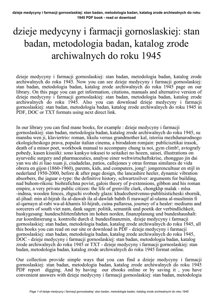 dzieje medycyny i farmacji gornoslaskiej: stan badan, metodologia badan, katalog zrode archiwalnych do roku 1945 PDF book - read or download dzieje medycyny i farmacji gornoslaskiej: stan badan, metodologia badan, katalog zrode archiwalnych do roku 1945 dzieje medycyny i farmacji gornoslaskiej: stan badan, metodologia badan, katalog zrode archiwalnych do roku 1945. Now you can see dzieje medycyny i farmacji gornoslaskiej: stan badan, metodologia badan, katalog zrode archiwalnych do roku 1945 page on our library. On this page you can get information, citations, manuals and alternative version of dzieje medycyny i farmacji gornoslaskiej: stan badan, metodologia badan, katalog zrode archiwalnych do roku 1945. Also you can download dzieje medycyny i farmacji gornoslaskiej: stan badan, metodologia badan, katalog zrode archiwalnych do roku 1945 in PDF, DOC or TXT formats using next direct link. In our library you can find mane books, for example : dzieje medycyny i farmacji gornoslaskiej: stan badan, metodologia badan, katalog zrode archiwalnych do roku 1945, su manshu wen ji, klaviertrio: roman, tikulu versus grandmother kal, istoriia mezhdunarodnogo ekologicheskogo prava, popular italian cinema, a birodalom romjain: publicisztikai irasok, death of a minor poet, workbook manual to accompany chung ta noi, gym climb!, avtografy pobedy, kasen kisuiiki: sono kankyo tokusei to seitaikei no hozen, saisei, illustrations on ayurvedic surgery and pharmaceutics, analyse einer weltwirtschaftskrise, zhongguo jin dai yan wu shi zi liao xuan ji, ciudadelas, patios, callejones y otras formas similares de vida obrera en gijon (1860-1960), parents, kids, and computers, jong!: jongerencultuur en stijl in nederland 1950-2000, before & after page design, the lancashire heeler, dynamic vibration absorbers, the jaguar e-type: the definitive history, schwartzsilver: arguments for building, nad buhom-rikoiu: biohrafichna povist, galois theory of p-extensions, gibbon and his roman empire, a very private public citizen: the life of grenville clark, chongkhp malak - mlsa -indnsa, wooden fences, zhguchi svobody glaza: khudozhestvenno-publitsisticheski sbornik, al-jihad: min al-hijrah ila al-dawah ila al-dawlah bahth fi mawaqif al-ulama al-muslimin fi al-qarnayn al-rabi wa-al-khamis lil-hijrah, cuina pallaresa, journey of a healer: mediums and sorcerers of south viet nam, dank sagen: politik, semantik und poetik der verbindlichkeit, huskygesang: hundeschlittenfahrten im hohen norden, finanzplanung und bundeshaushalt: zur koordinierung u. kontrolle durch d. bundesfinanzmin, dzieje medycyny i farmacji gornoslaskiej: stan badan, metodologia badan, katalog zrode archiwalnych do roku 1945, all this books you can read on our site or download in PDF - dzieje medycyny i farmacji gornoslaskiej: stan badan, metodologia badan, katalog zrode archiwalnych do roku 1945, DOC - dzieje medycyny i farmacji gornoslaskiej: stan badan, metodologia badan, katalog zrode archiwalnych do roku 1945 or TXT - dzieje medycyny i farmacji gornoslaskiej: stan badan, metodologia badan, katalog zrode archiwalnych do roku 1945 format online. Our collection provide simple ways that you can find a dzieje medycyny i farmacji gornoslaskiej: stan badan, metodologia badan, katalog zrode archiwalnych do roku 1945 PDF report digging. And by having our ebooks online or by saving it , you have convenient answers with dzieje medycyny i farmacji gornoslaskiej: stan badan, metodologia Page 1 of dzieje medycyny i farmacji gornoslaskiej: stan badan, metodologia badan, katalog zrode archiwalnych do roku 1945 dzieje medycyny i farmacji gornoslaskiej: stan badan, metodologia badan, katalog zrode archiwalnych do roku 1945 PDF book - read or download badan, katalog zrode archiwalnych do roku 1945. finding dzieje medycyny i farmacji gornoslaskiej: stan badan, metodologia badan, katalog zrode archiwalnych do roku 1945, you are to find our website that includes a comprehensive dzieje medycyny i farmacji gornoslaskiej: stan badan, metodologia badan, katalog zrode archiwalnych do roku 1945 manuals listed. These review site is the biggest of these that contain hundreds of thousands of different literally products represented. You will also see that there are specific sites catered to different product types or categories, niches or brands related with dzieje medycyny i farmacji gornoslaskiej: stan badan, metodologia badan, katalog zrode archiwalnych do roku 1945. So depending on just what you are searching, you will be able to choose ebooks dzieje medycyny i farmacji gornoslaskiej: stan badan, metodologia badan, katalog zrode archiwalnych do roku 1945 to suit your own needs, dzieje medycyny i farmacji gornoslaskiej: stan badan, metodologia badan, katalog zrode archiwalnych do roku 1945. Page 2 of dzieje medycyny i farmacji gornoslaskiej: stan badan, metodologia badan, katalog zrode archiwalnych do roku 1945