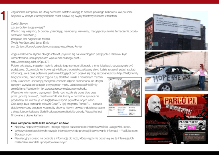 1 Zagraniczna kampania, na którą zwróciłem ostatnio uwagę to historia pewnego billboardu. Ale po kolei. Najpierw w jednym z amerykańskich miast pojawił się zwykły tekstowy billboard z tekstem: Cześć Steven, czy zwróciłam twoją uwagę? Wiem o niej wszystko, ty brudny, przebiegły, niemoralny, niewierny, małojajeczny (wolne tłumaczenie poorlyendowed slimeball:-)). Wszystko jest nagrane na taśmie. Twoja (wkrótce była) żona, Emily p.s. Za ten billboard zapłaciłam z naszego wspólnego konta. Zdjęcie billboardu szybko obiegło internet, pojawiło się na kilku blogach piszących o reklamie, było komentowane, sam popełniłem wpis o nim na blogu briefu. http://www.blog.brief.pl/?p=173 Potem była cisza, znalazłem jedynie zdjęcie tego samego billboardu z innej lokalizacji, co zaczynało być podejrzane. Oczywiście kontrowersyjny billboard odniósł oczekiwany efekt, ludzie zaczynali pytać, szukać informacji, jakiś czas potem na platformie Blogspot.com pojawił się blog zazdrosnej żony (http://thatgirlemily. blogspot.com), oraz kolejne zdjęcia z jej śledztwa i walki z niewiernym mężem. Emily ku uciesze kibiców jej poczynań umieściła zdjęcie samochodu, na którym sprayem wyraziła się co sądzi o wyczynach męża. Jakiś czas później Emily umieściła na Youtube film jak wyrzuca rzeczy męża z samochodu. Wszystkie informacje o wyczynach Emily rozchodziły się przez blog oraz przez „pocztę biurową”, często wśród ludzi, którzy w normalnej sytuacji nie przyznaliby, że interesuje ich zaglądanie w życie prywatne innych osób. Cała akcja była kampanią telewizji CourtTV i jej programu Parco P.I. – pseudodetektywistyczny program typu reality show w którym prywatny detektyw razem z ekipą i zleceniodawcą śledzi i udowadnia małżeńskie zdrady. Wszystko jest filmowane z ukrytej kamery. Cała kampania miała kilka mocnych atutów: • Najpierw niepozorny billboard, którego zdjęcie puszczone do internetu zwróciło uwagę wielu osób. • Wykorzystanie bezpłatnych narzędzi internetowych do promocji i dawkowania informacji – YouTube.com, Blogspot.com • Rewelacyjny sposób na dotarcie z informacją do ludzi, którzy nigdy nie przyznają się że interesują ich małżeńskie skandale i podpatrywanie innych.