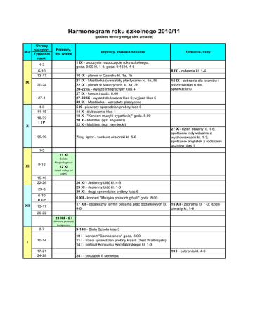 Harmonogram roku szkolnego 2010/11 (podane terminy mogą ulec zmianie) Okresy paszport. M-c Tygodnie nauki Przerwy, dni wolne Zebrania, rady 1 IX - uroczyste rozpoczęcie roku szkolnego, godz. 9.00 kl. 1-3, godz. 9.45 kl. 4-6 1-3 6-10 13-17 IX Imprezy, zadania szkolne 8 IX - zebrania kl. 1-6 16 IX - plener w Czersku kl. 1a, 1b 21 IX - Mostówka (warsztaty plastyczne) kl. 5a, 5b 22 IX - plener w Maurzycach kl. 3a, 3b 20-22 IX - wyjazd integracyjny klas 4 27 IX - koncert godz. 8.00 27-30 IX - wyjazd do Lwowa klas 6; wyjazd klas 5 30 IX - Mostówka - warsztaty plastyczne 5 X - pierwszy sprawdzian próbny klas 6 14 X - ślubowanie klas 1 18 X - "Koncert muzyki cygańskiej" godz. 8.00 20 X - Multitest (jęz. angielski) 22 X - Multitest (jęz. niemiecki) 20-24 27-1 4-8 11-15 18-22 I TP X 25-29 Złoty Jęzor - konkurs oratorski kl. 5-6 15 IX - zebranie dla uczniów i rodziców klas 6 dot. sprawdzianu 27 X - dzień otwarty kl. 1-6; spotkania indywidualne z wychowawcami kl. 1-3; spotkanie anglistek z rodzicami uczniów klas 1 1-5 11 XI Święto XI 8-12 Niepodległości 12 XI dzień wolny od zajęć 15-19 22-26 26 XI - Jesienny Liść kl. 4-6 29 XI - Jesienny Liść kl. 1-3 30 XI - drugi sprawdzian próbny klas 6 29-3 XII 6-10 II TP 6 XII - koncert "Muzyka polskich górali" godz. 8.00 13-17 17 XII - ostateczny termin oddania prac dodatkowych kl. 4-6 15 XII - zebrania kl. 1-3; dzień otwarty kl. 1-6 20-22 23 XII - 2 I zimowa przerwa świąteczna 3-7 I 10-14 17-21 24-28 9-14 I - Biała Szkoła klas 3 10 I - koncert "Samba show" godz. 8.00 11 I - trzeci sprawdzian próbny klas 6 (Test Wałbrzyski) 14 I - półfinał Konkursu Recytatorskiego kl. 1-3 19 I - zebrania kl. 4-6 24 I - początek II semestru Harmonogram roku szkolnego 2010/11 (podane terminy mogą ulec zmianie) Okresy paszport. M-c Tygodnie nauki 31-4 III TP II Przerwy, dni wolne 7-11 11 II - finał Konkursu Recytatorskiego kl. 1-3 14-27 II ferie zimowe 28-4 III Imprezy, zadania szkolne 7-11 9 II - zebrania kl. 1-3 podsumowujące I sem. i III TP 28 II-6 III - Zimowe Igrzyska Szkół Niepublicznych w Witowie 1 III - czwarty sprawdzian próbny klas 6 konkurs jęz. angielskiego "Fox" kl. 3-6 7 III - koncert "Historia Hip-Hopu" godz. 8.00 14-18 21-25 28-1 30 III - dzień otwarty kl. 1-6 4 IV - koncert "Z tańcem przez wieki" godz. 8.00 5 IV - sprawdzian po 6 klasie, godz. 9.00 9 IV - Igrzyska Matematyczne 4-8 IV TP 13 IV - spotkania indywidualne z wychowawcami kl. 1-3 11-15 IV Zebrania, rady 18-20 konkurs "Mistrz Ortografii" kl. 1-3 21-26 IV wiosenna przerwa świąteczna 27-29 2V dzień wolny od zajęć 3V Święto Konstytucji 4-6 V 9-13 16-20 23-27 30-3 V TP VI 6-10 13-17 20-22 5 V - Test Wałbrzyski kl. 3, 4, 5 9 V - koncert "Zaczarowany świat musicali" godz. 8.00 finał Konkursu Czytelniczego kl. 1-3 11 V - zebrania kl. 1-6 plenery wiosenne (okolice szkoły) 15 V - I Komunia Św. 20 V - ostateczny termin oddania prac dodatkowych kl. 46 28 V - Święto Szkoły 6 VI - koncert "W wakacyjnym nastroju" godz. 8.00 6-10 VI - Tydzień Teatru Angielskiego 10 VI - spotkanie absolwentów 13-17 VI - Zielona Szkoła kl. 1-6 22 VI - uroczyste zakończenie roku szkolnego 23 VI - 31 VIII WAKACJE!!! 8 VI - zebrania końcoworoczne kl. 1-6