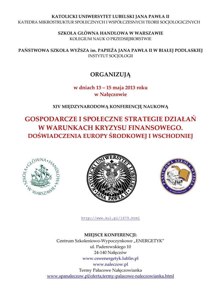 KATOLICKI UNIWERSYTET LUBELSKI JANA PAWŁA II KATEDRA MIKROSTRUKTUR SPOŁECZNYCH I WSPÓŁCZESNYCH TEORII SOCJOLOGICZNYCH SZKOŁA GŁÓWNA HANDLOWA W WARSZAWIE KOLEGIUM NAUK O PRZEDSIĘBIORSTWIE PAŃSTWOWA SZKOŁA WYŻSZA im. PAPIEŻA JANA PAWŁA II W BIAŁEJ PODLASKIEJ INSTYTUT SOCJOLOGII ORGANIZUJĄ w dniach 13 – 15 maja 2013 roku w Nałęczowie XIV MIĘDZYNARODOWĄ KONFERENCJĘ NAUKOWĄ GOSPODARCZE I SPOŁECZNE STRATEGIE DZIAŁAŃ W WARUNKACH KRYZYSU FINANSOWEGO. DOŚWIADCZENIA EUROPY ŚRODKOWEJ I WSCHODNIEJ http://www.kul.pl/1679.html MIEJSCE KONFERENCJI: Centrum Szkoleniowo-Wypoczynkowe „ENERGETYK” ul. Paderewskiego 10 24-140 Nałęczów www.cswenergetyk.lublin.pl www.naleczow.pl Termy Pałacowe Nałęczowianka www.spanaleczow.pl/oferta,termy-palacowe-naleczowianka.html TEMATYKA KONFERENCJI I. Teorie kryzysu - geneza, przebieg, teorie i scenariusze kryzysu, - gospodarcze, polityczne, społeczne i kulturowe źródła kryzysu, - katolicka nauka społeczna a kryzys, - przebieg i skutki kryzysu finansowego w państwach Europy Środkowej i Wschodniej, - państwo, instytucje regionalne, zmiana paradygmatu władzy w dobie kryzysu, - integracja europejska w Europie Środkowej i Wschodniej w dobie kryzysu, - geometria, geografia i sieciowe modele kryzysu, - cyberprzestrzeń, internet, wirtualna komunikacja a kryzys - edukacja, wiedza i informacja w dobie kryzysu, - interdyscyplinarna metodologia badań zjawisk kryzysowych, - międzynarodowe programy walki z kryzysem finansowym. II. Innowacje, przedsiębiorczość, strategie rozwoju - innowacyjność i przedsiębiorczość w dobie kryzysu, -strategie zarządzania przedsiębiorstwem w dobie kryzysu, strategie outsourcingowe i offshoringowe, - Transfer technologii, dyfuzja i zarządzanie wiedzą w czasie kryzysu, - pieniądz wirtualny, sieciowy i elektroniczny, - dynamika sektora finansowego, programy partnerskie, nowe produkty finansowe, - strategie kontroli banków i globalnych przepływów finansowych, - globalne spekulacje i spekulanci na rynkach finansowych, - przyszłość strefy EURO w regionie Europy Środkowej i Wschodniej, - polityka monetarna i fiskalna, - samoorganizacja w sieci, produkcja partnerska, - gatekeepers, korporacje transnarodowe, sieci międzyorganizacyjne w dobie kryzysu, - bezpieczeństwo działalności gospodarczej. III. Społeczna odpowiedzialność przedsiębiorstw i administracji publicznej - global governance, instytucje regionalne i lokalne a zarządzanie kryzysem, - odpowiedzialność ekonomiczna, społeczna i prawna biznesu, - odpowiedzialność etyczna, ochrona środowiska naturalnego, - kampanie społeczne, dialog obywatelski i dialog społeczny, - działalność prospołeczna w dobie kryzysu, - walka z korupcją, kryzys zaufania, - społeczna odpowiedzialność instytucji publicznej, - afery finansowe, kryzys kontroli, - odpowiedzialne inwestycje, etyka biznesu, - kryzys a kapitał społeczny, strukturalny, intelektualny i sieciowy, - zjawiska kryzysowe a rynek pracy, - zaangażowanie administracji publicznej na rzecz etycznego postępowania, - choroby cywilizacyjne, ubóstwo, wykluczenie społeczne, przestępczość, - patriotyzm i nacjonalizm gospodarczy, - kryzys wartości, instytucji i organizacji. IV. Funkcje i dysfunkcje społeczeństwa obywatelskiego - nowe formy konfliktów społecznych, nowe ruchy społeczne, - kryzys demokracji, kryzys społeczeństwa obywatelskiego, - nowe technologie a mobilizacje społeczne w dobie kryzysu, - kryzys a rewolty, rewolucje i kontrrewolucje społeczne, - idea współpracy, solidarności i subsydiarności w dobie kryzysu, - kryzys a kreatywność w kulturze, cyberkultura jako kontrkultura, - organizacje pozarządowe, instytucje publiczne w Europie Środkowej i Wschodniej, - internet jako medium rewitalizacji sfery publicznej, - zwalczanie skutków kryzysu w sieciach współpracy transgranicznej, - konflikty regionalne w dobie kryzysu, - migracje wewnętrzne oraz zewnętrzne w dobie kryzysu, -instytucje kultury w czasach kryzysu, - kryzys a etyka i moralność społeczeństw współczesnych, - zjawiska kryzysowe a dobro jednostki i wspólnoty, - zmiana zachowań konsumenckich, nowe strategie konsumpcji w czasach kryzysu, kultura zadłużenia, - instytucja rodziny w obliczu kryzysu. V. Strategie stymulujące i destymulujące rozwój rynku - nowe modele wzrostu, koniunktury i rozwoju gospodarczego, - identyfikacja barier i działań stymulujących rozwój, - nowoczesne technologie, zarządzanie innowacyjnością w przedsiębiorstwach i instytucjach publicznych, - mitologie sukcesu i stagnacji w dobie kryzysu, - rewitalizacja idei interwencjonizmu państwowego, dług publiczny i wydatki państwa w dobie kryzysu, - scenariusze integracji regionalnej w Europie Środkowej i Wschodniej, scenariusze przyszłości, - idea koopetycji w środowisku Web 2.0, - kryzys a euroregiony i regionalizm, lokalizm, glokalizacja, globalizacja, - kryzys a transgraniczna współpraca samorządowa, - kryzys a integracja europejska oraz inne formy integracji regionalnej, - Fundusze Europejskie: nowa strategia finansowania regionu Europy Środkowej i Wschodniej, - Strategia „Europa 2020” i Unia Europejska wobec kryzysu, - modele i typy partnerstwa regionalnego na czas kryzysu. KOMITET NAUKOWY – Prof. dr hab. inż. Sławomir Partycki – Przewodniczący, Katolicki Uniwersytet Lubelski Jana Pawła II, – Prof. dr hab. Roman Sobiecki – Wiceprzewodniczący ,Szkoła Główna Handlowa w Warszawie, – Prof. dr hab. Mieczysław Adamowicz – Państwowa Szkoła Wyższa im. Papieża Jana Pawła II w Białej Podlaskiej – Prof. Ramaz Abesadze - Instytut Ekonomii Paaty Guguszwili (Gruzja), – Prof. Brusilowskaja Olga- Uniwersytet Narodowy w Odessie, Ukraina, – Prof. dr hab. Jolanta Grotowska-Leder- Uniwersytet Łódzki, – Prof. dr hab. Lesław Haber – Uniwersytet Rzeszowski, – Prof. dr hab. Andrzej Herman- Szkoła Główna Handlowa w Warszawie, – Prof. Nazira Kakulia – Państwo