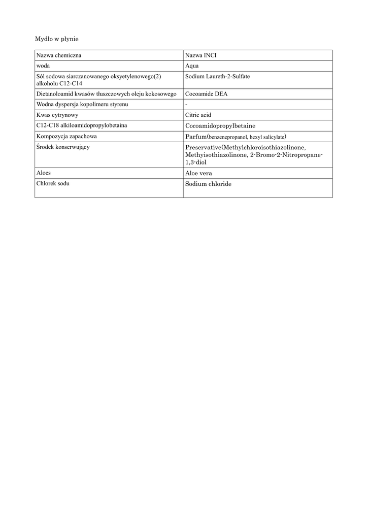 Mydło w płynie Nazwa chemiczna Nazwa INCI woda Aqua Sól sodowa siarczanowanego oksyetylenowego(2) alkoholu C12-C14 Sodium Laureth-2-Sulfate Dietanoloamid kwasów tłuszczowych oleju kokosowego Cocoamide DEA Wodna dyspersja kopolimeru styrenu - Kwas cytrynowy Citric acid C12-C18 alkiloamidopropylobetaina Cocoamidopropylbetaine Kompozycja zapachowa Parfum(benzenepropanol, hexyl salicylate) Środek konserwujący Preservative(Methylchloroisothiazolinone, Methyisothiazolinone, 2-Bromo-2-Nitropropane1,3-diol Aloes Aloe vera Chlorek sodu Sodium chloride