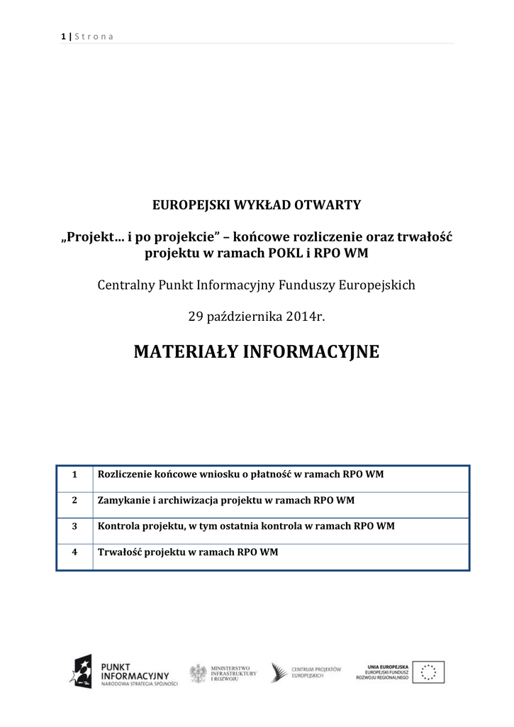 1|Strona EUROPEJSKI WYKŁAD OTWARTY „Projekt… i po projekcie” – końcowe rozliczenie oraz trwałość projektu w ramach POKL i RPO WM Centralny Punkt Informacyjny Funduszy Europejskich 29 października 2014r. MATERIAŁY INFORMACYJNE 1 Rozliczenie końcowe wniosku o płatność w ramach RPO WM 2 Zamykanie i archiwizacja projektu w ramach RPO WM 3 Kontrola projektu, w tym ostatnia kontrola w ramach RPO WM 4 Trwałość projektu w ramach RPO WM 2|Strona Rozliczenie końcowe wniosku o płatność w ramach RPO WM Zapisy dotyczące wniosku o płatność końcową zawiera umowa o dofinansowanie projektu ( § 10) Beneficjent zobowiązany jest po finansowym zakończeniu realizacji projektu do: złożenia końcowego wniosku o płatność dokonania zwrotu niewykorzystanych środków. Końcowy wniosek o płatność składany jest w terminie 60 dni kalendarzowych od dnia finansowego zakończenia realizacji projektu. W przypadku, gdy realizacja projektu została zakończona do dnia podpisania umowy o dofinansowanie, należy złożyć ostatni wniosek w terminie 60 dni od podpisania umowy o dofinansowanie. Beneficjent zobowiązany jest do rozliczenia 100% otrzymanego dofinansowania w końcowym wniosku o płatność Jeśli MJWPU stwierdzi w trakcie weryfikacji faktycznej wartości płatności, że wartość płatności jest niższa niż wynikająca z umowy, dokona korekty. Jeśli natomiast zostanie stwierdzone, że beneficjent wykorzystał dofinansowanie w sposób nieprawidłowy, tzn.: niezgodnie z przeznaczeniem, z naruszeniem obowiązujących procedur, lub pobrał całość lub część dofinansowania w sposób nienależny albo w nadmiernej wysokości wówczas jest zobowiązany do zwrotu tej kwoty wraz z odsetkami jak dla zaległości podatkowych, liczonymi od dnia przekazania środków w terminie 14 dni od doręczenia wezwania. Od decyzji o zwrocie środków beneficjent ma prawo odwołania lub złożenia wniosku o ponowne rozpatrzenie sprawy. Płatność końcowa jest przekazywana beneficjentowi, gdy MJWPU zatwierdzi wniosek o płatność, a także: 1) przeprowadzi wizytę monitorującą lub kontrolę na miejscu realizacji Projektu, lub kontrolę na dokumentach prawidłowości realizacji zamówień publicznych; 2) przeprowadzeni kontrolę doraźną Projektu – o ile zaistnieją przesłanki jej przeprowadzenia; 3|Strona 3) przeprowadzi kontrolę na zakończenia realizacji Projektu na wszystkich dokumentach złożonych przez Beneficjenta w ramach realizowanego Projektu; 4) potwierdzeni prawidłową realizację Projektu i usunięcie ewentualnych nieprawidłowości. Zamykanie i archiwizacja projektu w ramach RPO WM Przez zakończenie realizacji projektu należy rozumieć datę, w której zakończono rzeczową i finansową realizację projektu Definicja zakończenia projektu znajduje się w umowie o dofinansowanie: Zakończeniu finansowym realizacji Projektu” – należy przez to rozumieć datę zrealizowania pełnego zakresu finansowego projektu, co oznacza zrealizowanie przez Beneficjenta wszystkich płatności w ramach Projektu, tj. poniesienie wszystkich wydatków i pozyskanie dokumentów stanowiących podstawę uznania wydatków za kwalifikujące się do objęcia wsparciem w ramach Projektu; „Zakończeniu rzeczowym realizacji Projektu” – należy przez to rozumieć datę: a) wykonania pełnego zakresu rzeczowego Projektu zgodnie z Umową oraz Harmonogramem rzeczowo-finansowym, co oznacza zrealizowanie wszystkich zadań/etapów realizacji Projektu, b) udokumentowania wykonania robót, dostaw i usług protokołami odbioru, c) udokumentowania wykonania robót, dostaw i usług fakturami i/lub dokumentami o równoważnej wartości dowodowej, d) udokumentowania wykonania robót, dostaw i usług innymi dokumentami potwierdzającymi zgodność realizacji Projektu z warunkami Umowy, wymienionymi w treści Umowy w części dotyczącej warunków wypłaty dofinansowania, e) podpisania przez Beneficjenta ostatniego protokołu odbioru, świadectwa wykonania lub innego dokumentu równoważnego w ramach Projektu potwierdzającego wykonanie prac/odbioru towaru; „Zakończeniu realizacji Projektu” – należy przez to rozumieć datę spełnienia łącznie trzech warunków, tj.: zaplanowane w ramach Projektu czynności zostały faktycznie wykonane (żadna dalsza czynność nie jest wymagana), wszystkie wydatki zostały zapłacone przez Beneficjenta (Beneficjent nie będzie ponosił już żadnych płatności), dofinansowanie zostało wypłacone Beneficjentowi (na rzecz Beneficjenta nie będą przekazywane już żadne płatności ze strony BGK i MJWPU); Dokumentacja podlegająca archiwizacji 4|Strona Przykładowe zestawienie dokumentów projektu, które należy zarchiwizować: a/ dokumentacja ogólna Projektu/ Programu: - oryginał umowy o dofinansowanie, w przypadku dokonywania zmian w umowie – oryginały wszystkich zawartych aneksów, - studia wykonalności, dokumentacja oceny dokumentacja projektowa, pozwolenie na budowę, oddziaływania na środowisko, - kopie wniosków o płatność wraz z załącznikami potwierdzone za zgodność z oryginałem, - oryginał informacji pokontrolnej z kontroli przeprowadzonej przez Instytucję Pośredniczącą oraz ewentualne zastrzeżenia, zalecenia do informacji pokontrolnej wraz z dokumentacją potwierdzającą wykonanie zaleceń i usunięcie stwierdzonych nieprawidłowości, oryginały korespondencji dotyczącej Projektu/Programu. b/ dokumentacja finansowo – księgowa Projektu/ Programu: - wydruki operacji gospodarczych z księgi rachunkowej dotyczące realizowanego Projektu/ Programu, - oryginały dokumentów potwierdzających poniesienie kosztów (faktury, rachunki, paragony, listy płac, deklaracje ZUS, US, polecenia księgowania PK, potwierdzenie przelewu/wpłata gotówki, wyciągi z rachunku bankowego itp.) - wydruki z rejestrów VAT oraz deklaracje VAT za okres realizacji Projektu/Programu oraz w okresie 5 lat od jego zakończenia ( jeżeli VAT stanowi 
