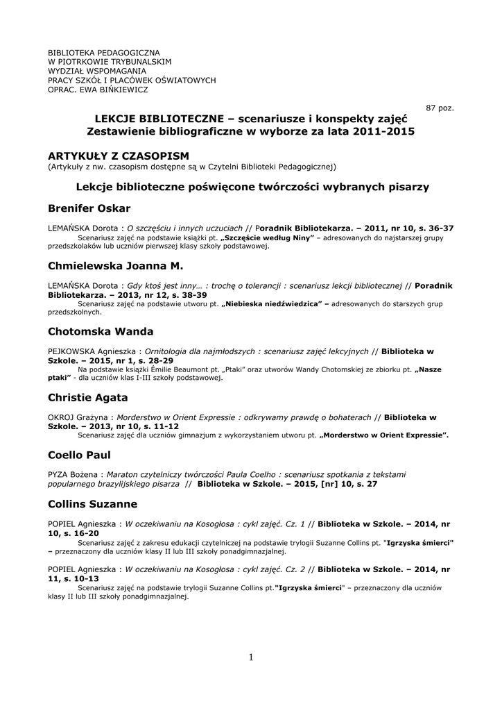 BIBLIOTEKA PEDAGOGICZNA W PIOTRKOWIE TRYBUNALSKIM WYDZIAŁ WSPOMAGANIA PRACY SZKÓŁ I PLACÓWEK OŚWIATOWYCH OPRAC. EWA BIŃKIEWICZ LEKCJE BIBLIOTECZNE – scenariusze i konspekty zajęć Zestawienie bibliograficzne w wyborze za lata 2011-2015 87 poz. ARTYKUŁY Z CZASOPISM (Artykuły z nw. czasopism dostępne są w Czytelni Biblioteki Pedagogicznej) Lekcje biblioteczne poświęcone twórczości wybranych pisarzy Brenifer Oskar LEMAŃSKA Dorota : O szczęściu i innych uczuciach // Poradnik Bibliotekarza. – 2011, nr 10, s. 36-37 Scenariusz zajęć na podstawie książki pt. „Szczęście według Niny” – adresowanych do najstarszej grupy przedszkolaków lub uczniów pierwszej klasy szkoły podstawowej. Chmielewska Joanna M. LEMAŃSKA Dorota : Gdy ktoś jest inny… : trochę o tolerancji : scenariusz lekcji bibliotecznej // Poradnik Bibliotekarza. – 2013, nr 12, s. 38-39 Scenariusz zajęć na podstawie utworu pt. „Niebieska niedźwiedzica” – adresowanych do starszych grup przedszkolnych. Chotomska Wanda PEJKOWSKA Agnieszka : Ornitologia dla najmłodszych : scenariusz zajęć lekcyjnych // Biblioteka w Szkole. – 2015, nr 1, s. 28-29 Na podstawie książki Émilie Beaumont pt. „Ptaki” oraz utworów Wandy Chotomskiej ze zbiorku pt. „Nasze ptaki” - dla uczniów klas I-III szkoły podstawowej. Christie Agata OKROJ Grażyna : Morderstwo w Orient Expressie : odkrywamy prawdę o bohaterach // Biblioteka w Szkole. – 2013, nr 10, s. 11-12 Scenariusz zajęć dla uczniów gimnazjum z wykorzystaniem utworu pt. „Morderstwo w Orient Expressie”. Coello Paul PYZA Bożena : Maraton czytelniczy twórczości Paula Coelho : scenariusz spotkania z tekstami popularnego brazylijskiego pisarza // Biblioteka w Szkole. – 2015, [nr] 10, s. 27 Collins Suzanne POPIEL Agnieszka : W oczekiwaniu na Kosogłosa : cykl zajęć. Cz. 1 // Biblioteka w Szkole. – 2014, nr 10, s. 16-20 Scenariusz zajęć z zakresu edukacji czytelniczej na podstawie trylogii Suzanne Collins pt. "Igrzyska śmierci" – przeznaczony dla uczniów klasy II lub III szkoły ponadgimnazjalnej. POPIEL Agnieszka : W oczekiwaniu na Kosogłosa : cykl zajęć. Cz. 2 // Biblioteka w Szkole. – 2014, nr 11, s. 10-13 Scenariusz zajęć na podstawie trylogii Suzanne Collins pt."Igrzyska śmierci" – przeznaczony dla uczniów klasy II lub III szkoły ponadgimnazjalnej. 1 POPIEL Agnieszka : W oczekiwaniu na Kosogłosa : cykl zajęć. Cz. 3 // Biblioteka w Szkole. – 2014, nr 12, s. 18-21 Ostatnia część cyklu zajęć na podstawie trylogii Suzanne Collins pt. "Igrzyska śmierci"- przeznaczonych dla uczniów klasy II lub III szkoły ponadgimnazjalnej. Goethe Johann Wolfgang von GŁÓWKA Alicja, ZIĘBA Aleksandra : „Król Olch” Goethego źródłem inspiracji kultury : scenariusz interdyscyplinarnej lekcji bibliotecznej : zajęcia z wykorzystaniem multimedialnych pomocy dydaktycznych : [dla uczniów gimnazjum] // Biblioteka w Szkole. – 2015, nr 2, s. 12-13 Green John PIETRUSEWICZ Anna : Patrząc na ciemność lub śmierć : scenariusz lekcji bibliotecznej : [dla uczniów szkoły ponadgimnazjalnej] // Biblioteka w Szkole. – 2015 ,nr 7/8, s. 32-33 Na podstawie popularnej wśród młodzieży książki pt. „Gwiazd naszych wina” . Jansson Tove MYTKO Marta : W Dolinie Muminków : scenariusz w szkole podstawowej // Polonistyka. - 2015, nr 2, s. 30-33 Jaworczakowa Mira JOHN Katarzyna : Bardziej rozumieć siebie : o trudnym dojrzewaniu : zajęcia kółka czytelniczego dla uczniów klasy VI szkoły podstawowej : na podstawie książki Miry Jaworczakowej „Oto jest Kasia” // Biblioteka w Szkole. – 2015, [nr] 10, s. 21 Kasdepke Grzegorz BŹDZIUCH Justyna : Zabawa z powiedzeniami , czyli jak zrozumieć świat” – zajęcia biblioteczne dla dzieci w wieku 6-12 lat // Poradnik Bibliotekarza. – 2012, nr 6, s. 45-46 Scenariusz zajęć z wykorzystaniem książki pt. „Co to znaczy...”. Co to znaczy... czyli 101 zabawnych historyjek, które pozwolą zrozumieć znaczenie niektórych powiedzeń NIEDŹWIEDZKA Renata, WIŚNIOWSKA Agnieszka : Matematyka nie jest nudna : scenariusz zajęć czytelniczych // Biblioteka w Szkole. – 2015, nr 1, s. 27 Scenariusz zajęć na podstawie książki pt. "Do trzech odlicz" - przeznaczony dla uczniów klas I-III szkoły podstawowej. Konopnicka Maria JOHN Katarzyna : Pomiędzy snem a jawą : scenariusz zajęć bibliotecznych dla uczniów klasy II // Biblioteka w Szkole. – 2015, nr 4, s. 28-29 Na podstawie utworu „Na jagody”. Korczak Janusz JANIK Beata : Życie i twórczość Janusza Korczaka : scenariusz zajęć // Biblioteka w Szkole. – 2014, nr 12, s. 24-25 Scenariusz zajęć dla uczniów klas V i VI szkoły podstawowej oraz I gimnazjum - na podstawie trzech powieści: Dżek, Król Maciuś Pierwszy oraz Kajtuś Czarodziej i my. LEMAŃSKA Dorota : Z Januszem Korczakiem w lepszy świat : scenariusz lekcji bibliotecznej : [dla sześciolatków] // Poradnik Bibliotekarza. – 2012, nr 11, s. 34-36 SIEMASZKO Martyna : O Januszu Korczaku z dziećmi : zajęcia biblioteczne : [dla uczniów nauczania początkowego] // Poradnik Bibliotekarza. – 2013. nr 5, s. 37-39 2 Lewis Clive Staples JANIK Beata : Lew, czarownica i stara szafa : popularyzacja powieści C. S. Lewisa // Biblioteka w Szkole. – 2013, nr 11, s. 15-16 Scenariusz zajęć, których głównym celem jest wykorzystanie dzieła literackiego jako podstawy do nauki i zabawy. Pawlikowska Beata OLEJARZ Agnieszka : Rozmowy na nie całkiem łatwe tematy : cykl zajęć dla młodzieży// Biblioteka w Szkole. – 2013, nr 6, s. 16-19 Zajęcia inspirowane treścią książki pt. "Teoria bezwzględności, czyli jak uniknąć końca świata" przeznaczone do realizacji podczas godzin wychowawczych, spotkań bibliotecznych lub klubu dyskusyjnego. Słowacki Juliusz GRZĄBA Joanna : „Polubić Słowackiego „ : scenariusz lekcji bibliotecznej dla klas 6 szkół podstawowych // Poradnik Bibliotekarza. – 2015, nr 2, s. 38-39 Stanecka Zofia Magic