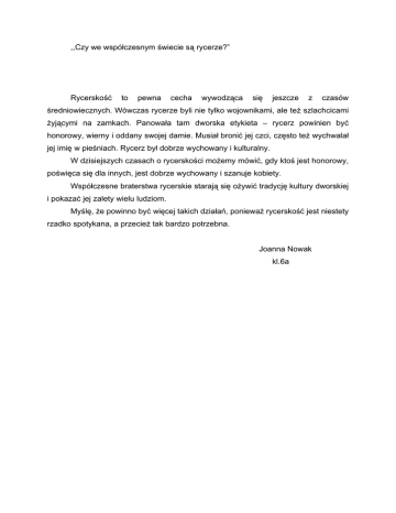 ,,Czy we współczesnym świecie są rycerze?” Rycerskość to pewna cecha wywodząca się jeszcze z czasów średniowiecznych. Wówczas rycerze byli nie tylko wojownikami, ale też szlachcicami żyjącymi na zamkach. Panowała tam dworska etykieta – rycerz powinien być honorowy, wierny i oddany swojej damie. Musiał bronić jej czci, często też wychwalał jej imię w pieśniach. Rycerz był dobrze wychowany i kulturalny. W dzisiejszych czasach o rycerskości możemy mówić, gdy ktoś jest honorowy, poświęca się dla innych, jest dobrze wychowany i szanuje kobiety. Współczesne braterstwa rycerskie starają się ożywić tradycję kultury dworskiej i pokazać jej zalety wielu ludziom. Myślę, że powinno być więcej takich działań, ponieważ rycerskość jest niestety rzadko spotykana, a przecież tak bardzo potrzebna. Joanna Nowak kl.6a