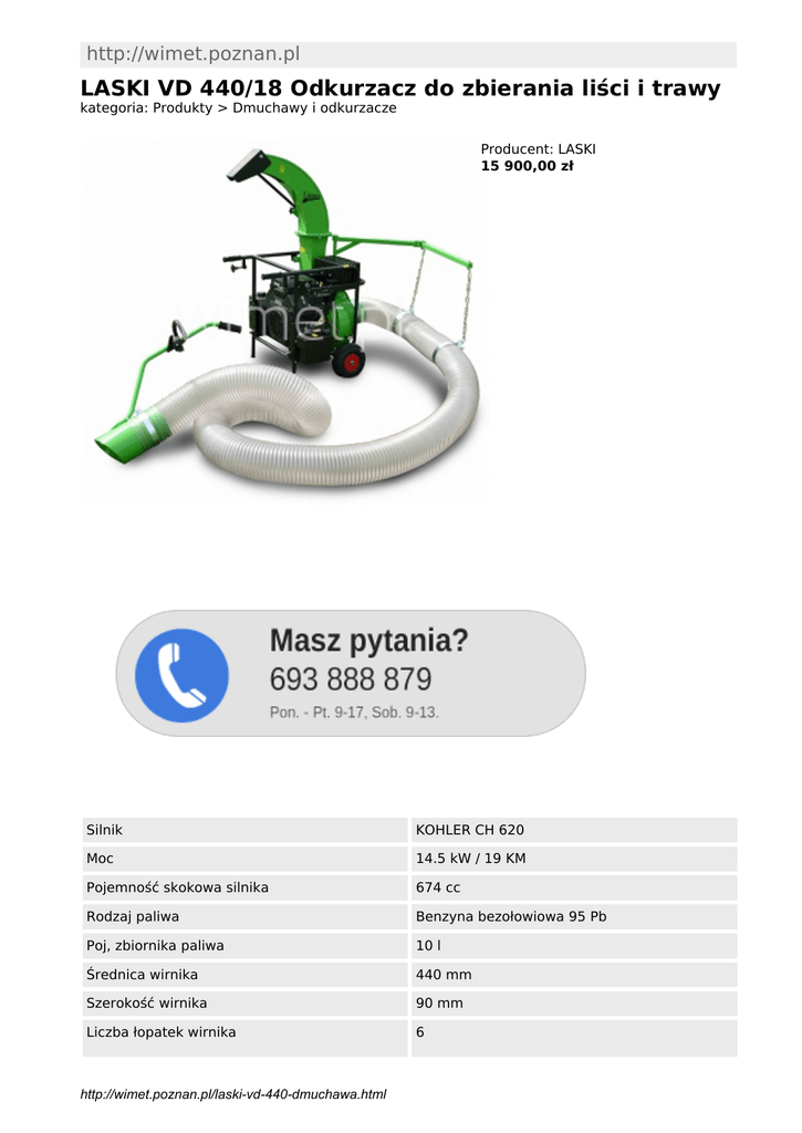 http://wimet.poznan.pl LASKI VD 440/18 Odkurzacz do zbierania liści i trawy kategoria: Produkty > Dmuchawy i odkurzacze Producent: LASKI 15 900,00 zł Silnik KOHLER CH 620 Moc 14.5 kW / 19 KM Pojemność skokowa silnika 674 cc Rodzaj paliwa Benzyna bezołowiowa 95 Pb Poj, zbiornika paliwa 10 l Średnica wirnika 440 mm Szerokość wirnika 90 mm Liczba łopatek wirnika 6 http://wimet.poznan.pl/laski-vd-440-dmuchawa.html Wydajność 80 m3.min. Długość rury ssącej 6m Średnica rury ssącej 180 mm Wymiary (dł. x szer. / wys.) 950 x 795 x 1470 mm Waga 152 kg http://wimet.poznan.pl/laski-vd-440-dmuchawa.html