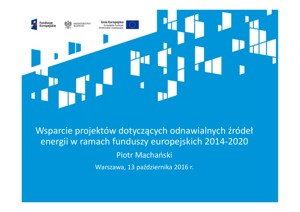 Wsparcie projektów dotyczących odnawialnych źródeł energii w ramach funduszy europejskich 2014‐2020 Piotr Machański Warszawa, 13 października 2016 r. Alokacja Funduszy Europejskich dla Polski Z budżetu polityki spójności na lata 2014-2020 Polska otrzymała 82,5 mld euro, z czego prawie 77 mld euro jest dostępne na inwestycje w ramach 22 programów operacyjnych. Podział alokacji z Polityki Spójności na programy operacyjne 2014 ‐ 2020 w mln euro 31 276,9 Regionalne Programy Pomoc Techniczna 700,1 Polska Wschodnia 2 000,0 Polska Cyfrowa 2 172,5 Wiedza Edukacja Rozwój Inteligentny Rozwój Infrastruktura i Środowisko 4 689,3 8 613,9 27 413,7 W przyjętych na perspektywę 2014-2020 celach tematycznych został określony cel tematyczny 4 Wspieranie przejścia na gospodarkę niskoemisyjną we wszystkich sektorach, w ramach którego wsparcie będzie skierowane m.in. na sektor OZE. Na CT4 została przeznaczona kwota ponad 9 mld euro. Jednym z głównych miejsc koncentracji środków dostępnych dla OZE będzie Program Operacyjny Infrastruktura i Środowisko 2014-2020. Ponadto, projekty w obszarze OZE będą również wdrażane poprzez regionalne programy operacyjne. Łączne dofinansowanie ze środków UE wyniesie ok. 1,2 mld euro. PI 4a(i) Wspieranie wytwarzania i dystrybucji energii pochodzącej ze źródeł odnawialnych Przykłady projektów kwalifikujących się do wsparcia: wytwarzanie energii pochodzącej ze źródeł odnawialnych wraz z podłączeniem do sieci dystrybucyjnej/przesyłowej (en. wodna, wiatru, słoneczna, geotermalna, biogazu, biomasy), budowa oraz przebudowa sieci umożliwiających przyłączanie jednostek wytwarzania energii elektrycznej ze źródeł odnawialnych do Krajowego Systemu Elektroenergetycznego (projekty realizowane przez operatorów systemu dystrybucyjnego i przesyłowego), budowa instalacji do produkcji biokomponentów i biopaliw (jedynie w wybranych RPO). Alokacja POIiŚ 300 mln euro Alokacja 16 RPO: 897 mln euro Cel: Zwiększenie poziomu produkcji energii ze źródeł odnawialnych oraz rozwój sieci OZE Planuje się, że energetyka prosumencka będzie wspierana w ramach RPO, natomiast w ramach POIiŚ będą wspierane projekty o większej mocy wytwórczej (o znaczeniu ponad regionalnym – demarkacja w oparciu o moc instalowanej jednostki). Podział kraj/region (poniżej wartości ‐ RPO, powyżej ‐ POIiŚ) en. wodna (5 MWe) en. wiatru (5 MWe) en. słoneczna (2 MWe/MWth) en. geotermalna (2 MWth) en. biogazu (1 MWe) en. biomasy (5 MWth/MWe) Dodatkowo, wsparcie OZE będzie możliwe w ograniczonym zakresie również w ramach priorytetów inwestycyjnych: 4b/4ii Promowanie efektywności energetycznej i wykorzystania OZE przez przedsiębiorstwa, gdzie wsparcie będzie skierowane głównie na budowę własnych instalacji OZE, które będą stanowiły integralną część systemu produkcji czy funkcjonowania przedsiębiorstwa; 4c/iii Wspieranie efektywności energetycznej i wykorzystywania odnawialnych źródeł energii w sektorze publicznym i mieszkaniowym, gdzie wsparcie skierowane będzie głównie na kompleksową modernizację energetyczną budynków użyteczności publicznej i budynków mieszkalnych (instalacje OZE w termomodernizowanych budynkach); 4e/v Promowanie strategii niskoemisyjnych dla wszystkich rodzajów terytoriów, w szczególności dla obszarów miejskich, w tym wspieranie zrównoważonej multimodalnej mobilności miejskiej i działań adaptacyjnych mających oddziaływanie łagodzące na zmiany klimatu – możliwe wsparcie dla OZE w ramach projektów dotyczących sieci ciepłowniczych. 4g/4vi Promowanie wysokosprawnej kogeneracji energii cieplnej i elektrycznej w oparciu o popyt na użytkową energię cieplną, gdzie wsparcie będzie skierowane na projekty polegające na budowie lub rozbudowie jednostek wytwarzania energii elektrycznej i ciepła w technologii wysokosprawnej kogeneracji, również z wykorzystaniem OZE. Kwoty wsparcia dla poszczególnych OZE w PI 4i/4a* Pozostałe 10% Energia elektryczna (magazynowanie i przesył) 21% Energia elektryczna (sieci TEN‐E – magazynowanie i przesył) 4% Energia odnawialna: z biomasy 22% Energia odnawialna: wiatrowa 14% Energia odnawialna: słoneczna 29% *na podstawie kwot przypisanych do kodów kategorii interwencji wskazanych w programach operacyjnych. Najważniejsze zasady wdrażania projektów OZE: Kryterium opłacalności, czyli najlepszego stosunku wielkości środków unijnych przeznaczonych na uzyskanie 1 MWh energii lub 1 MW mocy zainstalowanej wynikających z budowy danej instalacji. Kryterium ekologiczne (wielkość redukcji CO2). Szczegółowe kryteria dla niektórych OZE w zakresie wymagań środowiskowych i technologicznych. Preferencje dla instrumentów finansowych. Brak kolizji z obszarami Natura 2000 i szlakami migracyjnymi zwierząt. W zakresie pomocy publicznej dla odnawialnych źródeł energii nastąpiły pewne zmiany wynikające z treści nowych europejskich podstaw prawnych na perspektywę UE 2014‐2020. W sektorze energetycznym (w tym w OZE) nie będzie już możliwości wykorzystywania regionalnej pomocy inwestycyjnej. Dziękuję za uwagę