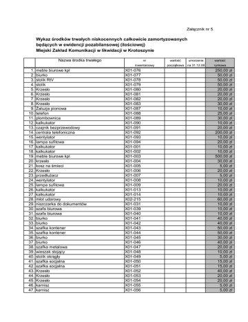 Załącznik nr 5 Wykaz środków trwałych niskocennych całkowicie zamortyzowanych będących w ewidencji pozabilansowej (ilościowej) Miejski Zakład Komunikacji w likwidacji w Krotoszynie Nazwa środka trwałego 1. 2. 3. 4. 5. 6. 7. 8. 9. 10. 11. 12. 13. 14. 15. 16. 17. 18. 19. 20. 21. 22. 23. 24. 25. 26. 27. 28. 29. 30. 31. 32. 33. 34. 35. 36. 37. 38. 39. 40. 41. 42. 43. 44. 45. 46. 47. meble biurowe kpl biurko stolik RtV stolik Krzesło Krzesło Krzesło Krzesło Żaluzja pionowa telefon plombownica kalkukator czajnik bezprzewodowy centrala telefoniczna wentylator lampa sufitowa kalkukator kalkukator meble biurowe kpl krzesło kosz na śmieci Krzesło przedłużacz wentylator lampa sufitowa kalkukator kalkukator młot udarowy niszczarka do dokumentów szafa biurowa szafa biurowa biurko biurko szafka kontener szafka kontener biurko biurko szafka metalowa wieszak stojący stolik okrągły szafka socjalna szafka socjalna Krzesło Krzesło Krzesło karnisz karnisz nr wartość umorzenie wartość inwentarzowy początkowa na 31.12.08 rynkowa X01-076 X01-077 X01-078 X01-079 X01-080 X01-081 X01-082 X01-083 X01-087 X01-088 X01-089 X01-090 X01-091 X01-092 X01-093 X01-094 X01-001 X01-002 X01-003 X01-004 X01-005 X01-006 X01-007 X01-008 X01-009 X01-013 X01-014 X02-215 X01-031 X01-039 X01-040 X01-041 X01-042 X01-043 X01-044 X01-045 X01-046 X01-047 X01-048 X01-049 X01-050 X01-051 X01-052 X01-053 X01-054 X01-055 X01-056 250,00 zł 50,00 zł 50,00 zł 50,00 zł 20,00 zł 20,00 zł 20,00 zł 30,00 zł 10,00 zł 25,00 zł 30,00 zł 10,00 zł 20,00 zł 200,00 zł 10,00 zł 20,00 zł 10,00 zł 10,00 zł 500,00 zł 30,00 zł 5,00 zł 20,00 zł 5,00 zł 10,00 zł 20,00 zł 10,00 zł 10,00 zł 60,00 zł 10,00 zł 10,00 zł 10,00 zł 40,00 zł 40,00 zł 50,00 zł 50,00 zł 30,00 zł 40,00 zł 20,00 zł 10,00 zł 5,00 zł 15,00 zł 15,00 zł 40,00 zł 20,00 zł 20,00 zł 5,00 zł 5,00 zł 48. 49. 50. 51. 52. 53. 54. 55. 56. 57. 58. 59. 60. 61. 62. 63. 64. 65. 66. 67. 68. 69. 70. 71. 72. 73. 74. 75. 76. 77. 78. 79. 80. 81. 82. 83. 84. 85. 86. 87. 88. 89. 90. 91. 92. 93. 94. 95. 96. 97. 98. 99. 100. 101. 102. 103. firany kosz na śmieci kosz na śmieci kasetka metalowa przedłużacz lampa sufitowa lampa sufitowa lampa sufitowa lampa sufitowa wentylator tablica informacyjna farelka kalkukator maszyna do pisania tester do pieniędzy telefax gaśnica gaśnica biurko meble biurowe kpl stolik RtV Krzesło Krzesło lampa sufitowa lampa stojąca kosz na śmieci karnisz firany kalkukator telefon czajnik bezprzewodowy laminarka przedłużacz gaśnica mapa Polski na ścianę plan Krotoszyna na ścianę wentylator roleta szafka Krzesło szafka biurko szafka karnisz firany tablica informacyjna zegar ścienny lampa stojąca lampa sufitowa przedłużacz roleta odkurzacz szafka bhp szafka bhp szafka bhp szafka bhp X01-057 X01-058 X01-059 X01-060 X01-061 X01-062 X01-063 X01-064 X01-065 X01-066 X01-067 X01-068 X01-069 X01-071 X01-072 X01-073 X01-074 X01-075 X01-096 X01-097 X01-098 X01-099 X01-100 X01-101 X01-102 X01-103 X01-104 X01-105 X01-106 X01-108 X01-109 X01-110 X01-112 X01-113 X01-114 X01-115 X01-116 X01-117 X01-118 X01-119 X01-120 X01-121 X01-122 X01-123 X01-124 X01-125 X01-126 X01-127 X01-128 X01-129 X01-130 X04-164 X05-040 X05-041 X05-042 X05-043 30,00 zł 3,00 zł 2,00 zł 30,00 zł 5,00 zł 10,00 zł 10,00 zł 10,00 zł 10,00 zł 10,00 zł 10,00 zł 10,00 zł 10,00 zł 100,00 zł 10,00 zł 100,00 zł 30,00 zł 60,00 zł 100,00 zł 100,00 zł 50,00 zł 20,00 zł 50,00 zł 10,00 zł 10,00 zł 3,00 zł 10,00 zł 10,00 zł 10,00 zł 25,00 zł 10,00 zł 100,00 zł 5,00 zł 30,00 zł 10,00 zł 10,00 zł 15,00 zł 10,00 zł 30,00 zł 20,00 zł 20,00 zł 40,00 zł 40,00 zł 10,00 zł 10,00 zł 10,00 zł 10,00 zł 5,00 zł 10,00 zł 5,00 zł 10,00 zł 100,00 zł 250,00 zł 250,00 zł 250,00 zł 250,00 zł 104. 105. 106. 107. 108. 109. 110. 111. 112. 113. 114. 115. 116. 117. 118. 119. 120. 121. 122. 123. 124. 125. 126. 127. 128. 129. 130. 131. 132. 133. 134. 135. 136. 137. 138. 139. 140. 141. 142. 143. 144. 145. 146. 147. 148. 149. 150. 151. 152. 153. 154. 155. 156. 157. 158. 159. szafka do kart drogowych piecyk gazowy 4 palnikowy butla gazowa kosz na śmieci ogrzewacz przepływowy lampa sufitowa lampa sufitowa lampa sufitowa wentylator szafka szafka stolik zegar ścienny wieszak stojący tablica informacyjna stół stół stół Krzesło Krzesło Krzesło Krzesło Krzesło Krzesło Krzesło Krzesło Krzesło Krzesło Krzesło Krzesło Krzesło Krzesło Krzesło Krzesło Krzesło Krzesło Krzesło Krzesło regały metalowe szt.23 biurko stolik Krzesło szafa dwudrzwiowa szafa dwudrzwiowa szafa czterodrzwiowa drabina aluminiowa lampy sufitowe szt.7 kalkukator bibioteczka suwmiarka tablica informacyjna wentylator pompa ręczna pompa ręczna szafa biurowa szafa biurowa X05-052 X05-053 X05-054 X05-055 X05-056 X05-057 X05-058 X05-059 X05-060 X05-061 X05-062 X05-063 X05-064 X05-065 X05-067 X05-068 X05-069 X05-070 X05-071 X05-072 X05-073 X05-074 X05-075 X05-076 X05-077 X05-078 X05-079 X05-080 X05-081 X05-082 X05-083 X05-084 X05-085 X05-086 X05-087 X05-088 X05-089 X05-090 X06-001 X06-002 X06-003 X06-004 X06-005 X06-006 X06-007 X06-009 X06-010 X06-011 X06-012 X06-016 X06-017 X06-018 X06-019 X06-020 X01-010 X01-011 40,00 zł 50,00 zł 20,00 zł 5,00 zł 20,00 zł 20,00 zł 20,00 zł 20,00 zł 22,00 zł 20,00 zł 20,00 zł 10,00 zł 10,00 zł 20,00 zł 5,00 zł 50,00 zł 50,00 zł 50,00 zł 10,00 zł 10,00 zł 10,00 zł 10,00 zł 10,00 zł 10,00 zł 10,00 zł 10,00 zł 10,00 zł 10,00 zł 10,00 zł 10,00 zł 10,00 zł 10,00 zł 10,00 zł 10,00 zł 10,00 zł 10,00 zł 10,00 zł 10,00 zł 115,00 zł 20,00 zł 10,00 zł 50,00 zł 10,00 zł 10,00 zł 50,00 zł 20,00 zł 70,00 zł 10,00 zł 10,00 zł 10,00 zł 5,00 zł 15,00 zł 10,00 zł 10,00 zł 20,00 zł 20,00 zł 160. 161. 162. 163. 164. 165. 166. 167. 168. 169. 170. 171. 172. 173. 174. 175. 176. 177. 178. 179. 180. 181. 182. 183. 184. 185. 186. 187. 188. 189. 190. 191. 192. 193. 194. 