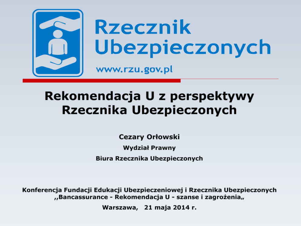 Rekomendacja U z perspektywy Rzecznika Ubezpieczonych Cezary Orłowski Wydział Prawny Biura Rzecznika Ubezpieczonych Konferencja Fundacji Edukacji Ubezpieczeniowej i Rzecznika Ubezpieczonych ,,Bancassurance - Rekomendacja U - szanse i zagrożenia„ Warszawa, 21 maja 2014 r. Rekomendacja U 13.XII.2007 r. Raport Rzecznika Ubezpieczonych, pt: Podstawowe problemy bancassurance w Polsce. 30.XI.2012 r. Aneks do raportu Rzecznika Ubezpieczonych z 2007 r. 7.XII.2012 r. Raport Rzecznika Ubezpieczonych dotyczący ubezpieczeń na życie z ufk. 27.XII.2013 r. Projekt Rekomendacji U Główne założenia projektu Rekomendacji U:        Poprawa sytuacji konsumenta w bancassurance, Rozdzielenie funkcji ubezpieczającego i pośrednika ubezpieczeniowego, Wyeliminowanie braku możliwości bezpośredniego dochodzenia roszczeń przez ubezpieczonych lub ich spadkobierców, Istotny nacisk na „politykę informacyjną” banków, „Ucywilizowanie” prowizji, legalizacja zwrotu kosztów, Poszanowanie prawa konsumenta do swobodnego wyboru ubezpieczenia i ubezpieczyciela, Realna (posprzedażowa) opieka banków nad klientem. 3 Rekomendacja U Konsument w centrum uwagi.  Informowanie  Monitoring i analiza  Działanie INFORMOWANIE  Rzetelność polityki informacyjnej związanej z charakterem, treścią i celem umowy (Rekomendacje 9, 12, 13, 15),  Informowanie o rzeczywistej roli banku w procesie zawierania umowy ubezpieczenia (Rekomendacja 19),  Doręczenie warunków umowy ubezpieczenia i prezentacja materiałów informacyjnych, karta produktu (Rekomendacje 9, 15),  Informowanie o ryzyku związanym z ubezpieczeniami finansowymi (Rekomendacja 16). MONITORING I ANALIZA  Obserwacja procesów związanych z zawarciem, obsługą, wykonaniem umowy ubezpieczenia (Rekomendacje: 1.5, 6.2, 11, 20, 21, 22),  Analiza skarg i reklamacji (Rekomendacje: 6 i 11.3),  Analiza zakresu ochrony ubezpieczeniowej i wyłączeń w celu zapewnienia efektywnego zabezpieczenia kredytu (Rekomendacje: 1.7, 4.1, 11.1, 11.8),  Analiza orzecznictwa, treści umów pod kątem niedozwolonych postanowień umownych oraz zgodności z prawem (Rekomendacja 11.2, 20.1 i 20.2). DZIAŁANIE  Opracowanie procedur dla każdego z etapów obsługi ubezpieczeniowej (Rekomendacje: 1, 5),  aktywne działanie na rzecz uzyskania świadczenia z umowy ubezpieczenia (Rekomendacja 11),  Identyfikowanie czynników ryzyka, działania niezgodnego z przepisami prawa (Rekomendacja 22). Pozytywne strony Rekomendacji U:  Rekomendacja 7 Bank powinien prowadzić działalność w warunkach, które nie powodują wystąpienia konfliktu interesów (w szczególności jednoczesnego, faktycznego występowania jako ubezpieczającego i pośrednika ubezpieczeniowego). - Zakaz łączenia ról, - Zakaz prowizji w ubezpieczeniu grupowym (Rekomendacja 17). Pozytywne strony c.d.  Rekomendacja 10 Bank powinien umożliwić klientowi samodzielne dochodzenie roszczenia w sytuacji, kiedy bank jest podmiotem uprawnionym do dochodzenia wypłaty świadczenia od zakładu ubezpieczeń i podejmie decyzję o nieskorzystaniu z tego uprawnienia.  Rekomendacja 11 W przypadku, gdy klient ma status ubezpieczonego, a bank jest ubezpieczającym, bank powinien podejmować działania w interesie klienta lub jego spadkobierców. Poszanowanie prawa wyboru klienta  Rekomendacja 12 Bank powinien zapewnić klientowi możliwość wyboru produktu ubezpieczeniowego.  Rekomendacja 13 Bank powinien zapewnić swobodę wyboru przez klienta zakładu ubezpieczeń, z którego usług zamierza skorzystać.  Rekomendacja 14 Bank nie powinien ograniczać możliwości zawarcia przez klienta indywidualnej umowy ubezpieczenia w celu zabezpieczenia kredytu. Bank nie może narzucać wymogu przystąpienia przez klienta do umowy ubezpieczenia grupowego, w którym bank występuje jako ubezpieczający. Negatywne strony Rekomendacji U: - Termin wdrożenia Rekomendacji, - Potrzeba doprecyzowania i uszczegółowienia, w szczególności w aspekcie opłat likwidacyjnych i prowizji (wynagrodzenie w odpowiedniej proporcji do poniesionych kosztów). - brak wytycznych dotyczących kredytowania opłaty ubezpieczeniowej lub składki ubezpieczeniowej, - brak rekomendacji związanej z opóźnieniem czasowym zawarcia umowy ubezpieczenia bądź przystąpienia do niej. Dziękuję za uwagę. www.rzu.gov.pl