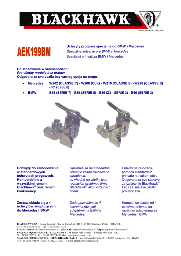 CLAMPS-PL-SK-HR, Mktg 05/05 Uchwyty progowe specjalne do BMW i Mercedes Špeciálne kotvenie pre BMW a Mercedes Specijalni prihvati za BMW i Mercedes Do stosowania w samochodach: Pre všetky modely bez prahov Odgovara za sva vozila bez varnog spoja na pragu: Mercedes: W202 (CLASSE C) - W208 (CLK) - W210 (CLASSE E) - W220 (CLASSE S) - R170 (SLK) BMW: E38 (SERIE 7) - E39 (SERIE 5) - E36 (Z3 - SERIE 3) - E46 (SERIE 3) Uchwyty do zamocowania w standardowych uchwytach progowych. Kompatybilne z wszystkimi ramami Blackhawk® oraz ramami konkurencji. Upevňuje sa na štandartné kotvenie vášho rovnacieho zariadenia. Je vhodné na všetky typy rovnacích systémov firmy Blackhawk® ako i ostatných firiem. Prihvati se prič vršć uju pomoć u standardnih prihvata na vašem stolu. Odgovara za sve sustave za izvlač enje Blackhawk ® kao i za sustave ostalih proizvođač a. Zestaw skł ada sięz 4 uchwytów adoptujących do Mercedes i BMW. Sada pozostáva zo 4 kotvéní s rôznymi adaptérmi na BMW a Mercedes. Komplet se sastoji od 4 osnovna prihvata sa različitim adapterima za Mercedes i BMW. BLACKHAWK SA – Centre Eurofret – Rue du Rheinfeld – BP 5 – 67026 Strasbourg Cedex – FRANCE Tel : +33 3 88 65 76 30 – Fax : +33 3 88 65 76 31 E-mails : France : d [email protected] – DE/A/CH : [email protected] ; Export : [email protected] SNAP-ON EQUIPMENT UK - BLACKHAWK – 48 Sutton Park Avenue – Reading RG1 1AZ - UK Tel: 01303 270273 – Fax: 01303 270274 – E-Mail: [email protected] SNAP-ON EQUIPMENT SRL – BLACKHAWK ITALIA – Via Provinciale Carpi 33 – I-42015 Correggio – RE - ITALY Tel: +39 0522 733620 – Fax: +39 0522 733621 – E-Mail: [email protected] Uchwyty progowe specjalne do Renault Megane II Špeciálne kotvenie na Renault Megane II Specijalni prihvati za Renault Megane II Uchwyty kompatybilne z wszystkimi ramami Blackhawk ® oraz większościąram konkurencji. ® Je vhodné na všetky typy rovnacích systémov firmy Blackhawk ako i ostatných firiem. ® Mogu se koristiti na svim sustavima za izvlačenje Blackhawk kao i na sustavima ostalih proizvođača. Uchwyty progowe specjalne do Nissan Micra, Renault Modus Špeciálne kotvenie na Nissan Micra, Renault Modus Specijalni prihvati za Nissan Micra, Renault Modus Uchwyty kompatybilne z wszystkimi ramami Blackhawk® oraz większościąram konkurencji. ® Je vhodné na všetky typy rovnacích systémov firmy Blackhawk ako i ostatných firiem. ® Mogu se koristiti na svim sustavima za izvlačenje Blackhawk kao i na sustavima ostalih proizvođača.