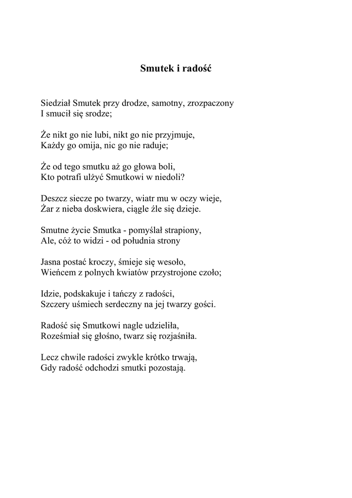 Smutek i radość Siedział Smutek przy drodze, samotny, zrozpaczony I smucił się srodze; Że nikt go nie lubi, nikt go nie przyjmuje, Każdy go omija, nic go nie raduje; Że od tego smutku aż go głowa boli, Kto potrafi ulżyć Smutkowi w niedoli? Deszcz siecze po twarzy, wiatr mu w oczy wieje, Żar z nieba doskwiera, ciągle źle się dzieje. Smutne życie Smutka - pomyślał strapiony, Ale, cóż to widzi - od południa strony Jasna postać kroczy, śmieje się wesoło, Wieńcem z polnych kwiatów przystrojone czoło; Idzie, podskakuje i tańczy z radości, Szczery uśmiech serdeczny na jej twarzy gości. Radość się Smutkowi nagle udzieliła, Roześmiał się głośno, twarz się rozjaśniła. Lecz chwile radości zwykle krótko trwają, Gdy radość odchodzi smutki pozostają.