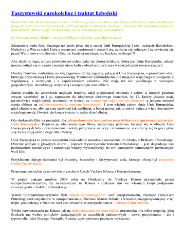 Faszystowski eurokołchoz i traktat lizboński Świat dzieli się na trzy kategorie ludzi: nieliczną grupę tych, którzy powodują wydarzenia; nieco liczniejsza grupę tych ,którzy czuwają nad ich przebiegiem i uczestniczą w realizacji; wreszcie zdecydowana większość pozostałych , którzy nigdy nie dowiedzą się co, tak naprawdę się wydarzyło” Dr Nicholas Murry Butler- założyciel Pilgrims Society, szef British Izrael Zastanawia mnie fakt, dlaczego tak mało pisze się o samej Unii Europejskiej i tzw. traktacie lizbońskim. Niektórzy z Was przyjęli Unię z otwartymi ramionami i cieszyli się, że świat się jednoczy i że otwierają się przed Wami nowe możliwości. Otóż nic bardziej mylnego, nic bardziej mylnego!!! Aby dojść do tego, co jest prawdziwym celem całej tej chorej struktury, którą jest Unia Europejska, należy mocno cofnąć się w czasie i poznać nieco kulisy obrad unijnych oraz wydarzeń temu towarzyszących. Drodzy Państwo, zostaliśmy na siłę zagonieni do tej zagrody, jaką jest Unia Europejska, a prawdziwe idee, które jej przyświecają i które przyświecają Traktatowi Lizbońskiemu, nie mają nic wspólnego z postępem, z współpracą, z rozwojem i z zapobieżeniem ubóstwu. Nie mają też nic wspólnego z rozwojem gospodarczym, demokracją, wolnością i wzajemnym szacunkiem. Zanim przejdę do omawiania unijnych brudów, całej podejrzanej struktury i celów, o których pisałam zresztą wcześniej tu i tu, zapraszam do obejrzenia ciekawego materiału, by Ci, którzy jeszcze mają jakiekolwiek wątpliwości, zrozumieli w końcu, że komunizm nigdy się nie skończył, a jedynie zmienił swoje oblicze na ogólnoświatowy komunizm faszystowski. I tym właśnie celom służy Unia Europejska, gdyż chodzi o to, aby ten stan utrzymać jak najdłużej, a bodaj nawet, jak to mówi jeden z wielu dewiantów socjologicznych, Owsiak, do końca świata i o jeden dzień dłużej. Oto doskonały film na początek, dla zdemaskowania tego potwornego dyktatorskiego tworu, jakim jest Unia Europejska. Dopiero po obejrzeniu tego filmu, zrozumieją państwo, toczące się w obrębie Unii Europejskiej debaty i przemówienia i wtedy przejrzycie na oczy i zrozumiecie, o co toczy się ta gra i jakie siły za nią stoją oraz o czyje dba interesy. Unia Europejska to przede wszystkim zniewolenie narodów i narzucenie im władzy z Brukseli i Strasburga. Obecnie jednym z głównych celów – poprzez wykorzystanie traktatu lizbońskiego – jest degradacja roli parlamentów narodowych i narodowej władzy wykonawczej, do roli zarządców samorządów posłusznych woli Unii. Przykładem takiego działania był brutalny, bezczelny i faszystowski atak, którego ofiarą był prezydent Czech Vaclav Klaus. Proponuję posłuchać przemówień prezydenta Czech Vaclava Klausa z Europarlamenu: W piątek piątego grudnia 2008 roku na Hradczany do Vaclava Klausa przyjechała grupa europarlamentarzystów, by nawrzeszczeć na Klausa i rozkazać mu we własnym kraju podpisanie eurocyrografu – traktatu lizbońskiego. Wśród Europarlamentarzystów była trójka eurochuliganów: szef europarlamentu, Niemiec Hans-Gert Pöttering; szef socjalistów w europarlamencie, Niemiec Martin Schulz; i wreszcie, najagresywniejszy z tej trójki, pochodzący z Niemiec szef eko-lewaków w europarlamencie – Daniel Cohn-Bendit. Trójka nawrzeszczała na Klausa jak na nieposłusznego im niewolnika, prezentując nie tylko pogardę, jaką Bruksela ma wobec polityków zasiadających na szczeblach państwowych – nawet prezydentów – ale i typowe dla ludzi Nowego Porządku Świata, wywindowane poczucie wyższości. Na wstępie Cohn-Bendit, przyniósł Klausowi flagę UE, którą ten odmówił powiesić przy swoim pałacu prezydenckim. A następnie ekolewak Cohn-Bendit stwierdził, co myśli na temat traktatu lizbońskiego: „Pana pogląd mnie nie interesuje, chcę wiedzieć, co pan zrobi, aby zatwierdził go czeski sejm i senat. Będzie Pan respektował demokratyczną wolę przedstawicieli narodu? „Będzie Pan musiał to podpisać.” – wrzeszczał wtedy za błogosławieństwem i wolą Pötteringa i Schulza. Oto, co Vaclav Klaus na to odpowiedział: „Muszę powiedzieć, że tym tonem nikt jeszcze ze mną tutaj nie mówił przez sześć lat mojej prezydentury. Nie jest pan tutaj na paryskich barykadach. Sądziłem, że taki styl komunikacji wobec nas skończył się 19 lat temu. Widzę, że się myliłem. Ja bym sobie nie pozwolił pytać pana, z czego jest finansowana działalność Zielonych. Jeśli zależy panu na racjonalnej dyskusji przez te pół godziny, które mamy na negocjacje, proszę, panie przewodniczący, oddać słowo dalszym osobom.” Niestety „pan przewodniczący” nie posłuchał Klausa i chciał, by Cohn-Bendit dalej cedził bzdury: „Nie, my mamy dosyć czasu. Mój kolega będzie kontynuował, ponieważ każdy z członków będzie pytał pana, o co tylko chce. (Do Cohn-Bendita) Proszę kontynuować.” Po dalszych atakach na swoją osobę, Klaus powiedział: „Nie przypuszczałem, że coś takiego jest możliwe, i w ciągu ostatnich 19 lat nic podobnego nie przeżyłem. Myślałem, że to należy już do przeszłości, że żyjemy w demokracji, ale w UE doprawdy działa postdemokracja. Mówili państwo o wartościach europejskich. Wartością europejską jest przede wszystkim wolność i demokracja, zwłaszcza poszanowanie dla obywateli państw członkowskich UE. To jest dziś w UE szczególnie istotne. Trzeba tego bronić i starać się o to.” Kim jest Cohn-Bendit? Otóż Cohn-Bendit jest podejrzewanym o alkoholizm jednym z czołowych ludzi Nowego Światowego Porządku w Europie. Jakże trafne nazwisko ma ten nieszczęśnik Bendit, czyżby lepiej nie pasowało Bandit? Na temat jego chamskiego zachowania wobec Klausa, wypowiedział się również czeski eurodeputowany Vladimír Železný. „Protektor Czech i Moraw Reinhard Heydrich mówił takim tonem do czeskie