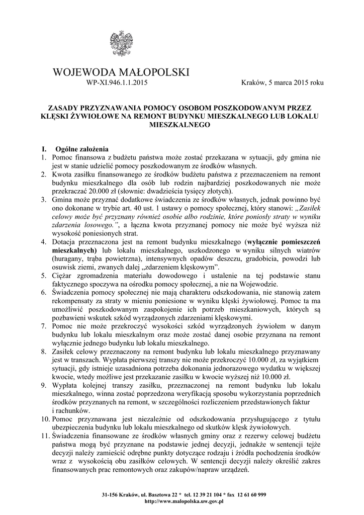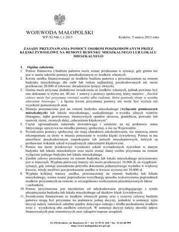 WOJEWODA MAŁOPOLSKI WP-XI.946.1.1.2015 Kraków, 5 marca 2015 roku ZASADY PRZYZNAWANIA POMOCY OSOBOM POSZKODOWANYM PRZEZ KLĘSKI ŻYWIOŁOWE NA REMONT BUDYNKU MIESZKALNEGO LUB LOKALU MIESZKALNEGO I. Ogólne założenia 1. Pomoc finansowa z budżetu państwa może zostać przekazana w sytuacji, gdy gmina nie jest w stanie udzielić pomocy poszkodowanym ze środków własnych. 2. Kwota zasiłku finansowanego ze środków budżetu państwa z przeznaczeniem na remont budynku mieszkalnego dla osób lub rodzin najbardziej poszkodowanych nie może przekraczać 20.000 zł (słownie: dwadzieścia tysięcy złotych). 3. Gmina może przyznać dodatkowe świadczenia ze środków własnych, jednak powinno być ono dokonane w trybie art. 40 ust. 1 ustawy o pomocy społecznej, który stanowi: „Zasiłek celowy może być przyznany również osobie albo rodzinie, które poniosły straty w wyniku zdarzenia losowego.”, a łączna kwota przyznanej pomocy nie może być wyższa niż wysokość poniesionych strat. 4. Dotacja przeznaczona jest na remont budynku mieszkalnego (wyłącznie pomieszczeń mieszkalnych) lub lokalu mieszkalnego, uszkodzonego w wyniku silnych wiatrów (huragany, trąba powietrzna), intensywnych opadów deszczu, gradobicia, powodzi lub osuwisk ziemi, zwanych dalej „zdarzeniem klęskowym”. 5. Ciężar zgromadzenia materiału dowodowego i ustalenie na tej podstawie stanu faktycznego spoczywa na ośrodku pomocy społecznej, a nie na Wojewodzie. 6. Świadczenia pomocy społecznej nie mają charakteru odszkodowania, nie stanowią zatem rekompensaty za straty w mieniu poniesione w wyniku klęski żywiołowej. Pomoc ta ma umożliwić poszkodowanym zaspokojenie ich potrzeb mieszkaniowych, których są pozbawieni wskutek szkód wyrządzonych zdarzeniami klęskowymi. 7. Pomoc nie może przekroczyć wysokości szkód wyrządzonych żywiołem w danym budynku lub lokalu mieszkalnym oraz może zostać danej osobie przyznana na remont wyłącznie jednego budynku lub lokalu mieszkalnego. 8. Zasiłek celowy przeznaczony na remont budynku lub lokalu mieszkalnego przyznawany jest w transzach. Wypłata pierwszej transzy nie może przekroczyć 10.000 zł, za wyjątkiem sytuacji, gdy istnieje uzasadniona potrzeba dokonania jednorazowego wydatku w większej kwocie, wtedy możliwe jest przekazanie zasiłku w kwocie wyższej niż 10.000 zł. 9. Wypłata kolejnej transzy zasiłku, przeznaczonej na remont budynku lub lokalu mieszkalnego, winna zostać poprzedzona weryfikacją sposobu wykorzystania poprzednich środków przyznanych na remont, w szczególności rozliczeniem przedstawionych faktur i rachunków. 10. Pomoc przyznawana jest niezależnie od odszkodowania przysługującego z tytułu ubezpieczenia budynku lub lokalu mieszkalnego od skutków klęsk żywiołowych. 11. Świadczenia finansowane ze środków własnych gminy oraz z rezerwy celowej budżetu państwa mogą być przyznane na podstawie jednej decyzji, jednakże w sentencji tejże decyzji należy zamieścić odrębne punkty dotyczące rodzaju i źródła pochodzenia środków wraz z wysokością obu zasiłków celowych. W sentencji decyzji należy określić zakres finansowanych prac remontowych oraz zakupów/napraw urządzeń. 31-156 Kraków, ul. Basztowa 22 * tel. 12 39 21 104 * fax 12 61 60 999 http://www.malopolska.uw.gov.pl -2- II. Warunki przyznania pomocy poszkodowanej osobie/rodzinie 1. Pomoc przysługuje rodzinom lub osobom samotnie gospodarującym, prowadzącym w dniu wystąpienia zdarzenia klęskowego gospodarstwo domowe w budynku mieszkalnym lub lokalu mieszkalnym, uszkodzonym w wyniku zdarzenia klęskowego, zwanymi dalej „osobami uprawnionymi”. 2. Podstawą do określenia wysokości przyznanej pomocy jest rodzinny wywiad środowiskowy (część VII) przeprowadzony przez gminny (miejski) ośrodek pomocy społecznej, protokół z prac komisji szacującej straty, przewidywane koszty remontu (formularz Nr 3) oraz kosztorys. W pracach komisji szacującej straty winna brać udział przynajmniej jedna osoba będąca biegłym w zakresie budownictwa w rozumieniu art. 84 Kodeksu postępowania administracyjnego (kodeks nie ustanawia jakichkolwiek formalnych kryteriów kwalifikacji biegłego - oznacza to, że biegłym w rozumieniu ww. przepisu może być zarówno osoba wpisana na przewidzianą przepisami prawa listę biegłych (rzeczoznawców), jak i osoba spoza tej listy, która ma wiedzę fachową w danej dziedzinie). 3. Budynek lub lokale uznaje się za uszkodzone w wyniku zdarzenia klęskowego, gdy w trakcie postępowania uzyskano dowód, że zaistniał związek przyczynowo – skutkowy pomiędzy ww. zdarzeniem klęskowym a uszkodzeniem budynku lub lokalu mieszkalnego. 4. Stan prawny nieruchomości ustala się na dzień zdarzenia. Jeśli wnioskodawca po dniu zdarzenia wyzbył się nieruchomości (przykładowo poprzez jej sprzedaż), ani jemu, ani aktualnemu właścicielowi nieruchomości nie przysługuje pomoc. Jeśli po dniu zdarzenia osoba uprawniona zmarła, spadkobierca (właściciel) może ubiegać się o pomoc, jeżeli zamieszkiwał w budynku w dniu zdarzenia. 5. Uprawnieni do otrzymania zasiłku celowego są: a) właściciel lub współwłaściciel budynku lub lokalu mieszkalnego, b) osoba, której przysługuje spółdzielcze własnościowe prawo do lokalu, którego przedmiotem jest lokal mieszkalny lub dom jednorodzinny, c) osoba, której przysługuje spółdzielcze lokatorskie prawo do lokalu mieszkalnego, d) osoba, która jest najemcą lokalu mieszkalnego albo budynku mieszkalnego, e) osoba, na rzecz której ustanowione zostało prawo dożywocia. 6. Pomoc na remont budynku lub lokalu mieszkalnego może zostać udzielona osobom, o których mowa w pkt 5 ppkt d-e pod warunkiem uzyskania pisemnej zgody właściciela na przeprowadzenie remontu budynku lub lokalu mieszkalnego. W przypadku gdy właściciel wyrazi zgodę na remont budynku lub lokalu mieszkalnego osobom wymienionym powyżej, sam nie może ubiegać się o pomoc na r