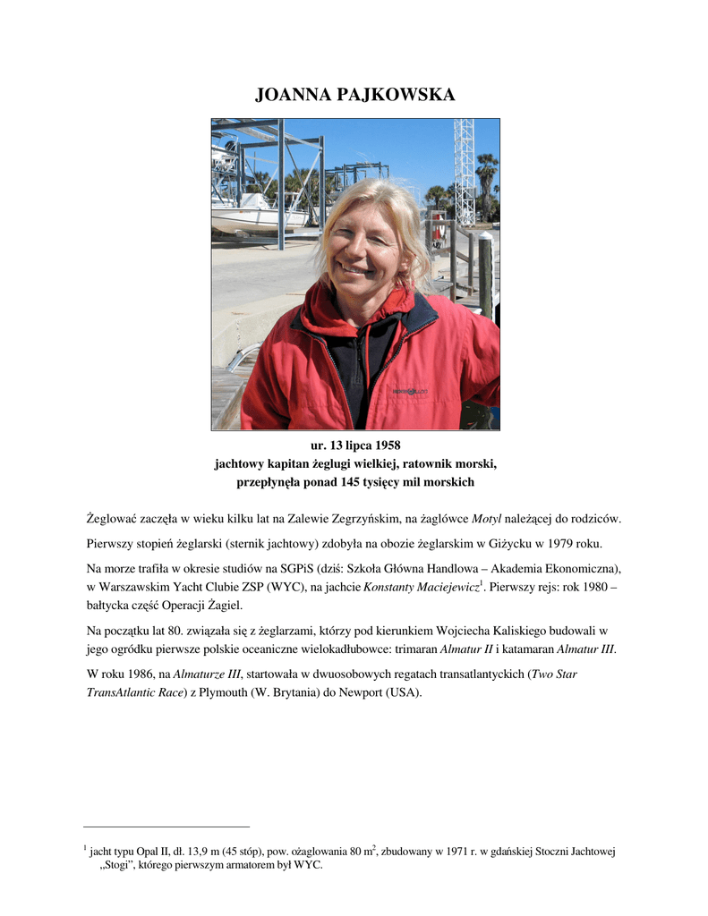 JOANNA PAJKOWSKA ur. 13 lipca 1958 jachtowy kapitan eglugi wielkiej, ratownik morski, przepłynła ponad 145 tysicy mil morskich eglowa zaczła w wieku kilku lat na Zalewie Zegrzyskim, na aglówce Motyl nalecej do rodziców. Pierwszy stopie eglarski (sternik jachtowy) zdobyła na obozie eglarskim w Giycku w 1979 roku. Na morze trafiła w okresie studiów na SGPiS (dzi: Szkoła Główna Handlowa – Akademia Ekonomiczna), w Warszawskim Yacht Clubie ZSP (WYC), na jachcie Konstanty Maciejewicz1. Pierwszy rejs: rok 1980 – bałtycka cz Operacji agiel. Na pocztku lat 80. zwizała si z eglarzami, którzy pod kierunkiem Wojciecha Kaliskiego budowali w jego ogródku pierwsze polskie oceaniczne wielokadłubowce: trimaran Almatur II i katamaran Almatur III. W roku 1986, na Almaturze III, startowała w dwuosobowych regatach transatlantyckich (Two Star TransAtlantic Race) z Plymouth (W. Brytania) do Newport (USA). 1 jacht typu Opal II, dł. 13,9 m (45 stóp), pow. oaglowania 80 m2, zbudowany w 1971 r. w gdaskiej Stoczni Jachtowej „Stogi”, którego pierwszym armatorem był WYC. W latach 1995-2002 mieszkała w Salcombe, na południu Anglii (25 m SE od Plymouth). Tam poznała grup eglarzy regatowych i w jej składzie nabierała dowiadczenia. Trzy razy (1995, 1997, 1999) brała udział w regatach Fastnet2 – startowała w nich na jachtach 38-stopowych. Była członkiem załogi statku ratownictwa morskiego Salcombe Lifeboat, z Royal National Lifeboat Institution (RNLI), jako jedna z niewielu kobiet w tej renomowanej brytyjskiej organizacji ratownictwa morskiego. Brała udział w szeregu akcji ratowniczych. Na ldzie zajmowała si prowadzeniem farmy i – jak teraz artuje – w tym fachu zdobyła certyfikat pasterza owiec. • 2000 – zajła 4 miejsce w klasie (na 24 startujce w klasie jachty) w najbardziej prestiowych na wiecie samotnych regatach transatlantyckich OSTAR, z Plymouth (W. Brytania) do Newport (USA), na 40-stopowym jachcie Ntombifuti; za rejs ten otrzymała II Honorow Nagrod Polskiego Zwizku eglarskiego Rejs Roku 2000 i nagrod Polonijny Rejs Roku 2000 nadan przez eglarzy Wschodniego Wybrzea USA. • 2001 – startowała w załogowych regatach transatlantyckich: o z załog wyłcznie kobiec, na 60-stopowym jachcie Alphagraphics i w regatach EDS Atlantic Challenge na trasie St.Malo (Francja) – Hamburg (Niemcy) – Portsmouth (Wlk. Brytania) – Baltimore (USA) – Boston (USA) – St.Malo. o w dwuosobowych regatach transatlantyckich Transat Jacques Vabre na jachcie Olympic Challenger, z Hawru (Francja) do Salvador de Bahia (Brazylia). • grudzie 2002 – stycze 2003 – jachtem Zjawa IV trzykrotnie okryła przyldek Horn i dotarła do antarktycznego archipelagu Szetlandy Południowe. • padziernik 2006 – luty 2007 – startuje w dwuosobowych kobiecych regatach dookoła wiata: na jachcie Mantra Asia3 płynła z Darwin (Australia) do Kapsztadu (RPA) i dalej do Salvador de Bahia (Brazylia), wygrywajc ten etap regat. egluga na tym odcinku została wyróniona Honorow Nagrod Polskiego Zwizku eglarskiego Rejs Roku 2007. • 24 czerwca 2008 – 8 stycznia 2009 – na jachcie Mantra Asia odbyła samotny rejs dookoła wiata z najlepszym w historii polskiego samotnego eglarstwa czasem 198 dni. Za ten rejs wyróniona została najwysz doroczn nagrod w polskim eglarstwie: I nagrod Rejs Roku 2009 i Srebrnym Sekstantem. Sejmik Polskiego Zwizku eglarskiego obradujcy w 2009 przyznał za ten rejs najwysze wyrónienie – Honorow Złot Odznak PZ. • Od 2005 roku corocznie dowodzi rejsami na Morze Północne (do Anglii). Pływa take – jako zawodowy skipper – na Morzu ródziemnym. Czsto egluje, jako oficer, na STS Pogoria. 2 The Fastnet Race – regaty na dystansie 608 Mm, organizowane co dwa lata na trasie: Cowes (Wyspa Wight, Wlk. Brytania) – irlandzka wysepka Fastnet Rock – Plymouth, omijajcej grup wysp Scilly od południa. Za spraw ksikowej relacji Zbigniewa Kosiorowskiego z Fastnet 1979, kiedy sztorm zatopił kilka jachtów i spowodował mier 15 eglarzy (Kosiorowski, Zbigniew. 13 w skali Beauforta. Szczecin, KAW 1981), regaty te maj w Polsce gron sław. Joanna Pajkowska podkrela, e w Fastnet za kadym razem miała słabe wiatry i pikn, cho raczej nieeglarsk, pogod. 3 jacht typu Mantra 28, dł. 8,5 m (28 stóp), pow. oaglowania 60 m², zaprojetowany przez Andrzeja Armiskiego i wykonany w jego stoczni w Szczecinie • 10 lutego 2010, 18:29 GMT – Joanna Pajkowska i Aleksander Nebelski wypływaj z St. Petersburg (Floryda, USA) na jachcie Mantra Asia, by przez przez Kanał Panamski i Pacyfik dotrze na Morze ródziemne. 10 lutego 2010, 18:29 GMT, Salt Creek Marina, St. Petersburg (Floryda, USA) 10 lutego 2010, 19:05 GMT, St. Petersburg (Floryda, USA) – wyjcie na Tampa Bay Dane: Aleksander Nebelski, luty 2010 © Fot.: www.zeglujmyrazem.com