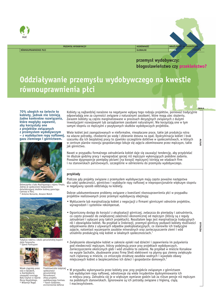 PŁEĆ PRZEMYSŁ WYDOBYWCZY RÓWNOUPRAWNIENIE PŁCI NIERÓWNOŚĆ WRAŻLIWOŚĆ NA ZAGROŻENIA GLOBALNE PRAWA KOBIETY przemysł wydobywczy: błogosławieństwo czy przekleństwo? Oddziaływanie przemysłu wydobywczego na kwestie równouprawnienia płci SKALA Kobiety są najbardziej narażone na negatywne wpływy tego rodzaju projektów, ponieważ tradycyjnie odpowiadają one za czynności związane z naturalnymi zasobami, które mogą ulec skażeniu. Zarazem kobiety są często marginalizowane w procesach decyzyjnych związanych z dużymi inwestycjami rozwojowymi lub zarządzaniem zasobami naturalnymi. Nie korzystają one w tym samym stopniu co mężczyźni z pozytywnych skutków wydobywczych projektów. Wiele kobiet jest zaangażowanych w nieformalne, nieopłacane prace, takie jak produkcja rolna na własne potrzeby, chodzenie po wodę i zbieranie drewna na opał. Dyskryminacja kobiet i brak szacunku dla ich bezpłatnej pracy to zjawisko szczególnie dotkliwe w społeczeństwach, w których w centrum planów rozwoju gospodarczego lokuje się zajęcia zdominowane przez mężczyzn, takie jak górnictwo. WPŁYW 70% ubogich na świecie to kobiety, jednak nie istnieją żadne konkretne rozwiązania, które mogłyby zapewnić, aby korzystały one z projektów związanych z przemysłem wydobywczym – z wydobyciem ropy naftowej, gazu ziemnego i górnictwem. Nawet w przypadku formalnego zatrudniania kobiet daje się zauważyć tendencję, aby przydzielać im dłuższe godziny pracy i wynagradzać gorzej niż mężczyzn wykonujących podobne zadania. Poważne dysproporcje pomiędzy płciami (na korzyść mężczyzn) istnieją we władzach firm i na stanowiskach państwowych, szczególnie w odniesieniu do przemysłu wydobywczego. przykłady Dziewczynka z ludu Machiguenga z rejonu Timpia, Jednej ze społeczności bezpośrednio doświadczającej skutków budowy gazociągu Camisea w Peru. © Antoine Bonsorte, Amazon Watch Podczas gdy projekty związane z przemysłem wydobywczym mają często poważne następstwa dla całej społeczności, górnictwo i wydobycie ropy naftowej w nieproporcjonalnie większym stopniu w negatywny sposób oddziałują na kobiety. Dobrze udokumentowane problemy związane z kwestiami równouprawnienia płci w przypadku projektów realizowanych przez przemysł wydobywczy obejmują: • Ograniczony dostęp do korzyści z eksploatacji górniczej, zwłaszcza do pieniędzy i zatrudnienia, co często prowadzi do zwiększonej zależności ekonomicznej od mężczyzn (którzy są z reguły zatrudniani i opłacani przy takich projektach). Rezultatem tego jest marginalizacja tradycyjnych ról i obowiązków kobiet. Na przykład w Indonezji, przemysł górniczy pozbawił kobiety możliwości odzyskiwania złota z używanych odpadów poeksploatacyjnych, co stanowiło ich tradycyjne zajęcie, natomiast wyczerpanie zasobów mineralnych oraz zanieczyszczenie ziemi i wód utrudniło produkcyjną rolę kobiet w lokalnych społecznościach.1 Tubylcza rodzina z okolic peruwiańskiej kopalni złota Yanacocha. © Sjoerd Panhuysen Wózek ciągnięty przez osła w Qarabork, w Azerbejdżanie nieopodal rurociągu Baku-Ceyhan w rejonie Morza Kaspijskiego. © Willemijn Nagel Przedstawiciele tubylczej społeczności peruwiańskiej Shivankoreni, ofiary projektu wydobywczego Camisea. © Aaron Goldzimer, environmental defense • Zwiększenie obowiązków kobiet w zakresie opieki nad dziećmi i zapewnienia im pożywienia pod nieobecność mężczyzn, którzy podejmują prace przy projektach wydobywczych. Zanieczyszczenie okolicznych gleb i wód utrudnia to zadanie. Na przykład w mieście Korsakow na wyspie Sachalin, zbudowanie przez firmę Shell elektrowni na płynny gaz ziemny zwiększyło ruch ciężarowy w mieście, co zniszczyło strukturę zasobów wodnych i wywołało obawy miejscowych kobiet o bezpieczeństwo ich dzieci i gospodarstw domowych.2 • W przypadku wykonywania przez kobiety prac przy projekcie związanym z górnictwem lub wydobyciem ropy naftowej, odnotowuje się wiele incydentów dyskryminowania ich w miejscu pracy. Zatrudnia się je w większym wymiarze godzin lub za niższe pensje niż mężczyzn na podobnych stanowiskach. Ignorowane są ich potrzeby związane z higieną, ciążą i macierzyństwem. PRZYKŁAD • Wykluczenie lub marginalizację kobiet z negocjacji z firmami górniczymi odnośnie projektów, wynagrodzeń i systemów rekompensat. 2507 foe eu factsheet 7 eng.qxd:Layout 1 9/21/07 przemysł wydobywczy: błogosławieństwo czy przekleństwo? 4:06 PM Page 12 Niniejsza broszura stanowi część projektu pod nazwą „Przemysł wydobywczy: błogosławieństwo czy przekleństwo?” realizowanego przez organizacje Friends of the Earth Europe, Friends of the Earth Netherlands i CEE Bankwatch Network. PRZEMYSŁ WYDOBYWCZY RÓWNOUPRAWNIENIE PŁCI NIERÓWNOŚĆ WRAŻLIWOŚĆ NA ZAGROŻENIA GLOBALNE PRAWA KOBIETY SKALA • Wyższe ryzyko zubożenia ekonomicznego gospodarstw prowadzonych przez kobiety opuszczone przez swoich mężów, zwłaszcza w przypadkach wysiedlenia. • Nasilony problem przemocy domowej wobec kobiet w związku z obniżeniem społecznego i ekonomicznego statusu kobiet w lokalnych społecznościach. PRZYKŁAD • Ignorowanie religijnych i duchowych związków tubylczych kobiet z ich otoczeniem i ziemią, zwłaszcza w przypadku osób wysiedlonych ze swoich terenów w wyniku prac górniczych. • Większe ryzyko zapadnięcia na HIV/AIDS i inne choroby przenoszone drogą płciową, większe zagrożenie padnięcia ofiarą nadużyć seksualnych i handlu kobietami, jako rezultat zarówno napływu siły roboczej (mężczyzn) lub konieczności zdobycia pieniędzy, w celu utrzymania rodziny. Jednocześnie mężczyźni poszukujący pracy często zostawiają duże rodziny bez źródła dochodu. Tendencje te można zaobserwować na przykład w Azerbejdżanie, gdzie w rejonie budowy rurociągu Baku-Tbilisi-Ceyhan nastąpiło nasilenie zjawiska handlu kobietami i prostytucji.