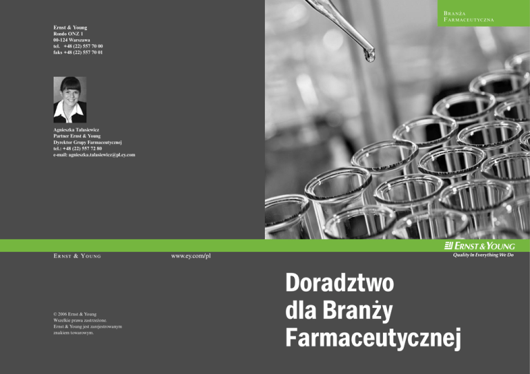 BRAN˝A F A R M AC E U T YC Z N A Ernst & Young Rondo ONZ 1 00-124 Warszawa tel. +48 (22) 557 70 00 faks +48 (22) 557 70 01 Agnieszka Ta∏asiewicz Partner Ernst & Young Dyrektor Grupy Farmaceutycznej tel.: +48 (22) 557 72 80 e-mail: [email protected] ERNST & YOUNG © 2006 Ernst & Young Wszelkie prawa zastrze˝one. Ernst & Young jest zarejestrowanym znakiem towarowym. www.ey.com/pl Doradztwo dla Branży Farmaceutycznej Globalny lider w zakresie doradztwa branży farmaceutycznej Od ponad 25 lat Ernst & Young pomaga w kształtowaniu sektora farmaceutycznego. JesteÊmy liderem w Êwiadczeniu usług doradczych firmom farmaceutycznym i biotechnologicznym, sprzedawcom leków i organizacjom farmaceutycznym. Dostarczamy kompleksowe strategie oraz skuteczne rozwiàzania biznesowe, zaprojektowane specjalnie dla tej bran˝y, a ponad 1000 konsultantów naszej firmy na całym Êwiecie stale Êledzi rynkowe trendy Koncentrujemy si´ na specyfice bran˝y i spełniamy oczekiwania Klientów Nasze dzia∏ania obejmujà pe∏nà gam´ us∏ug w zakresie: doradztwa podatkowego doradztwa transakcyjnego doradztwa biznesowego audytu Ernst &Young to globalny lider usług audytowo – doradczych. Działamy na rzecz odzyskania zaufania rynku do firm świadczących profesjonalne usługi i dbamy o jakość sprawozdawczości finansowej. 107 000 osób w ponad 140 krajach przestrzega zasad uczciwości i profesjonalizmu w pracy dla Klientów. Świadczymy najwyższej jakości kompleksowe usługi w ramach naszych najważniejszych kompetencji – audytu, rachunkowości, doradztwa podatkowego, biznesowego i transakcyjnego. 3 ZgodnoÊç z przepisami Zmiany w przepisach wp∏ywajàcych na ca∏y sektor farmaceutyczny powinny byç uwa˝nie Êledzone, aby cz∏onkowie zarzàdów firm wraz z kadrà zarzàdzajàcà mogli podejmowaç trafne decyzje i dostosowywaç swoje firmy do aktualnych wydarzeƒ i trendów w bran˝y. Nasi eksperci gwarantujà sta∏y dop∏yw informacji na temat dokonujàcych si´ zmian w przepisach. Efektywne zarzàdzanie ∏aƒcuchem dostaw Dla firm koncentrujàcych si´ na zrównowa˝onym rozwoju, jednà z najwa˝niejszych potrzeb jest efektywnoÊç podatkowa, zarzàdzanie łaƒcuchem dostaw. Eksperci z Ernst & Young projektujà i pomagajà we wdra˝aniu zarzàdzania łaƒcuchem dostaw w zgodzie z regulacjami obowiàzujàcymi w bran˝y farmaceutycznej. Struktury biznesowe Doradztwo Podatkowe Eksperci Ernst & Young specjalizujàcy si´ w doradztwie podatkowym, oferujà swoje doÊwiadczenie i wiedz´ w nast´pujàcych obszarach: Zarzàdzanie ryzykiem podatkowym Proponowane rozwiàzania pozwolà na ograniczenie ryzyka podatkowego i unikni´cie dodatkowych obcià˝eƒ finansowych, wynikajàcych z b∏´dów w rozliczeniach podatkowych. Us∏ugi w zakresie ryzyka podatkowego w obszarze promocji i reklamy farmaceutyków Zespó∏ doradców Ernst & Young zapewnia rozwiàzania majàce praktyczne zastosowanie w prowadzeniu biznesu, skupiajàce si´ na rzeczywistych rodzajach ryzyka zwiàzanych ze sprzeda˝à i marketingiem w sektorze farmaceutycznym. Istotà wspó∏pracy z Klientem jest usprawnianie procesu dokumentowania, zatwierdzania, komunikowania oraz przewodzenia i monitorowania dzia∏aƒ w obszarze promocji i reklamy farmaceutyków. 4 D O R A D Z T WO DLA B R A N ˝ Y F A R M AC E U T YC Z N E J Eksperci Ernst & Young doradzajà Klientom przy planowanych fuzjach, podzia∏ach i transformacjach mi´dzynarodowych i polskich firm farmaceutycznych. W sk∏ad rozwiàzaƒ restrukturyzacyjnych, które proponujemy, wchodzà nie tylko analizy skutków przekszta∏ceƒ podatkowych i prawnych, ale równie˝ doradztwo biznesowe. Rozwiàzania podatkowe w obszarze R&D Ernst & Young specjalizuje si´ tak˝e w dostarczaniu szerokiego wachlarza globalnych us∏ug i rozwiàzaƒ podatkowych w obszarze R&D, dostosowanych do potrzeb ka˝dego Klienta, zgodnie z jego profilem R&D. Ceny transferowe: dokumentacja i planowanie podatkowe Ernst & Young dysponuje rozleg∏ym doÊwiadczeniem w zakresie cen transferowych w sektorze farmaceutycznym. Poprzez ocen´ wp∏ywu planowania cen transferowych na optymalne opracowanie ich struktury podatkowej Ernst & Young wspiera procesy dokumentacji i planowania podatkowego w firmach. Globalne obcià˝enia podatkowe Pomagamy firmom i kadrze zarzàdzajàcej zajmujàcej si´ podatkami w wype∏nianiu obowiàzków podatkowych na ca∏ym Êwiecie. Zarzàdom firm zapewniamy pe∏nà wiedz´ przy podejmowaniu kluczowych decyzji podatkowych. Kadrze mened˝erskiej przedstawiamy dane i narz´dzia niezb´dne do skutecznego zarzàdzania i minimalizowania globalnych obcià˝eƒ podatkowych firmy oraz stosowania efektywnych stawek podatkowych. 5 Doradztwo Transakcyjne Us∏ugi w zakresie doradztwa transakcyjnego usprawniajà zarzàdzanie transakcjami i pozwalajà podjàç op∏acalne decyzje inwestycyjne. Firmy farmaceutyczne mogà korzystaç z nast´pujàcych us∏ug: Pozyskiwanie finansowania Pomagamy w pozyskaniu finansowania, w tym z funduszy private equity/venture capital. Przeprowadzamy analiz´ mo˝liwoÊci, prezentujemy alternatywne rozwiàzania oraz rekomendujemy optymalny sposób pozyskania finansowania, włàczajàc w to tak˝e planowanie podatkowe. Fuzje i przej´cia. Transakcje sprzeda˝y i reorganizacji przedsi´biorstw Rozwijajàcy si´ sektor farmaceutyczny w Europie Centralnej i Wschodniej oferuje niezmierzone mo˝liwoÊci ekspansji rynkowej. JesteÊmy wiodàcym doradcà finansowym w transakcjach zakupu przedsi´biorstw, zbywania udziałów w spółkach, sprzeda˝y zorganizowanych cz´Êci przedsi´biorstw, jak i wydzielonych aktywów oraz poszukiwania partnerów biznesowych. Pomagamy w zarzàdzaniu procesem inwestycyjnym, wspieramy podczas prowadzenia negocjacji oraz przeprowadzamy przeglàdy strategiczne. 6 D O R A D Z T WO DLA B R A N ˝ Y F A R M AC E U T YC Z N E J Doradztwo finansowe Wykonujemy wyceny biznesowe, analizy ekonomiczne i finansowe, projektujemy modele finansowe, w tym ind