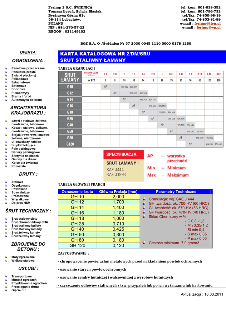 Ferimp 2 S.C. ŚWIDNICA Tomasz Łysoń, Sylwia Błasiak Bystrzyca Górna 61c 58-114 Lubachów, POLAND NIP : 884-270-57-22 REGON : 021149102 tel. kom. 601-638-352 tel. kom. 601-796-732 tel/fax. 74-850-98-19 tel/fax. 74-853-81-99 e-mail : [email protected] e-mail : [email protected] BGŻ S.A. O /Świdnica Nr 57 2030 0045 1110 0000 0178 1260 OFERTA: OGRODZENIA : Panelowe przetłaczane Panelowe proste Z siatki plecionej Palisadowe Sztachetowe Betonowe Sportowe Piłkochwyty Bramy i furtki Automatyka do bram KARTA KATALOGOWA NR 2/DM/SRU ŚRUT STALIWNY ŁAMANY TABELA GRANULACJI ARCHITEKTURA KRAJOBRAZU : Ławki : stalowe ,żeliwne, nierdzewne, betonowe Kosze : stalowe, żeliwne, nierdzewne, betonowe Stojaki rowerowe: stalowe, żeliwne, nierdzewne Ulicowskazy, tablice Słupki blokujące Pale parkingowe Bariery parkingowe Skrzynie na piasek Osłony dla drzew Kojce dla zwierząt Pozostałe DRUTY : Stalowe Ocynkowane Powlekane Spawalnicze Prostowane Wiązałkowe Do pras HSM ŚRUT TECHNICZNY : Śrut stalowy cięty Śrut chromoniklowy CrNi Śrut staliwny kulisty Śrut staliwny łamany Śrut żeliwny kulisty Śrut żeliwny łamany ZBROJENIE DO BETONU : Maty zgrzewane Włókno stalowe USŁUGI : Transportowe Montaż ogrodzeń Projektowanie ogrodzeń Przeciąganie drutu Gięcie rur TABELA GŁÓWNEJ FRAKCJI Oznaczenie śrutu Główna Frakcja [mm] GH 10 GH 12 GH 14 GH 16 GH 18 GH 25 GH 40 GH 50 GH 80 GH 120 2,000 1,700 1,400 1,180 1,000 0,710 0,425 0,300 0,180 0,120 Parametry Techniczne Granulacja: wg. SAE J 444 GH twardość: ok. 700-HV (60 HRC) GL twardość: ok. 570-HV (53 HRC) GP twardość: ok. 470-HV (40 HRC) Skład Chemiczny w %: - C 0,8 -1,2 - Mn 0,35-1,2 - Si min 0,4 - S max 0,05 - P max 0,05 Gęstość minimum 7,0 gr/cm3 ZASTOSOWANIE : - chropowacenie powierzchni metalowych przed nakładaniem powłok ochronnych - usuwanie starych powłok ochronnych - usuwanie zendry hutniczej i walcowniczej z wyrobów hutniczych - czyszczenie odlewów staliwnych z tzw. przypaleń lub po ich wyżarzaniu lub hartowaniu Aktualizacja : 18.03.2011