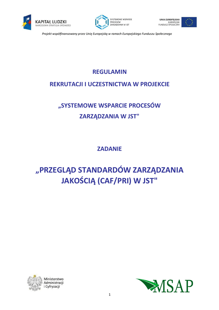 Projekt współfinansowany przez Unię Europejską w ramach Europejskiego Funduszu Społecznego REGULAMIN REKRUTACJI I UCZESTNICTWA W PROJEKCIE „SYSTEMOWE WSPARCIE PROCESÓW ZARZĄDZANIA W JST" ZADANIE „PRZEGLĄD STANDARDÓW ZARZĄDZANIA JAKOŚCIĄ (CAF/PRI) W JST" 1 Projekt współfinansowany przez Unię Europejską w ramach Europejskiego Funduszu Społecznego Niniejszy Regulamin został przygotowany na potrzeby projektu „Systemowe wsparcie procesów zarządzania w JST" realizowanego w ramach Priorytetu V, Działania 5.2, Poddziałania 5.2.2 Programu Operacyjnego Kapitał Ludzki. Regulamin określa zasady realizacji Zadania „Przegląd standardów zarządzania jakością (CAF/PRI) w JST". § 1. SŁOWNIK REGULAMINU PO KL - Program Operacyjny Kapitał Ludzki . EFS - Europejski Fundusz Społeczny. Projekt - projekt „Systemowe wsparcie procesów zarządzania w JST" współfinansowany przez Unię Europejską, ze środków Europejskiego Funduszu Społecznego w ramach Programu Operacyjnego Kapitał Ludzki, Priorytet V Dobre rządzenie, Działanie 5.2 Wzmocnienie potencjału administracji samorządowej, Poddziałanie 5.2.2 Systemowe wsparcie funkcjonowania administracji samorządowej. Instytucja Zarządzająca - Ministerstwo Rozwoju Regionalnego. Instytucja Pośrednicząca/Lider Projektu - Ministerstwo Administracji i Cyfryzacji. Realizator wsparcia/Partner Projektu - Małopolska Szkoła Administracji Publicznej Uniwersytetu Ekonomicznego w Krakowie (MSAP UEK). Zadanie - Zadanie realizowane w ramach projektu przez Małopolską Szkołę Administracji Publicznej Uniwersytetu Ekonomicznego w Krakowie (MSAP UEK) pod nazwą „Przegląd standardów zarządzania jakością (CAF/PRI) w JST". Zakres wsparcia oferowany w ramach zadania: I etap: szkolenie i doradztwo dla JST oraz pracowników JST w zakresie wdrażania metod PRI/CAF, II etap: poświadczenie zastosowania metod PRI/CAF w JST. Grupa docelowa - Wsparcie kierowane jest do 53 JST. Jednostka samorządu terytorialnego (JST) - urząd jednostki samorządu terytorialnego szczebla lokalnego. Wspólna Metoda Oceny (CAF – Common Assessment Framework) – narzędzie zarządzania jakością, zainspirowane przez Model Doskonałości Europejskiej Fundacji Zarządzania Jakością (EFQM) i model Niemieckiego Uniwersytetu Nauk o Administracji (German University of Administrative Sciences) w Speyer. Opiera się na założeniu, że doskonałe wyniki organizacji osiągane są poprzez 2 Projekt współfinansowany przez Unię Europejską w ramach Europejskiego Funduszu Społecznego przywództwo ukierunkowane na strategię i planowanie, pracowników, partnerstwo, zasoby i procesy. Planowanie Rozwoju Instytucjonalnego (PRI) – metoda pozwalająca kierownictwu JST na samodzielną analizę stanu zarządzania i potencjału własnej jednostki do wykorzystania nowoczesnych narzędzi zarządzania, planowanie zmian i ich wdrażanie. Eksperci ds. wdrażania CAF/PRI – osoby odpowiedzialne za I etap wsparcia w postaci przeprowadzenia szkoleń i doradztwo dla JST oraz pracowników JST w zakresie wdrażania metod CAF/PRI. Eksperci ds. poświadczenia zastosowania CAF/PRI – osoby odpowiedzialne za II etap wsparcia w postaci poświadczenia zastosowania metod CAF/PRI. Samorządowe Zespoły ds. CAF/PRI – zespoły pracowników oddelegowanych przez wspierane JST do udziału w procesie wdrażania i poświadczenia zastosowania metod CAF/PRI. Zespół zadaniowy – zespół składający się z członków Samorządowego Zespołu ds. CAF/PRI oraz ekspertów projektu (tj. eksperta ds. wdrażania CAF/PRI lub eksperta ds. poświadczenia zastosowania CAF/PRI w zależności od etapu realizowanego wsparcia). 3 Projekt współfinansowany przez Unię Europejską w ramach Europejskiego Funduszu Społecznego § 2. INFORMACJE SZCZEGÓŁOWE O ZADANIU 1. Podmiotem realizującym Zadanie jest Małopolska Szkoła Administracji Publicznej Uniwersytetu Ekonomicznego w Krakowie (MSAP UEK) – Partner Projektu we współpracy z Ministerstwem Administracji i Cyfryzacji - Lider Projektu. 2. Celem zadania jest podniesienie efektywności procesów zarządzania w JST poprzez stworzenie systemu wsparcia wdrażania CAF/PRI w JST, w tym procesu poświadczania zastosowania metody CAF/PRI oraz opracowanie propozycji rozwiązań systemowych w zakresie modernizacji zarządzania w JST. 3. Wsparcie dla JST w ramach Zadania i ogłaszanego naboru obejmuje: a) w ramach I etapu: organizację szkoleń i doradztwo dla JST oraz pracowników JST w zakresie wdrażania metod CAF/PRI. b) w ramach II etapu: przeprowadzenie procesu (ewaluacji/certyfikacji) metod zarządzania jakością CAF/PRI. poświadczania stosowania 4. Okres udzielonego wsparcia – rekrutacja 53 JST odbędzie się w ramach dwóch naborów. I nabór (XI 2013) – 28 JST: wsparcie w ramach I etapu: szkolenia i doradztwo dla JST oraz pracowników JST w zakresie wdrażania metod CAF/PRI (okres realizacji wsparcia: 13 I 2014 – 30 IV 20140; wsparcie w ramach II etapu: proces poświadczania stosowania metod zarządzania jakością CAF/PRI, (okres realizacji wsparcia: 1 IX 2014 – 31 XII 2014) II nabór (VI 2014) – 25 JST: wsparcie w ramach I etapu: szkolenia i doradztwo dla JST oraz pracowników JST w zakresie wdrażania metod CAF/PRI, (okres realizacji wsparcia:: 18 VIII 2014 – 30 XI 2014; wsparcie w ramach II etapu (proces poświadczania stosowania metod zarządzania jakością CAF/PRI): 1 III 2015 – 31 VIII 2015. 5. 5. Wsparcie dla jednostek samorządu terytorialnego biorących udział w Zadaniu obejmuje doradztwo oraz warsztaty szkoleniowe realizowane przez ekspertów projektu na miejscu w JST oraz konsultacje i doradztwo realizowane na odległość. Wymiar wsparcia w przypadku każdej JST będzie nie mniejszy niż 48 godz. pracy ekspertów. Ponadto wsparcie obejmie materiały szkoleniowe i informacyjne, dostęp do zasobów projektu (baza wiedzy) oraz możliwość konsultacji z biurem projektu. 4 Projekt współfinansowany przez Unię Europ