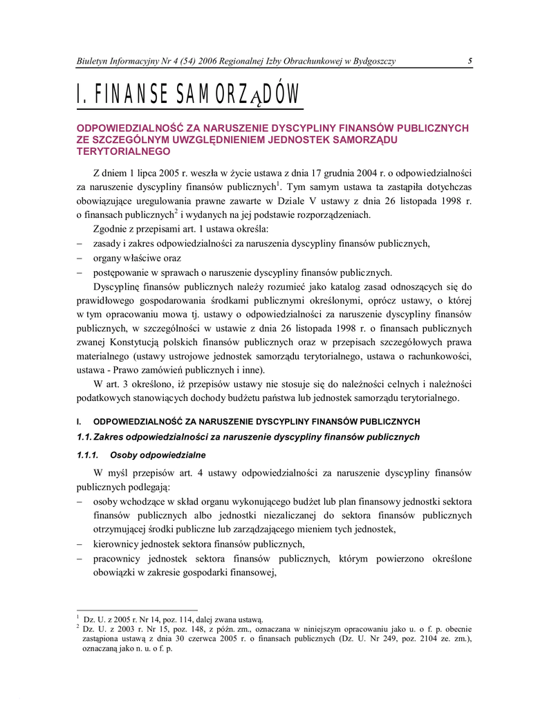 Biuletyn Informacyjny Nr 4 (54) 2006 Regionalnej Izby Obrachunkowej w Bydgoszczy 5 I. FINANSE SAMORZĄDÓW ODPOWIEDZIALNOŚĆ ZA NARUSZENIE DYSCYPLINY FINANSÓW PUBLICZNYCH ZE SZCZEGÓLNYM UWZGLĘDNIENIEM JEDNOSTEK SAMORZĄDU TERYTORIALNEGO Z dniem 1 lipca 2005 r. weszła w życie ustawa z dnia 17 grudnia 2004 r. o odpowiedzialności za naruszenie dyscypliny finansów publicznych1. Tym samym ustawa ta zastąpiła dotychczas obowiązujące uregulowania prawne zawarte w Dziale V ustawy z dnia 26 listopada 1998 r. o finansach publicznych2 i wydanych na jej podstawie rozporządzeniach. Zgodnie z przepisami art. 1 ustawa określa: − zasady i zakres odpowiedzialności za naruszenia dyscypliny finansów publicznych, − organy właściwe oraz − postępowanie w sprawach o naruszenie dyscypliny finansów publicznych. Dyscyplinę finansów publicznych należy rozumieć jako katalog zasad odnoszących się do prawidłowego gospodarowania środkami publicznymi określonymi, oprócz ustawy, o której w tym opracowaniu mowa tj. ustawy o odpowiedzialności za naruszenie dyscypliny finansów publicznych, w szczególności w ustawie z dnia 26 listopada 1998 r. o finansach publicznych zwanej Konstytucją polskich finansów publicznych oraz w przepisach szczegółowych prawa materialnego (ustawy ustrojowe jednostek samorządu terytorialnego, ustawa o rachunkowości, ustawa - Prawo zamówień publicznych i inne). W art. 3 określono, iż przepisów ustawy nie stosuje się do należności celnych i należności podatkowych stanowiących dochody budżetu państwa lub jednostek samorządu terytorialnego. I. ODPOWIEDZIALNOŚĆ ZA NARUSZENIE DYSCYPLINY FINANSÓW PUBLICZNYCH 1.1. Zakres odpowiedzialności za naruszenie dyscypliny finansów publicznych 1.1.1. Osoby odpowiedzialne W myśl przepisów art. 4 ustawy odpowiedzialności za naruszenie dyscypliny finansów publicznych podlegają: − osoby wchodzące w skład organu wykonującego budżet lub plan finansowy jednostki sektora finansów publicznych albo jednostki niezaliczanej do sektora finansów publicznych otrzymującej środki publiczne lub zarządzającego mieniem tych jednostek, − kierownicy jednostek sektora finansów publicznych, − pracownicy jednostek sektora finansów publicznych, którym powierzono określone obowiązki w zakresie gospodarki finansowej, 1 2 Dz. U. z 2005 r. Nr 14, poz. 114, dalej zwana ustawą. Dz. U. z 2003 r. Nr 15, poz. 148, z późn. zm., oznaczana w niniejszym opracowaniu jako u. o f. p. obecnie zastąpiona ustawą z dnia 30 czerwca 2005 r. o finansach publicznych (Dz. U. Nr 249, poz. 2104 ze. zm.), oznaczaną jako n. u. o f. p. 6 Biuletyn Informacyjny Nr 4 (54) 2006 Regionalnej Izby Obrachunkowej w Bydgoszczy − pracownicy sektora finansów publicznych, którym powierzono określone czynności przewidziane w przepisach o zamówieniach publicznych, − osoby gospodarujące środkami publicznymi przekazanymi jednostkom niezaliczanym do sektora finansów publicznych. Z powyższych przepisów wynika, iż w jednostkach samorządu terytorialnego odpowiedzialność za naruszenie dyscypliny finansów publicznych ponoszą osoby fizyczne, w szczególności: − wchodzące w skład organu wykonującego budżet (organu wykonawczego), tj. członkowie zarządu powiatu, zarządu województwa samorządowego, wójt, burmistrz, prezydent, a także członkowie zarządów związków komunalnych, gmin i powiatów, − kierownicy jednostek samorządu terytorialnego tj. wójt, burmistrz, prezydent, starosta, marszałek województwa, kierownicy jednostek organizacyjnych jednostek samorządu terytorialnego tj. jednostek budżetowych, gospodarstw pomocniczych jednostek budżetowych, zakładów budżetowych, kierownicy komunalnych osób prawnych tj. instytucji kultury oraz samodzielnych publicznych zakładów opieki zdrowotnej, − pracownicy jednostek samorządu terytorialnego i ich jednostek organizacyjnych tj. pracownicy jednostek budżetowych, gospodarstw pomocniczych jednostek budżetowych, zakładów budżetowych, komunalnych osób prawnych (instytucji kultury oraz samodzielnych publicznych zakładów opieki zdrowotnej), a w szczególności skarbnicy gmin, powiatów i województw samorządowych, główni księgowi w jednostkach samorządu terytorialnego oraz w jednostkach organizacyjnych tych jednostek a także inni pracownicy (przełożeni), którym powierzono określone obowiązki w zakresie gospodarki finansowej, rachunkowości lub czynności przewidziane w przepisach o zamówieniach publicznych i oznaczono z tym zakres ich czynności. Powierzenie obowiązków głównym księgowym w zakresie gospodarki finansowej oraz rachunkowości regulują przepisy art. 35 ust. 1 powołanej ustawy z dnia 26 listopada 1998 r. o finansach publicznych oraz art. 4 ust. 5 w związku z art. 28a ustawy z dnia 29 września 1994 r. o rachunkowości3. W każdym przypadku powierzenia określonych obowiązków w zakresie gospodarki finansowej pracownikom jednostki przyjęcie tych obowiązków musi być przez te osoby stwierdzone dokumentem. W dokumencie tym winny być w sposób czytelny określone obowiązki aby można było w sposób czytelny określić odpowiedzialność. Większość czynów określonych w art. 5 - 18 ustawy, jako naruszenia dyscypliny finansów publicznych ma charakter powszechny tzn. że może się ich dopuścić każda osoba wymieniona w art. 4 ustawy tj. zarówno osoby, które dysponują środkami w imieniu jednostki sektora finansów publicznych jak i te osoby, które dysponują środkami publicznymi przekazanymi podmiotom niezaliczonym do sektora finansów publicznych. Sprawcami części naruszeń dyscypliny finansów publicznych mogą być wyłącznie osoby dysponujące w imieniu jednostek sektora finansów publicznych środkami publicznymi. 3 Dz. U. z 2002 r. Nr 76, poz. 694, z późn. zm. Biuletyn Informacyjny Nr 4 (54) 2006 Regionalnej Izby Obrachunkowej w Bydgoszczy 7 Wśród naruszeń, które mają charakter indywidualny można