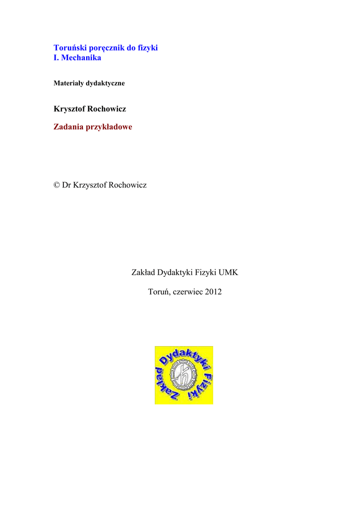 Toruński poręcznik do fizyki I. Mechanika Materiały dydaktyczne Krysztof Rochowicz Zadania przykładowe © Dr Krzysztof Rochowicz Zakład Dydaktyki Fizyki UMK Toruń, czerwiec 2012 Toruński poręcznik do fizyki. I. Mechanika – Zadania przykładowe 1. Samochód jadący z prędkością 60 km/godz. przebywa pewną drogę w czasie 2 godzin. Z jaką średnią prędkością musiałby się poruszać, aby tę samą trasę pokonać w ciągu 1,5 godziny? 2. Zawieszone na linie ciało o masie 20 kg podnosimy ze stałą prędkością 5 m/s. Jaką wartość ma siła napinająca linę? 3. Na jakiej wysokości energia kinetyczna ciała spadającego z wysokości 10 m jest równa jego energii potencjalnej? 4. Ciało o masie 5 kg porusza się po poziomym torze z prędkością 2 m/s. Jaką prędkość (przeciwnie zwróconą) należałoby nadać drugiemu ciału o masie 1 kg, aby w wyniku niesprężystego zderzenia zatrzymać to ciało? (Skorzystaj z zasady zachowania pędu.) 5. Samochód jadący z prędkością 72 km/godz. w czasie 10 sekund wyprzedza pociąg jadący w tym samym kierunku z prędkością o połowę mniejszą. Ile wynosi długość pociągu? 6. Średnia prędkość ciała poruszającego się ruchem jednostajnie przyspieszonym (bez prędkości początkowej) przez 5 sekund wyniosła 5 m/s. Ile wynosiło przyspieszenie w tym ruchu? 7. Stała siła o wartości 10 N równoległa do poziomego podłoża przesuwa bez tarcia ciało o masie 1 kg. Ile wyniesie wykonana w czasie 10 s praca? 8. (Trudne) Na wózku umieszczony jest klocek. Współczynnik tarcia między klockiem a wózkiem f = 0,1. Jakie maksymalne przyspieszenie możemy nadać wózkowi, aby klocek pozostał względem wózka nieruchomy? 9. Jaką drogę przebędzie do chwili zatrzymania (bez użycia hamulców, współczynnik tarcia kół o podłoże wynosi 0,25) samochód jadący z prędkością 90 km/godz.? 10. Jaką pracę należy wykonać, aby ciało o masie 5 kg podnieść na wysokość 2 m z przyspieszeniem 2 m/s2? 11. Współczynnik tarcia między kołami samochodu a nawierzchnią wynosi 0,4. Z jaką maksymalną prędkością samochód ten może wjechać w zakręt o promieniu 25 m, aby utrzymać się na szosie? 12. Dwa pociągi wyruszają jednocześnie z dwóch miast naprzeciwko siebie na trasę długości 150 km. Pierwszy z nich jedzie ze średnią prędkością dwukrotnie większą niż drugi. Jaką drogę przebędzie do momentu spotkania pierwszy pociąg? 13. Samochód jadący z prędkością 10 m/s po wyłączeniu silnika zatrzymał się przejechawszy drogę 100 m. Ile wynosiło opóźnienie w tym ruchu? 14. Pod działaniem siły o wartości 10 N ciało uzyskało prędkość 20 m/s w czasie 2 s. Ile wynosiła masa ciała? 2 Toruński poręcznik do fizyki. I. Mechanika – Zadania przykładowe 15. Łódź porusza się z prądem rzeki z prędkością 20 km/godz. względem brzegu, zaś płynąc pod prąd - z prędkością 8 km/godz. Ile wynoszą prędkość łodzi na stojącej wodzie i prędkość prądu w rzece? 16. Z jakiej wysokości musiałoby spaść ciało, aby osiągnąć prędkość 36 km/godz.? Przyjmij g = 10 m/s2 . 17. Ciało o masie 1 kg przebyło drogę 50 m w czasie 5 s od chwili rozpoczęcia ruchu. Jaka była wartość siły działającej na ciało? 18. Ile wynosi siła ciągu silnika samochodu poruszającego się ze stałą prędkością 90 km/godz. o mocy 25 kW? 19. Kulka rzucona pionowo w dół z wysokości 20 m po doskonale sprężystym odbiciu wzniosła się na wysokość 40 m. Ile wynosiła prędkość, z jaką rzucono kulkę? 20. Jaką prędkość końcową osiągnie ciało puszczone swobodnie z wysokości 20 m ? 3 Toruński poręcznik do fizyki. I. Mechanika – Zadania przykładowe Rozwiązania zadań 1. Znając prędkość samochodu v = 60 km/godz. oraz czas ruchu t = 2 godz. możemy obliczyć przebytą drogę: s = v⋅t = 120 km Aby tę samą drogę pokonać w czasie t = 1,5 godz. samochód musiałby poruszać się ze średnią prędkością v = s/t = 80 km/godz. 2. Jeżeli zawieszone na linie ciało podnosimy ze stałą prędkością, to nie nadajemy mu tym samym żadnego dodatkowego przyspieszenia - lina napinana jest tylko pod wpływem ciężaru ciała. Zatem F = m⋅g = 200 N. 3. Możemy na to pytanie odpowiedzieć w oparciu o zasadę zachowania energii. W myśl tej zasady, całkowita energia mechaniczna ciała (np. spadającego swobodnie z wysokości h) pozostaje niezmieniona. Początkowo na energię mechaniczną składa się tylko energia potencjalna (gdyż v0 = 0), wobec tego Ecałk = mgh W miarę spadania energia potencjalna Ep maleje, a rośnie energia kinetyczna Ek , tak że Ecałk = Ep + Ek = mgh Jeżeli interesuje nas sytuacja, w której Ek = Ep to oznacza, że będziemy mieli Ecałk = 2Ep = mgh czyli nastąpi to wówczas, gdy energia potencjalna spadającego ciała zmaleje do wartości mgh/2. Ponieważ nie zmienia się ani m, ani g, będzie to możliwe, gdy wysokość ciała zmaleje do połowy początkowej wartości, tj. 5 m. 4. Aby w wyniku niesprężystego zderzenia dwa ciała się zatrzymały (pęd końcowy całego układu wyniesie zero - a w zderzeniach spełniona jest zasada zachowania pędu), ich początkowe pędy powinny być równe co do wartości i przeciwnie zwrócone. Ponieważ pęd (p = m⋅v) jednego z nich wynosi 10 kg⋅m/s, ciału o masie 1 kg musielibyśmy nadać prędkość 10 m/s. 5. Samochód wyprzedzając pociąg mija go z prędkością (względną) v = 36 km/godz., tj. 10 m/s. Jadąc z taką prędkością w czasie t = 10 s przemieści się względem pociągu o s = v⋅ t = 100 m. Tyle właśnie wynosi długość pociągu. 6. Ciało poruszając się ze średnią prędkością v = 5 m/s w czasie t = 5 s pokonało drogę s = v⋅ t = 25 m. Korzystając ze wzoru na drogę w ruchu jednostajnie przyspieszonym (bez prędkości początkowej) 4 Toruński poręcznik do fizyki. I. Mechanika – Zadania przykładowe s = at2/2 obliczamy przyspieszenie a, otrzymując 2 m/s2 . 7. Prac