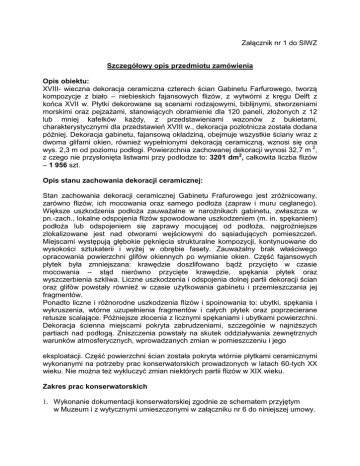 Załącznik nr 1 do SIWZ Szczegółowy opis przedmiotu zamówienia Opis obiektu: XVIII- wieczna dekoracja ceramiczna czterech ścian Gabinetu Farfurowego, tworzą kompozycje z biało – niebieskich fajansowych flizów, z wytwórni z kręgu Delft z końca XVII w. Płytki dekorowane są scenami rodzajowymi, biblijnymi, stworzeniami morskimi oraz pejzażami, stanowiących obramienie dla 120 paneli, złożonych z 12 lub mniej kafelków każdy, z przedstawieniami wazonów z bukietami, charakterystycznymi dla przedstawień XVIII w., dekoracja pozłotnicza została dodana później. Dekoracja gabinetu, fajansową okładziną, obejmuje wszystkie ściany wraz z dwoma glifami okien, również wypełnionymi dekoracją ceramiczną, wznosi się ona wys. 2,3 m od poziomu podłogi. Powierzchnia zachowanej dekoracji wynosi 32,7 m 2, z czego nie przysłonięta listwami przy podłodze to: 3201 dm2, całkowita liczba flizów – 1 956 szt. Opis stanu zachowania dekoracji ceramicznej: Stan zachowania dekoracji ceramicznej Gabinetu Frafurowego jest zróżnicowany, zarówno flizów, ich mocowania oraz samego podłoża (zapraw i muru ceglanego). Większe uszkodzenia podłoża zauważalne w narożnikach gabinetu, zwłaszcza w pn.-zach., lokalne odspojenia flizów spowodowane uszkodzeniem (m. in. spękaniem) podłoża lub odspojeniem się zaprawy mocującej od podłoża, najgroźniejsze zlokalizowane jest nad otworami wejściowymi do sąsiadujących pomieszczeń. Miejscami występują głębokie pęknięcia strukturalne kompozycji, kontynuowane do wysokości sztukaterii i wyżej w obrębie fasety. Zauważalny brak właściwego opracowania powierzchni glifów okiennych po wymianie okien. Część fajansowych płytek była zmniejszana: krawędzie doszlifowano bądź przycięto w czasie mocowania – stąd nierówno przycięte krawędzie, spękania płytek oraz wyszczerbienia szkliwa. Liczne uszkodzenia i odspojenia dolnej partii dekoracji ścian oraz glifów powstały również w czasie użytkowania gabinetu i przemieszczania jej fragmentów. Ponadto liczne i różnorodne uszkodzenia flizów i spoinowania to: ubytki, spękania i wykruszenia, wtórne uzupełnienia fragmentów i całych płytek oraz poprzecierane retusze scalające. Późniejsze złocenia z licznymi spękaniami i ubytkami powierzchni. Dekoracja ścienna miejscami pokryta zabrudzeniami, szczególnie w najniższych partiach nad podłogą. Zniszczenia powstały na skutek oddziaływania zewnętrznych warunków atmosferycznych, wprowadzanych zmian w pomieszczeniu i jego eksploatacji. Część powierzchni ścian została pokryta wtórnie płytkami ceramicznymi wykonanymi na potrzeby prac konserwatorskich prowadzonych w latach 60-tych XX wieku. Nie można też wykluczyć zmian niektórych partii flizów w XIX wieku. Zakres prac konserwatorskich 1. Wykonanie dokumentacji konserwatorskiej zgodnie ze schematem przyjętym w Muzeum i z wytycznymi umieszczonymi w załączniku nr 6 do niniejszej umowy. 2. Badania konserwatorskie: zmian wilgotnościowych ścian zewnętrznych gabinetu, mikrobiologiczne oraz architektoniczne (kwerenda i odkrywki w podłożu rozpoznanie stanu zachowania ścian gabinetu) 3. Demontaż odspojonych oraz źle sklejonych płytek ceramicznych 4. Dezynfekcja 5. Reperacje w obrębie podłoża konstrukcyjnego, w tym wzmocnienie osłabionych partii i konsolidacja podłoża. 6. Konserwacja zdemontowanych płytek i ich powtórny montaż, wyrównanie płaszczyzny dekoracji nad wejściem do Gabinetu o Trzech Oknach. 7. Opracowanie ubytków płaszczyzn glifów przy futrynach okien (powstałych w trakcie wymiany okien). 8. Konserwacja parapetów wykonanych z piaskowca 9. Konserwacja wszystkich flizów z zachowaniem i uzupełnieniem ubytków złoceń (złotem płatkowym); uzupełnienie spękań i ubytków formy flizów w odpowiednio dobranych masach; Odtworzenie dekoracji i retusz kolorystyczny na powierzchni uzupełnień flizów. 10. Montaż flizów 11. Wymiana zniszczonych spoin między flizami. 12. Usunięcie wtórnych uzupełnień (gipsowych i ceramicznych) i zastąpienie ich płytkami ceramicznymi lub rekonstrukcjami ceramicznymi, poprzedzone sporządzeniem projektu. 13. Uzupełnienie niezachowanej partii dekoracji ceramicznej ścian pod oknami nowymi fajansowymi flizami malowanymi kobaltem, o dekoracji spójnej z oryginalnym wystrojem wnętrza i ewentualne uzupełnienia niezachowanej dekoracji flizami glifów okiennych - uzależnione od wyników badań architektonicznych i kwerendy. Uwagi: 1. Realizacja p. 12 i 13 poprzedzona zatwierdzeniem komisyjnym projektu, zakup/montaż flizów po komisyjnej aprobacie. 2. W czasie trwania prac konserwatorskich wszelkie decyzje i szczegółowe uzgodnienia podejmowane będą komisyjnie oraz w ścisłej współpracy z Opiekunami obiektów z Działu Prewencji i Konserwacji, z Działem Sztuki oraz Dyrekcją Muzeum. 3. Raporty o postępach prac – 1/m-c w formie pisemnej (do 3,5 tyś. znaków), z dokumentacją fotograficzną (15 - 20 szt.), rejestracje multimedialne (krótkie filmy) do wykorzystania w publikacjach Muzeum w celu popularyzacji realizowanych prac. Uwagi do technik i technologii zastosowanych w pracach konserwatorskich: Materiały konserwatorskie zaproponowane w programie prac konserwatorskich przez Przyjmującego zamówienie a następnie zaaprobowane komisyjnie i zastosowane w rozwiązaniach konserwatorskich, w tym preparaty mineralne i syntetyczne, muszą spełniać najwyższe wymagania pod względem parametrów technicznych, m. innymi cechować się jak najwyższą odpornością na promieniowanie UV (preparaty nieżółknące), kompatybilne z substancją zabytkową na obszarze poddawanym pracom konserwatorskim.