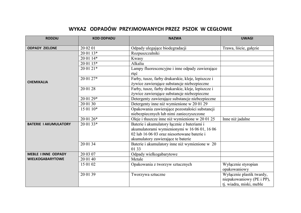WYKAZ ODPADÓW PRZYJMOWANYCH PRZEZ PSZOK W CEGŁOWIE RODZAJ ODPADY ZIELONE CHEMIKALIA KOD ODPADU 20 03 07 20 01 40 15 01 02 Odpady ulegające biodegradacji Rozpuszczalniki Kwasy Alkalia Lampy fluorescencyjne i inne odpady zawierające rtęć Farby, tusze, farby drukarskie, kleje, lepiszcze i żywice zawierające substancje niebezpieczne Farby, tusze, farby drukarskie, kleje, lepiszcze i żywice zawierające substancje niebezpieczne Detergenty zawierające substancje niebezpieczne Detergenty inne niż wymienione w 20 01 29 Opakowania zawierające pozostałości substancji niebezpiecznych lub nimi zanieczyszczone Oleje i tłuszcze inne niż wymienione w 20 01 25 Baterie i akumulatory łącznie z bateriami i akumulatorami wymienionymi w 16 06 01, 16 06 02 lub 16 06 03 oraz niesortowane baterie i akumulatory zawierające te baterie Baterie i akumulatory inne niż wymienione w 20 01 33 Odpady wielkogabarytowe Metale Opakowania z tworzyw sztucznych 20 01 39 Tworzywa sztuczne 20 02 01 20 01 13* 20 01 14* 20 01 15* 20 01 21* 20 01 27* 20 01 28 20 01 29* 20 01 30 15 01 10* BATERIE I AKUMULATORY 20 01 26* 20 01 33* 20 01 34 MEBLE I INNE ODPADY WIELKOGABARYTOWE NAZWA UWAGI Trawa, liście, gałęzie Inne niż jadalne Wyłącznie styropian opakowaniowy Wyłącznie plastik twardy, niepakowaniowy (PE i PP), tj. wiadra, miski, meble ogrodowe, skrzynki, doniczki itp. ODPADY BUDOWLANE I ROZBIÓRKOWE 17 01 01 17 01 07 17 09 04 20 01 02 ZUŻYTY SRPZĘT ELEKTRYCZNY I ELEKTRONICZNY 20 01 23* 20 01 35* 20 01 36 OPONY POCHODZĄCE Z POJAZDÓW O DOPUSZCZALNEJ MASIE CAŁKOWITEJ DO 3,5 T. 16 01 03 Odpady betonu oraz gruz betonowy z rozbiórek i remontów Zmieszane odpady z betonu, gruzu ceglanego, odpadowych materiałów ceramicznych i elementów wyposażenia inne niż wymienione w 17 01 06* Zmieszane odpady z budowy, remontów i demontażu inne niż wymienione w 17 09 01, 17 09 02, 17 09 03 Szkło Urządzenia zawierające freony Zużyte urządzenia elektryczne i elektroniczne inne niż wymienione w 20 01 21 i 20 01 23 i 20 01 35 Zużyte urządzenia elektryczne i elektroniczne inne niż wymienione w 20 01 21, 20 01 23 i 20 01 35 Zużyte opony Inne niż niebezpieczne Wyłącznie niezbrojone szyb drzwiowe, okienne, itp. Z wyłączeniem szyb od pojazdów, zarówno całych jak i rozbitych