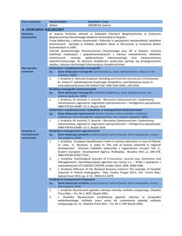 Dane osobowe: Tytuł/stopień doktor Nazwisko i imię GRUBICKA Joanna A. DOROBEK NAUKOWY Sylwetka pracownika Monografie naukowe Artykuły w czasopismach naukowych dr Joanna Grubicka adiunkt w Zakładzie Inżynierii Bezpieczeństwa w Instytucie Bezpieczeństwa Narodowego Akademii Pomorskiej w Słupsku . Pracę doktorską z zakresu Automatyki i Robotyki o specjalności niezawodności obiektów technicznych obroniła w Polskiej Akademii Nauk w Warszawie w Instytucie Badań Systemowych w 2005. Członek akademickiego Stowarzyszenia Oświatowego przy AP w Słupsku. Autorka publikacji naukowych i popularnonaukowych z zakresu niezawodności obiektów technicznych, rozwoju społeczeństwa informacyjnego oraz bezpieczeństwa teleinformatycznego. W obszarze działalności społecznej zajmuje się propagowaniem wiedzy z obszaru technologii informacyjnej i bezpieczeństwa. Autorstwo i współautorstwo monografii Lp. Dane dotyczące monografii (autor/autorzy, tytuł, wydawnictwo, miejsce i rok wydania, ISBN) 1. J. Grubicka E. Matuska Employer branding and Internet security [In:] Christiansen B., Kasarci F. (eds)Corporate Espionage, Geopolitics, and Diplomacy Issues in International Business IGI Global Publ. ISSN 2345-0282, USA 2016 Redakcja monografii wieloautorskich Lp. Dane dotyczące monografii (redaktor/redaktorzy, tytuł, wydawnictwo, rok i miejsce wydania, ISBN) 1. J. Grubicka, M. Koziński, S. Kosznik – Biernacka Cyberprzestrzeń. Uzależnienia, zahamowania, zagrożenia. Zagrożeniz cyberprzestrzeni – Inteligentne specjalizacje, ISBN 978-83-63680 -31-2, Słupsk 2016. Autorstwo i współautorstwo rozdziałów w monografiach wieloautorskich Lp. Dane dotyczące opracowania (autor/ autorzy, tytuł rozdziału, redaktor/ redaktorzy, tytuł monografii, wydawnictwo, rok i miejsce wydania, ISBN) 1 J. Grubicka, M. Koziński, S. Kosznik – Biernacka Cyberprzestrzeń. Uzależnienia, zahamowania, zagrożenia. Zagrożeniz cyberprzestrzeni – Inteligentne specjalizacje, ISBN 978-83-63680 -31-2, Słupsk 2016. Artykuły w czasopismach zagranicznych Lp. Dane dotyczące artykułu (autor/autorzy, tytuł artykułu, tytuł czasopisma, numer, rok wydania, ISSN) 1. J. Grubicka, European Qualification Frame in tertiary education in case of Poland, in: Liśka V., Navickas. V. (eds) in: The role of human potential in regional development (Význam ľudského potenciálu v regionálnom rozvoji.) Vol. 2., Eastern European Development Agency, Podhajska, Slovakia 2011, p. 168-178, ISBN 978-80-970277-8-0 , 2. J. Grubicka, Psychological Security of E-Consumer, Journal Law, Economics and Management3, Východoeurópska agentúra pre rozvoj n.o. – EEDA v spolupráci s vydavateľstvom STS SCIENCE CENTRE London 2012, ISSN: 2048-4186. 3. J. Grubicka Diffusion of the National Business Culture? The example of Swedish impactsh in Poland Andragogika - Rep. Czeska, Praga) 2014., Zlin –Czech Rep., Specjal Issue 2014, pp. 2-13 , ISSN1211-6378. Artykuły w czasopismach krajowych Lp. Dane dotyczące artykułu (autor/autorzy, tytuł artykułu, tytuł czasopisma, numer, rok wydania, ISSN) 1. J. Grubicka Wyznaczanie gęstości odnowy metodą rozkładu zastępczego, Słupskie Prace Mat. – Fiz. Nr 1, WSP, Słupsk 2001. 2. J. Grubicka Wyznaczanie przybliżonej gęstości odnowy w przypadku weibullowskiego rozkładu czasu pracy do uszkodzenia metodą rozkładu zastępczego (cz. II) , Słupskie Prace Mat. – Fiz. Nr 2, PAP Słupsk 2002. 3. 4. 5. 6. 7. 8. 9. 10. 11. 12. 13. 14. 15. 16. 18. 19. J. Grubicka Projektowanie sekwencyjnego planu kontroli niezawodności obiektów wykazujących uszkodzenia wczesne, Słupskie Prace Mat. – Fiz. PAP Słupsk 2007. J. Grubicka, Analiza wyznaczenia gęstości odnowy w procesie odnowy z udziałem obiektów , w których czasy pracy do uszkodzenia mają rozkład Weibulla metodą rozkładu zastępczego, Acta Pomerania, nr 1 Chojnice, 2008 s.240-253. J. Grubicka Wyznaczanie gęstości odnowy metodą rozkładu zastępczego, Słupskie Prace Mat. – Fiz. Nr 1, WSP, Słupsk 2001. J. Grubicka, Sequential reliability compliance test for the decreasing failure rate, Acta Pomerania, nr 2 Chojnice 2009, s. 215 – 224. J. Grubicka, The sequence project of the control plan of the reliability of the Weibull model distribution, w: Stroiński M., Węglarz J., Wojciechowski K. (red.), Computational Methods in Science and Technology Vol.16(2), p. 135-139. Scientific Publishers OWN, Poznań, 2010. ISSN 1505-0602. J. Grubicka, Wykorzystanie narzędzi technologii informatycznej w edukacji dla bezpieczeństwa, w: Sienkiewicz P, Marszałek M., Świeboda H. (red.), Metodologia badań bezpieczeństwa narodowego, tom I, , AON, Warszawa 2010. ISBN 978- 837523-114-4 s. 157-167. J. Grubicka, Przeciwdziałanie wiktymizacji zagrożeń internetowych – bezpieczeństwo, w: Maciejewski T., Biernat T., Gierszewski J. (red.), Acta Pomerania, nr 3, 155 – 164.Chojnice 2011, ISSN 2080-6183 ISBN 978- 83-6209726-5. J. Grubicka, Perspectives and destynies of Polish graduates on Polish and European job market – International Conference ; Adaptability of higher education graduates on labour market – chances & challenges, 23-24.05.2011, Chojnice 2011. J. Grubicka, Człowiek jako ważne ogniwo zapewnienia bezpieczeństwa informatycznego jednostce administracyjnej, w: Chrabkowski M, Tatarczuk C., Tomaszewski J. (red.), Bezpieczeństwo w administracji i biznesie we współczesnym świecie, część II, 126-136WSAiB, Gdynia 2011,. ISBN 978- 83-6150580-8. J. Grubicka, Zastosowanie informatyki w bezpieczeństwie modelowania danych kohortowych w procesie przeżycia, w: Frydrychowicz W., Rumianowski R. (red.), Informatyka w medycynie, s. 125-140, Ciechanów 2012. ISBN-978-83-920240-7-1. J. Grubicka, Bezpieczeństwo państwa polskiego wobec cyberterroryzmemu, w: Sienkiewicz P, Marszałek M., Świeboda H. (red.), Metodologia badań bezpieczeństwa narodowego, AON, Warszawa 2012. J. Grubicka, Bezpieczeństwo danych osobowych w administracji samorząd