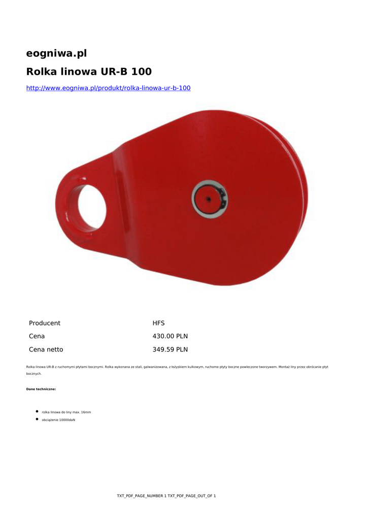 eogniwa.pl Rolka linowa UR-B 100 http://www.eogniwa.pl/produkt/rolka-linowa-ur-b-100 Producent HFS Cena 430.00 PLN Cena netto 349.59 PLN Rolka linowa UR-B z ruchomymi płytami bocznymi. Rolka wykonana ze stali, galwanizowana, z łożyskiem kulkowym, ruchome płyty boczne powleczone tworzywem. Montaż liny przez obrócanie płyt bocznych. Dane techniczne: rolka linowa do liny max. 16mm obciążenie 10000daN TXT_PDF_PAGE_NUMBER 1 TXT_PDF_PAGE_OUT_OF 1