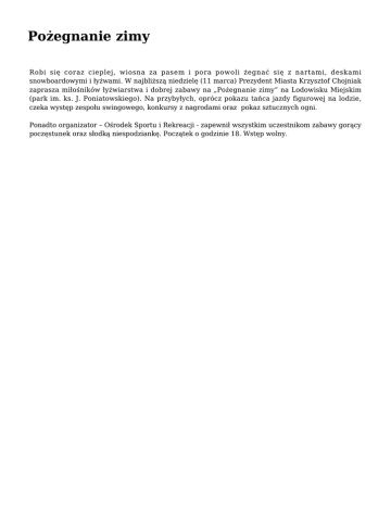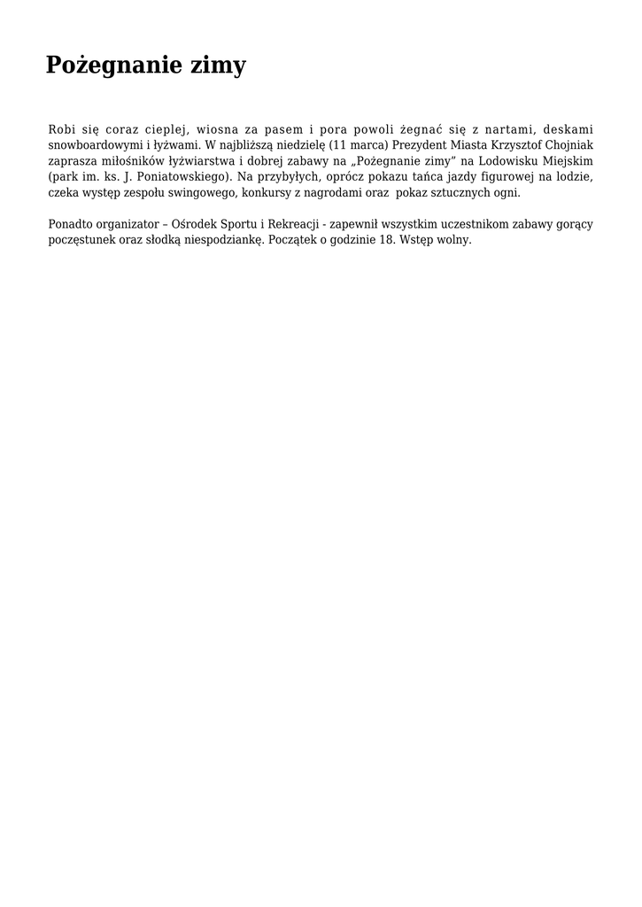 Pożegnanie zimy Robi się coraz cieplej, wiosna za pasem i pora powoli żegnać się z nartami, deskami snowboardowymi i łyżwami. W najbliższą niedzielę (11 marca) Prezydent Miasta Krzysztof Chojniak zaprasza miłośników łyżwiarstwa i dobrej zabawy na „Pożegnanie zimy” na Lodowisku Miejskim (park im. ks. J. Poniatowskiego). Na przybyłych, oprócz pokazu tańca jazdy figurowej na lodzie, czeka występ zespołu swingowego, konkursy z nagrodami oraz pokaz sztucznych ogni. Ponadto organizator – Ośrodek Sportu i Rekreacji - zapewnił wszystkim uczestnikom zabawy gorący poczęstunek oraz słodką niespodziankę. Początek o godzinie 18. Wstęp wolny.