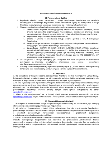 Regulamin Bezpłatnego Newslettera §1 Postanowienia Ogólne 1. Regulamin określa zasady korzystania z usługi bezpłatnego Newslettera na zasadach wynikających z niniejszego Regulaminu. Przed wyrażeniem zgody na korzystanie z usługi Klient jest zobowiązany do uważnego zapoznania się z niniejszym Regulaminem. 2. Dla potrzeb niniejszego Regulaminu następujące pojęcia otrzymują znaczenie: a. Klient – osoba fizyczna posiadającą pełną zdolność do czynności prawnych, osoba prawna lub jednostka organizacyjna nieposiadająca osobowości prawnej, której ustawa przyznaje zdolność prawną, która korzysta z usługi bezpłatnego newslettera, b. Regulamin – Regulamin Bezpłatnego Newslettera, c. Umowa – umowa o świadczenie Usługi zawarta zgodnie z ust. 4 niniejszego Regulaminu, d. Usługa – usługa świadczoną drogą elektroniczną przez Usługodawcę na rzecz Klienta, polegającą na przesyłaniu Bezpłatnego Newslettera, e. Usługodawca – KOTRAK BIS IRENA I ANDRZEJ KURDZIEL SPÓŁKA JAWNA z siedzibą w Katowicach (40-582) przy ul. Parczewskiego 25. Spółka jest wpisana do Krajowego Rejestru Sądowego powadzonego przez Sąd Rejonowy Katowice - Wschód, XVIII Wydział Gospodarczy Krajowego Rejestru Sądowego pod nr KRS 0000050477, NIP 9542496628, REGON 277683949. 3. Do korzystania z Usługi wymagany jest komputer lub inne urządzenie multimedialne z dostępem do Internetu, przeglądarka internetowa oraz czynna i prawidłowo skonfigurowana poczta elektroniczna. 4. Z chwilą zakończenia procedury rejestracji opisanej w par. §2, Klient zawiera z Usługodawcą Umowę na czas nieoznaczony. Umowa wygasa z chwilą wyrejestrowania Klienta. §2 Rejestracja 1. Do korzystania z Usługi konieczna jest rejestracja Klienta w module mailingowym Usługodawcy. Rejestracja stanowi wyrażenie zgody na otrzymywanie Usługi, a także potwierdza zapoznanie się i akceptację Regulaminu, prawidłowość wprowadzonych danych rejestracyjnych. 2. W celu rejestracji Klient wprowadza wymagane dane i informacje za pomocą formularza rejestracji zamieszczonego na stronie internetowej Usługodawcy, w szczególności podaje adres swojej poczty elektronicznej. Po właściwym dokonaniu rejestracji Klient otrzymuje na wskazany adres mailowy potwierdzenie rejestracji. Wszelkie zmiany danych Klient zgłasza Usługodawcy na adres [email protected] 3. Klient może wyrejestrować się w każdej chwili poprzez przesłanie wiadomości na adres [email protected], co jest równoznaczne z rozwiązaniem Umowy ze skutkiem natychmiastowym. §3 Obowiązki i odpowiedzialność 1. W związku ze świadczeniem Usługi Usługodawca jest zobowiązany do świadczenia jej z należytą starannością oraz przestrzegając niniejszego Regulaminu. 2. W związku z korzystaniem z Usługi, Klient zobowiązany jest do przestrzegania Regulaminu, prawidłowego określenia i aktualizowania danych, a także niezwłocznego informowania Usługodawcy o wszelkich ewentualnych naruszeniach bezpieczeństwa i problemach związanych z funkcjonowaniem lub korzystaniem z Usługi. 3. Klienta obowiązuje zakaz dostarczania treści o charakterze bezprawnym, a także wykorzystywania modułu mailingowego bezpośrednio lub pośrednio do prowadzenia jakichkolwiek działań sprzecznych z prawem, dobrymi obyczajami, zasadami korzystania z Internetu, lub naruszających prawa osób trzecich, czy prowadzenia jakichkolwiek działań zagrażających bezpieczeństwu modułu mailingowego. 1 4. W przypadku naruszenia któregokolwiek z postanowień Regulaminu, zwłaszcza ust. 3, Usługodawca jest uprawniony do wypowiedzenia Umowy ze skutkiem natychmiastowym, co będzie skutkowało wyrejestrowaniem. 5. Usługodawca ma w każdym czasie prawo do dokonania zmian, modyfikacji lub zaprzestania przesyłania newslettera bez wcześniejszego powiadomienia. Podjęcie działań wskazanych w zdaniu poprzedzającym nie stanowi podstawy do jakichkolwiek roszczeń ze strony Klientów. 6. Usługodawca nie będzie ponosił odpowiedzialności z tytułu szkód wyrządzonych Klientowi w związku z wadami (usterkami) newslettera, brakiem działania lub niewłaściwym działaniem, awariami, w tym brakiem możliwości korzystania lub błędnym działaniem Usługi. §4 Reklamacja 1. Reklamacje związane ze świadczeniem Usługi należy składać listownie na adres siedziby Usługodawcy lub elektronicznie na adres poczty elektronicznej. Reklamacja powinna zawierać następujące dane Klienta: imię, nazwisko, adres poczty elektronicznej podany przy rejestracji oraz opis problemu. Jeżeli dane Klienta będą niekompletne Usługodawca zwróci się z prośbą o ich uzupełnienie w wyznaczonym terminie. 2. Usługodawca rozpatrzy reklamację w terminie do 14 dni roboczych od dnia jej otrzymania albo otrzymania uzupełnionych danych klienta, o których mowa w ust. 16 i udzieli Klientowi odpowiedzi w sprawie reklamacji. Odpowiedź zostanie przesłana w takiej samej formie, w jakiej została złożona. §5 Postanowienia końcowe. 1. Administratorem danych osobowych Klientów w rozumieniu ustawy z dnia 29 sierpnia 1997 r. o ochronie danych osobowych odnośnie do danych osobowych Klientów jest Usługodawca. Dane przetwarzane są w celach określonych w Regulaminie. Podanie danych jest dobrowolne, jednak niezbędne do świadczenia Usługi. Klientowi, którego dane dotyczą, przysługuje prawo dostępu do treści swoich danych, ich poprawienia lub wycofania w każdej chwili. 2. Usługodawca może przetwarzać dane osobowe Klienta w celach marketingowych oraz przesyłać informacje handlowe swoje oraz osób trzecich na adres wskazany w rejestracji. Zgoda, o której mowa w zdaniu poprzednim może być cofnięta poprzez przesłanie odpowiedniej wiadomości na adres poczty elektronicznej Usługodawcy [email protected] 3. Usługodawca jest uprawiony do wprowadzenia zmian w postanowieniach Regulaminu w każdym czasie i zależnie od własnej decyzji poprzez umieszczenie go na stronie internetowej www.