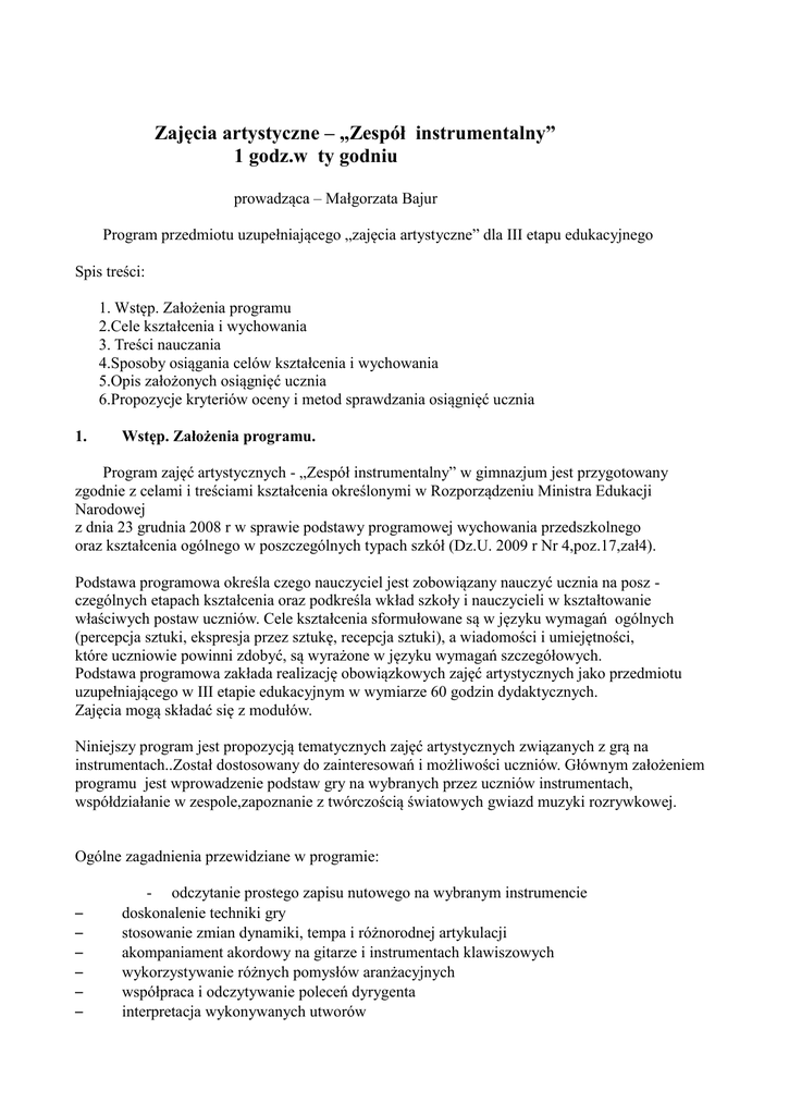 Zajęcia artystyczne – „Zespół instrumentalny” 1 godz.w ty godniu prowadząca – Małgorzata Bajur Program przedmiotu uzupełniającego „zajęcia artystyczne” dla III etapu edukacyjnego Spis treści: 1. Wstęp. Założenia programu 2.Cele kształcenia i wychowania 3. Treści nauczania 4.Sposoby osiągania celów kształcenia i wychowania 5.Opis założonych osiągnięć ucznia 6.Propozycje kryteriów oceny i metod sprawdzania osiągnięć ucznia 1. Wstęp. Założenia programu. Program zajęć artystycznych - „Zespół instrumentalny” w gimnazjum jest przygotowany zgodnie z celami i treściami kształcenia określonymi w Rozporządzeniu Ministra Edukacji Narodowej z dnia 23 grudnia 2008 r w sprawie podstawy programowej wychowania przedszkolnego oraz kształcenia ogólnego w poszczególnych typach szkół (Dz.U. 2009 r Nr 4,poz.17,zał4). Podstawa programowa określa czego nauczyciel jest zobowiązany nauczyć ucznia na posz czególnych etapach kształcenia oraz podkreśla wkład szkoły i nauczycieli w kształtowanie właściwych postaw uczniów. Cele kształcenia sformułowane są w języku wymagań ogólnych (percepcja sztuki, ekspresja przez sztukę, recepcja sztuki), a wiadomości i umiejętności, które uczniowie powinni zdobyć, są wyrażone w języku wymagań szczegółowych. Podstawa programowa zakłada realizację obowiązkowych zajęć artystycznych jako przedmiotu uzupełniającego w III etapie edukacyjnym w wymiarze 60 godzin dydaktycznych. Zajęcia mogą składać się z modułów. Niniejszy program jest propozycją tematycznych zajęć artystycznych związanych z grą na instrumentach..Został dostosowany do zainteresowań i możliwości uczniów. Głównym założeniem programu jest wprowadzenie podstaw gry na wybranych przez uczniów instrumentach, współdziałanie w zespole,zapoznanie z twórczością światowych gwiazd muzyki rozrywkowej. Ogólne zagadnienia przewidziane w programie: – – – – – – - odczytanie prostego zapisu nutowego na wybranym instrumencie doskonalenie techniki gry stosowanie zmian dynamiki, tempa i różnorodnej artykulacji akompaniament akordowy na gitarze i instrumentach klawiszowych wykorzystywanie różnych pomysłów aranżacyjnych współpraca i odczytywanie poleceń dyrygenta interpretacja wykonywanych utworów – – – – – zapoznanie z utworami i wykonawcami słuchanymi przez uczniów _ zapoznanie z wartościową muzyką rozrywkową czołowi twórcy polscy i zagraniczni wybór repertuaru do występu przygotowanie do występu solowego i w zespole występ końcoworoczny 2. Szczegółowe cele kształcenia i wychowania – wymagania ogólne Cele edukacyjne programu zostały sformułowane zgodnie z założeniami podstawy programowej z zajęć artystycznych na trzecim etapie edukacyjnym. Cele kształcenia: - Odbiór wypowiedzi i wykorzystanie zawartych w nich informacji – percepcja sztuki. - Tworzenie wypowiedzi – ekspresja przez sztukę. - Analiza i interpretacja tekstów kultury – recepcja sztuki. Cele edukacyjne założonego programu nauczania: - wprowadzenie ucznia w świat kultury i sztuki - budzenie i rozwijanie potrzeby czynnego uczestnictwa w kulturze poprzez słuchanie najlepszych wykonań światowego dorobku muzyki rozrywkowej i samodzielne występy – estradowe - rozwijanie twórczego myślenia, kreatywności,własnych możliwości twórczych - rozbudzanie i rozwijanie indywidualnych zainteresowań uczniów. – kształtowanie systematyczności, obowiązkowości oraz umiejętności współdziałania w grupie – ułatwienie kontaktu z muzyką oraz podniesienie kultury muzycznej środowiska 3. Treści nauczania – wymagania szczegółowe a) Odbiór wypowiedzi i wykorzystanie zawartych w nich informacji – percepcja sztuki Uczeń: - uczestniczy w kulturze poprzez kontakt ze światowym dorobkiem muzyki rozrywkowej - ma świadomość różnorodności sztuki i wzajemnych powiązań jej różnych dziedzin - potrafi formułować opinię, porównywać i wartościować szeroko rozumianą sztukę b) Tworzenie wypowiedzi – ekspresja przez sztukę. Uczeń: - podejmuje działalność twórczą z wykorzystaniem dostępnych środków technicznych - poszukuje różnorodnych możliwości ekspresji we własnych działaniach artystycznych - wykazuje się umiejętnością twórczego myślenia, kreatywnością, realizuje oryginalne projekty c) Analiza i interpretacja tekstów kultury – recepcja sztuki. Uczeń: – zna wybrane utwory klasyki rozrywkowej – rozpoznaje znanych twórców światowych scen estradowych – świadomie wybiera utwory muzyczne,śledzi na bieżąco dorobek muzyki rozrywkowej – dostrzega i analizuje różne konteksty dzieł kultury – zna podstawowe pojęcia i terminy muzyczne – wyszukuje potrzebne informacje zawarte w tekstach kultury – wykazuje się umiejętnością analizy utworu instrumentalnego – podejmuje próbę oceny jego wartości 4. Sposoby osiągania celów kształcenia i wychowania Metody nauczania dostosowane są do percepcji i recepcji prezentowanych utworów oraz działalności twórczej uczniów : - prezentacja utworów - miniwykład, pogadanka, dyskusja - kontakt z dziełem sztuki poprzez oglądanie i kształtowanie umiejętności ich opisywania - działania rozwijające wyobrażnię i twórcze myślenie - projekt edukacyjny -prezentacja przygotowanych utworów -udział w konkursach i występach szkolnych i pozaszkolnych 5. Opis założonych osiągnięć ucznia Wiadomości i umiejętności. Uczeń: - potrafi odczytać prosty zapis nutowy na wybranym instrumencie - zna najważniejsze w historii muzyki rozrywkowej tytuły utworów i nazwiska wykonawców -wykazuje się umiejętnością analizy poznanych utworów – dostrzega poszczególne elementy utworów, porównuje, znajduje wzajemne związki i podsumowuje zebrane informacje - dokonuje oceny wartości prezentowanych utworów - wyszukuje potrzebne informacje zawarte w tekstach kultury - wykorzystuje w pracy tw
