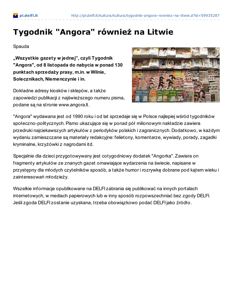 pl.delfi.lt http://pl.delfi.lt/kultura/kultura/tygodnik-angora-rowniez-na-litwie.d?id=59935287 Tygodnik "Angora" również na Litwie Spauda „Wszyst kie gazet y w jednej”, czyli Tygodnik "Angora", od 8 list opada do nabycia w ponad 130 punkt ach sprzedaży prasy, m.in. w Wilnie, Solecznikach, Niemenczynie i in. Dokładne adresy kiosków i sklepów, a także zapowiedzi publikacji z najświeższego numeru pisma, podane są na stronie www.angora.lt. "Angora" wydawana jest od 1990 roku i od lat sprzedaje się w Polsce najlepiej wśród tygodników społeczno-politycznych. Pismo ukazujące się w ponad pół milionowym nakładzie zawiera przedruki najciekawszych artykułów z periodyków polskich i zagranicznych. Dodatkowo, w każdym wydaniu zamieszczane są materiały redakcyjne: felietony, komentarze, wywiady, porady, zagadki kryminalne, krzyżówki z nagrodami itd. Specjalnie dla dzieci przygotowywany jest cotygodniowy dodatek "Angorka". Zawiera on fragmenty artykułów ze znanych gazet omawiające wydarzenia na świecie, napisane w przystępny dla młodych czytelników sposób, a także humor i rozrywkę dobrane pod kątem wieku i zainteresowań młodzieży. Wszelkie informacje opublikowane na DELFI zabrania się publikować na innych portalach internetowych, w mediach papierowych lub w inny sposób rozpowszechniać bez zgody DELFI. Jeśli zgoda DELFI zostanie uzyskana, trzeba obowiązkowo podać DELFI jako źródło.