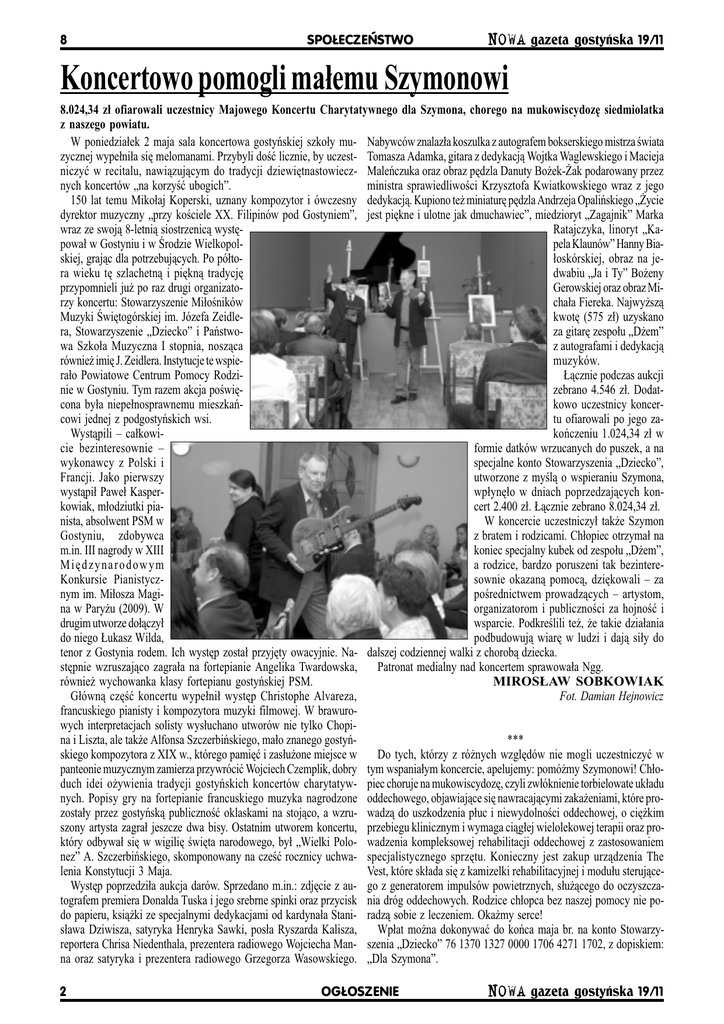 8 SPO£ECZEÑSTWO NOWA gazeta gostyñska 19/11 Koncertowo pomogli ma³emu Szymonowi 8.024,34 z³ ofiarowali uczestnicy Majowego Koncertu Charytatywnego dla Szymona, chorego na mukowiscydozê siedmiolatka z naszego powiatu. W poniedzia³ek 2 maja sala koncertowa gostyñskiej szko³y mu- Nabywców znalaz³a koszulka z autografem bokserskiego mistrza wiata zycznej wype³ni³a siê melomanami. Przybyli doæ licznie, by uczest- Tomasza Adamka, gitara z dedykacj¹ Wojtka Waglewskiego i Macieja niczyæ w recitalu, nawi¹zuj¹cym do tradycji dziewiêtnastowiecz- Maleñczuka oraz obraz pêdzla Danuty Bo¿ek-¯ak podarowany przez nych koncertów na korzyæ ubogich. ministra sprawiedliwoci Krzysztofa Kwiatkowskiego wraz z jego 150 lat temu Miko³aj Koperski, uznany kompozytor i ówczesny dedykacj¹. Kupiono te¿ miniaturê pêdzla Andrzeja Opaliñskiego ¯ycie dyrektor muzyczny przy kociele XX. Filipinów pod Gostyniem, jest piêkne i ulotne jak dmuchawiec, miedzioryt Zagajnik Marka wraz ze swoj¹ 8-letni¹ siostrzenic¹ wystêRatajczyka, linoryt Kapowa³ w Gostyniu i w rodzie Wielkopolpela Klaunów Hanny Biaskiej, graj¹c dla potrzebuj¹cych. Po pó³to³oskórskiej, obraz na jera wieku tê szlachetn¹ i piêkn¹ tradycjê dwabiu Ja i Ty Bo¿eny przypomnieli ju¿ po raz drugi organizatoGerowskiej oraz obraz Mirzy koncertu: Stowarzyszenie Mi³oników cha³a Fiereka. Najwy¿sz¹ Muzyki wiêtogórskiej im. Józefa Zeidlekwotê (575 z³) uzyskano ra, Stowarzyszenie Dziecko i Pañstwoza gitarê zespo³u D¿em wa Szko³a Muzyczna I stopnia, nosz¹ca z autografami i dedykacj¹ równie¿ imiê J. Zeidlera. Instytucje te wspiemuzyków. ra³o Powiatowe Centrum Pomocy Rodzi£¹cznie podczas aukcji nie w Gostyniu. Tym razem akcja powiêzebrano 4.546 z³. Dodatcona by³a niepe³nosprawnemu mieszkañkowo uczestnicy koncercowi jednej z podgostyñskich wsi. tu ofiarowali po jego zaWyst¹pili ca³kowikoñczeniu 1.024,34 z³ w cie bezinteresownie formie datków wrzucanych do puszek, a na wykonawcy z Polski i specjalne konto Stowarzyszenia Dziecko, Francji. Jako pierwszy utworzone z myl¹ o wspieraniu Szymona, wyst¹pi³ Pawe³ Kasperwp³ynê³o w dniach poprzedzaj¹cych konkowiak, m³odziutki piacert 2.400 z³. £¹cznie zebrano 8.024,34 z³. nista, absolwent PSM w W koncercie uczestniczy³ tak¿e Szymon Gostyniu, zdobywca z bratem i rodzicami. Ch³opiec otrzyma³ na m.in. III nagrody w XIII koniec specjalny kubek od zespo³u D¿em, Miêdzynarodowym a rodzice, bardzo poruszeni tak bezintereKonkursie Pianistyczsownie okazan¹ pomoc¹, dziêkowali za nym im. Mi³osza Magiporednictwem prowadz¹cych artystom, na w Pary¿u (2009). W organizatorom i publicznoci za hojnoæ i drugim utworze do³¹czy³ wsparcie. Podkrelili te¿, ¿e takie dzia³ania do niego £ukasz Wilda, podbudowuj¹ wiarê w ludzi i daj¹ si³y do tenor z Gostynia rodem. Ich wystêp zosta³ przyjêty owacyjnie. Na- dalszej codziennej walki z chorob¹ dziecka. stêpnie wzruszaj¹co zagra³a na fortepianie Angelika Twardowska, Patronat medialny nad koncertem sprawowa³a Ngg. MIROS£AW SOBKOWIAK równie¿ wychowanka klasy fortepianu gostyñskiej PSM. Fot. Damian Hejnowicz G³ówn¹ czêæ koncertu wype³ni³ wystêp Christophe Alvareza, francuskiego pianisty i kompozytora muzyki filmowej. W brawurowych interpretacjach solisty wys³uchano utworów nie tylko Chopi*** na i Liszta, ale tak¿e Alfonsa Szczerbiñskiego, ma³o znanego gostyñDo tych, którzy z ró¿nych wzglêdów nie mogli uczestniczyæ w skiego kompozytora z XIX w., którego pamiêæ i zas³u¿one miejsce w panteonie muzycznym zamierza przywróciæ Wojciech Czemplik, dobry tym wspania³ym koncercie, apelujemy: pomó¿my Szymonowi! Ch³oduch idei o¿ywienia tradycji gostyñskich koncertów charytatyw- piec choruje na mukowiscydozê, czyli zw³óknienie torbielowate uk³adu nych. Popisy gry na fortepianie francuskiego muzyka nagrodzone oddechowego, objawiaj¹ce siê nawracaj¹cymi zaka¿eniami, które prozosta³y przez gostyñsk¹ publicznoæ oklaskami na stoj¹co, a wzru- wadz¹ do uszkodzenia p³uc i niewydolnoci oddechowej, o ciê¿kim szony artysta zagra³ jeszcze dwa bisy. Ostatnim utworem koncertu, przebiegu klinicznym i wymaga ci¹g³ej wielolekowej terapii oraz proktóry odbywa³ siê w wigiliê wiêta narodowego, by³ Wielki Polo- wadzenia kompleksowej rehabilitacji oddechowej z zastosowaniem nez A. Szczerbiñskiego, skomponowany na czeæ rocznicy uchwa- specjalistycznego sprzêtu. Konieczny jest zakup urz¹dzenia The Vest, które sk³ada siê z kamizelki rehabilitacyjnej i modu³u steruj¹celenia Konstytucji 3 Maja. Wystêp poprzedzi³a aukcja darów. Sprzedano m.in.: zdjêcie z au- go z generatorem impulsów powietrznych, s³u¿¹cego do oczyszczatografem premiera Donalda Tuska i jego srebrne spinki oraz przycisk nia dróg oddechowych. Rodzice ch³opca bez naszej pomocy nie podo papieru, ksi¹¿ki ze specjalnymi dedykacjami od kardyna³a Stani- radz¹ sobie z leczeniem. Oka¿my serce! Wp³at mo¿na dokonywaæ do koñca maja br. na konto Stowarzys³awa Dziwisza, satyryka Henryka Sawki, pos³a Ryszarda Kalisza, reportera Chrisa Niedenthala, prezentera radiowego Wojciecha Man- szenia Dziecko 76 1370 1327 0000 1706 4271 1702, z dopiskiem: na oraz satyryka i prezentera radiowego Grzegorza Wasowskiego. Dla Szymona. 2 OG£OSZENIE NOWA gazeta gostyñska 19/11