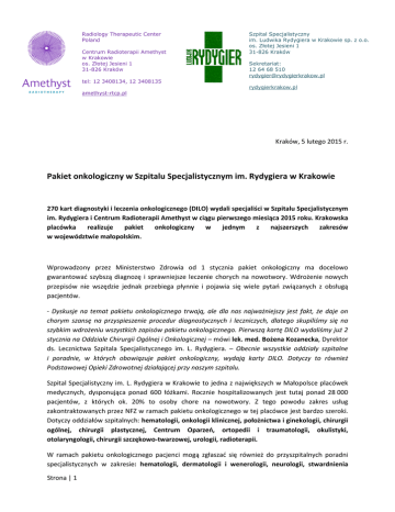 Radiology Therapeutic Center Poland Centrum Radioterapii Amethyst w Krakowie os. Złotej Jesieni 1 31-826 Kraków Szpital Specjalistyczny im. Ludwika Rydygiera w Krakowie sp. z o.o. os. Złotej Jesieni 1 31-826 Kraków Sekretariat: 12 64 68 510 [email protected] tel: 12 3408134, 12 3408135 rydygierkrakow.pl amethyst-rtcp.pl Kraków, 5 lutego 2015 r. Pakiet onkologiczny w Szpitalu Specjalistycznym im. Rydygiera w Krakowie 270 kart diagnostyki i leczenia onkologicznego (DILO) wydali specjaliści w Szpitalu Specjalistycznym im. Rydygiera i Centrum Radioterapii Amethyst w ciągu pierwszego miesiąca 2015 roku. Krakowska placówka realizuje pakiet onkologiczny w jednym z najszerszych zakresów w województwie małopolskim. Wprowadzony przez Ministerstwo Zdrowia od 1 stycznia pakiet onkologiczny ma docelowo gwarantować szybszą diagnozę i sprawniejsze leczenie chorych na nowotwory. Wdrożenie nowych przepisów nie wszędzie jednak przebiega płynnie i pojawia się wiele pytań związanych z obsługą pacjentów. - Dyskusje na temat pakietu onkologicznego trwają, ale dla nas najważniejszy jest fakt, że daje on chorym szansę na przyspieszenie procedur diagnostycznych i leczniczych, dlatego skupiliśmy się na szybkim wdrożeniu wszystkich zapisów pakietu onkologicznego. Pierwszą kartę DILO wydaliśmy już 2 stycznia na Oddziale Chirurgii Ogólnej i Onkologicznej – mówi lek. med. Bożena Kozanecka, Dyrektor ds. Lecznictwa Szpitala Specjalistycznego im. L. Rydygiera. – Obecnie wszystkie oddziały szpitalne i poradnie, w których obowiązuje pakiet onkologiczny, wydają karty DILO. Dotyczy to również Podstawowej Opieki Zdrowotnej działającej przy naszym szpitalu. Szpital Specjalistyczny im. L. Rydygiera w Krakowie to jedna z największych w Małopolsce placówek medycznych, dysponująca ponad 600 łóżkami. Rocznie hospitalizowanych jest tutaj ponad 28 000 pacjentów, z których ok. 20% to osoby chore na nowotwory. Z tego powodu zakres usług zakontraktowanych przez NFZ w ramach pakietu onkologicznego w tej placówce jest bardzo szeroki. Dotyczy oddziałów szpitalnych: hematologii, onkologii klinicznej, położnictwa i ginekologii, chirurgii ogólnej, chirurgii plastycznej, Centrum Oparzeń, ortopedii i traumatologii, okulistyki, otolaryngologii, chirurgii szczękowo-twarzowej, urologii, radioterapii. W ramach pakietu onkologicznego pacjenci mogą zgłaszać się również do przyszpitalnych poradni specjalistycznych w zakresie: hematologii, dermatologii i wenerologii, neurologii, stwardnienia Strona | 1 rozsianego, onkologii, radioterapii i brachyterapii, położnictwa i ginekologii, chirurgii ogólnej, proktologii, okulistyki, otolaryngologii, chirurgii szczękowo-twarzowej, urologii. Powołane zostało specjalne stanowisko koordynatora ds. pacjenta onkologicznego, a w rejestracji uruchomiono dwa odrębne okienka dla pacjentów z kartą DILO. Amethyst też z pakietem onkologicznym Pierwszą kartę DILO Centrum Radioterapii Amethyst wystawiło 7 stycznia. Połowę z dotąd wydanych kart otrzymali pacjenci, którzy rozpoczęli leczenie przed 1 stycznia i karta tylko sankcjonuje ich status chorych onkologicznie. Docelowo 80% pacjentów Centrum będzie leczyło się w ramach pakietu onkologicznego. Zdecydowanie wolniej pojawiają się w Centrum Radioterapii Amethyst pacjenci z już wydaną kartą w zewnętrznych placówkach medycznych. Na razie było ich tylko 10. - Najbardziej niepokojące jest to, że wszystkie 10 kart było źle wystawionych. Jedna z pacjentek musiała jeszcze raz jechać do lekarza, który kartę wystawił – mówi Robert Maślankowski, dyrektor operacyjny Centrum Radioterapii Amethyst. – Wydaje się, że w wielu placówkach zabrakło szkolenia z zakresu nowych dokumentów. Dla nas ta sytuacja też nie jest łatwa. System, w którym generujemy karty, często się zawiesza, logowanie trwa bardzo długo. Z tego powodu wypełnienie dość prostego dokumentu nierzadko zajmuje ponad godzinę. Wiele spraw wymaga wyjaśnienia, bo karta nie przewiduje licznych komplikacji, które mogą się wiązać z procesem leczenia onkologicznego. Pytania czekają na odpowiedzi Wdrożenie pakietu onkologicznego jest wielkim, niezwykle skomplikowanym przedsięwzięciem. Przepisy unormowały podstawowe zagadnienia, ale w wielu wypadkach pozostawiły luki albo są nieprecyzyjne. Przedstawiciele Szpitala Specjalistycznego im. Rydygiera w Krakowie już w połowie grudnia skierowali do NFZ pierwszą listę 29 pytań dotyczących pakietu onkologicznego. W połowie stycznia dołączyli drugą, która wynika z praktycznych doświadczeń dotyczących obsługi chorych. Kolejna lista zawiera 13 istotnych pytań i wniosków. Do tego momentu zarząd szpitala nie otrzymał odpowiedzi na żadną z wątpliwości czy uwag. Spisane w Szpitalu Specjalistycznym im. L. Rydygiera uwagi dotyczą różnych kwestii, wśród których do jednej z ważniejszy należy wykluczenie z pakietu onkologicznego części specjalizacji. Dotyczy to m.in. chorób wewnętrznych (tu szczególnie istotne pytanie – czy w przypadku powikłań można hospitalizować pacjenta z kartą DILO na oddziale wewnętrznym?), geriatrii, rehabilitacji (niezbędna wydaje się w pakiecie chociażby ścieżka rehabilitacyjno-onkologiczna dla pacjentek po mastektomii), dermatologii stacjonarnej (pakiet onkologiczny z nowotworów skóry obejmuje wyłącznie czerniaka), opieki paliatywnej. Szpital wnioskuje również o rozszerzenie zakresu chorób leczonych w ramach pakietu na oddziałach onkologicznych. Z niewiadomych przyczyn pakiet obejmuje tylko jedną z grup chorobowych. Styczniowe pytania mają wiele praktycznych aspektów związanych z pracą biurową i proceduralnymi formalnościami. Krakowski szpital wnioskuje o możliwość wypełniania rubryk karty diagnostyki i leczenia onkologicznego w wersji elektronicznej, w tym przede wszystkim informacji medycznych. Zgodnie z obecnymi funkcjonalnościami wszelkie dane medyczne należy uzu