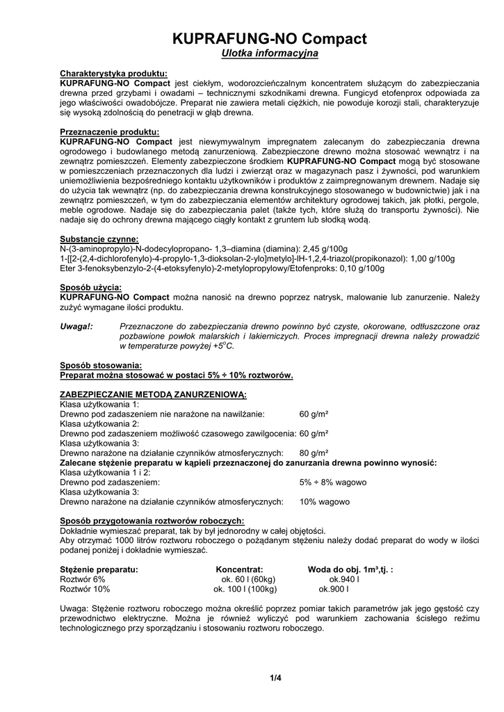 KUPRAFUNG-NO Compact Ulotka informacyjna Charakterystyka produktu: KUPRAFUNG-NO Compact jest ciekłym, wodorozcieńczalnym koncentratem służącym do zabezpieczania drewna przed grzybami i owadami – technicznymi szkodnikami drewna. Fungicyd etofenprox odpowiada za jego właściwości owadobójcze. Preparat nie zawiera metali ciężkich, nie powoduje korozji stali, charakteryzuje się wysoką zdolnością do penetracji w głąb drewna. Przeznaczenie produktu: KUPRAFUNG-NO Compact jest niewymywalnym impregnatem zalecanym do zabezpieczania drewna ogrodowego i budowlanego metodą zanurzeniową. Zabezpieczone drewno można stosować wewnątrz i na zewnątrz pomieszczeń. Elementy zabezpieczone środkiem KUPRAFUNG-NO Compact mogą być stosowane w pomieszczeniach przeznaczonych dla ludzi i zwierząt oraz w magazynach pasz i żywności, pod warunkiem uniemożliwienia bezpośredniego kontaktu użytkowników i produktów z zaimpregnowanym drewnem. Nadaje się do użycia tak wewnątrz (np. do zabezpieczania drewna konstrukcyjnego stosowanego w budownictwie) jak i na zewnątrz pomieszczeń, w tym do zabezpieczania elementów architektury ogrodowej takich, jak płotki, pergole, meble ogrodowe. Nadaje się do zabezpieczania palet (także tych, które służą do transportu żywności). Nie nadaje się do ochrony drewna mającego ciągły kontakt z gruntem lub słodką wodą. Substancje czynne: N-(3-aminopropylo)-N-dodecylopropano- 1,3–diamina (diamina): 2,45 g/100g 1-[[2-(2,4-dichlorofenylo)-4-propylo-1,3-dioksolan-2-ylo]metylo]-lH-1,2,4-triazol(propikonazol): 1,00 g/100g Eter 3-fenoksybenzylo-2-(4-etoksyfenylo)-2-metylopropylowy/Etofenproks: 0,10 g/100g Sposób użycia: KUPRAFUNG-NO Compact można nanosić na drewno poprzez natrysk, malowanie lub zanurzenie. Należy zużyć wymagane ilości produktu. Uwaga!: Przeznaczone do zabezpieczania drewno powinno być czyste, okorowane, odtłuszczone oraz pozbawione powłok malarskich i lakierniczych. Proces impregnacji drewna należy prowadzić o w temperaturze powyżej +5 C. Sposób stosowania: Preparat można stosować w postaci 5% ÷ 10% roztworów. ZABEZPIECZANIE METODĄ ZANURZENIOWĄ: Klasa użytkowania 1: Drewno pod zadaszeniem nie narażone na nawilżanie: 60 g/m² Klasa użytkowania 2: Drewno pod zadaszeniem możliwość czasowego zawilgocenia: 60 g/m² Klasa użytkowania 3: Drewno narażone na działanie czynników atmosferycznych: 80 g/m² Zalecane stężenie preparatu w kąpieli przeznaczonej do zanurzania drewna powinno wynosić: Klasa użytkowania 1 i 2: Drewno pod zadaszeniem: 5% ÷ 8% wagowo Klasa użytkowania 3: Drewno narażone na działanie czynników atmosferycznych: 10% wagowo Sposób przygotowania roztworów roboczych: Dokładnie wymieszać preparat, tak by był jednorodny w całej objętości. Aby otrzymać 1000 litrów roztworu roboczego o pożądanym stężeniu należy dodać preparat do wody w ilości podanej poniżej i dokładnie wymieszać. Stężenie preparatu: Roztwór 6% Roztwór 10% Koncentrat: ok. 60 l (60kg) ok. 100 l (100kg) Woda do obj. 1m³,tj. : ok.940 l ok.900 l Uwaga: Stężenie roztworu roboczego można określić poprzez pomiar takich parametrów jak jego gęstość czy przewodnictwo elektryczne. Można je również wyliczyć pod warunkiem zachowania ścisłego reżimu technologicznego przy sporządzaniu i stosowaniu roztworu roboczego. 1/4 Czas zanurzenia drewna: Czas zanurzenia drewna w kąpieli niezbędny do jego zabezpieczenia zgodnie z w/w zaleceniami zależy od geometrii zabezpieczanych elementów (stosunek powierzchni drewna do jego objętości), wilgotności drewna, jego stopnia odżywiczenia oraz innych czynników takich jak np. temperatura: otoczenia, impregnatu, zabezpieczanego drewna. Ilość wchłoniętego środka zależy również od proporcji drewna bielastego w stosunku do drewna twardzielowego. Drewno twardzielowe jest trudno nasycalne. Czas zanurzenia należy kontrolować na bieżąco obserwując ubytek roztworu roboczego. Im dłuższy będzie czas zanurzenia tym głębiej drewno zostanie zabezpieczone. Składowanie zabezpieczonego drewna: Wilgotność drewna powinna wynosić max. 25%. Bezpośrednio po impregnacji preparat nie jest utrwalony w drewnie i ulega wymywaniu, dlatego też zabezpieczone elementy należy chronić przed opadami atmosferycznymi przez minimum 72 godziny. Utrwalenie preparatu w wymagane dla zastosowań w klasie o zagrożenia 3 osiąga się po 10 dniach. Przy temperaturze otoczenia poniżej 5 C podane czasy należy wydłużyć (szybkość utrwalania preparatu zależy od temperatury i spada mniej więcej dwukrotnie na każdy spadek o temperatury o 10 C). Składowanie produktu: KUPRAFUNG-NO Compact oraz jego roztwory należy przechowywać w pojemnikach w taki sposób, aby nie miały do nich dostępu osoby niepowołane, a w szczególności dzieci. Należy stosować się do przepisów o składowaniu substancji zagrażających wodom gruntowym i powierzchniowym oraz glebie. Nie wolno dopuścić, aby preparat przedostał się do gleby, wód gruntowych czy powierzchniowych. Preparat należy przechowywać w o temperaturze powyżej 0 C. Postępowanie z odpadami produktu i opakowaniami: Odpady produktu: Odpad produktu jest odpadem niebezpiecznym, jeżeli to możliwe należy go odzyskać i zawrócić do produkcji. Nie utylizować razem z odpadami komunalnymi. Nie usuwać do kanalizacji. Nie dopuszczać do zanieczyszczenia wód powierzchniowych, gruntowych i gleby. Utylizować zgodnie z obowiązującymi aktualnie przepisami odnoszącymi się do niebezpiecznych odpadów chemicznych. Poddać unieszkodliwieniu, wyłącznie w miejscach wyznaczonych, w instalacjach lub urządzeniach spełniających ustawowe wymagania. Opakowanie: Po dokładnym opróżnieniu i wymyciu traktować jak opakowania po użyciu nie stwarzające zagrożenia i mogące być składowane na wysypisku odpadów komunalnych. W innym przypadku przekazać do utylizacji przedsiębiorstwom wyspecjalizowanym w utylizacji odpadów