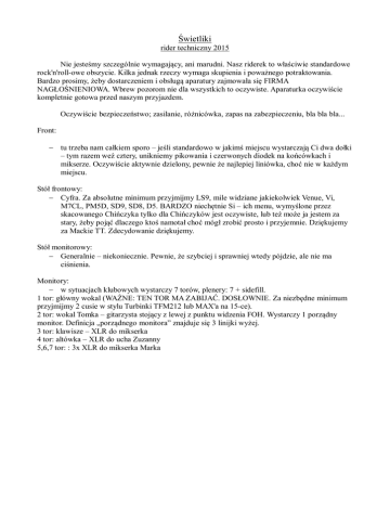 Świetliki rider techniczny 2015 Nie jesteśmy szczególnie wymagający, ani marudni. Nasz riderek to właściwie standardowe rock'n'roll-owe obszycie. Kilka jednak rzeczy wymaga skupienia i poważnego potraktowania. Bardzo prosimy, żeby dostarczeniem i obsługą aparatury zajmowała się FIRMA NAGŁOŚNIENIOWA. Wbrew pozorom nie dla wszystkich to oczywiste. Aparaturka oczywiście kompletnie gotowa przed naszym przyjazdem. Oczywiście bezpieczeństwo; zasilanie, różnicówka, zapas na zabezpieczeniu, bla bla bla... Front: tu trzeba nam całkiem sporo – jeśli standardowo w jakimś miejscu wystarczają Ci dwa dołki – tym razem weź cztery, unikniemy pikowania i czerwonych diodek na końcówkach i mikserze. Oczywiście aktywnie dzielony, pewnie że najlepiej liniówka, choć nie w każdym miejscu. Stół frontowy: Cyfra. Za absolutne minimum przyjmijmy LS9, mile widziane jakiekolwiek Venue, Vi, M7CL, PM5D, SD9, SD8, D5. BARDZO niechętnie Si – ich menu, wymyślone przez skacowanego Chińczyka tylko dla Chińczyków jest oczywiste, lub też może ja jestem za stary, żeby pojąć dlaczego ktoś namotał choć mógł zrobić prosto i przyjemnie. Dziękujemy za Mackie TT. Zdecydowanie dziękujemy. Stół monitorowy: Generalnie – niekoniecznie. Pewnie, że szybciej i sprawniej wtedy pójdzie, ale nie ma ciśnienia. Monitory: w sytuacjach klubowych wystarczy 7 torów, plenery: 7 + sidefill. 1 tor: główny wokal (WAŻNE: TEN TOR MA ZABIJAĆ. DOSŁOWNIE. Za niezbędne minimum przyjmijmy 2 cusie w stylu Turbinki TFM212 lub MAX'a na 15-ce). 2 tor: wokal Tomka – gitarzysta stojący z lewej z punktu widzenia FOH. Wystarczy 1 porządny monitor. Definicja „porządnego monitora” znajduje się 3 linijki wyżej. 3 tor: klawisze – XLR do mikserka 4 tor: altówka – XLR do ucha Zuzanny 5,6,7 tor: : 3x XLR do mikserka Marka Świetliki Input Lista CH Nr Źródło Połączenie Insert inne 1 Stopa dynamik Byle nie D112 bramka niski statyw 2 Stopa trigger DI bramka 3 Werbel góra SM57/i5 4 Werbel dół e-604 5 HH Pojemność 6 T1 e-604 bramka 7 T2 e-604 bramka 8 T3 e-604 bramka 9 FT e-604 bramka 10 OH L Pojemność Wysoki statyw 11 OH R Pojemność Wysoki statyw 12 SPD L DI pasywny, najlepiej Radial 13 SPD R DI pasywny, najlepiej Radial 14 Bas XLR 15 Git e-906/SM57 16 Key 1 L DI pasywny, najlepiej Radial 17 Key 1 R DI pasywny, najlepiej Radial 18 Key 2 L DI pasywny, najlepiej Radial 19 Key 2 R DI pasywny, najlepiej Radial 20 Git baryton DI pasywny, najlepiej Radial 21 Altówka XLR Kompresor 22 Główny wokal Beta 58A!!! kompresor 23 Wokal Tomek (git2) Beta 58A niski statyw niski statyw kompresor Niski statyw kompresor Z góry bardzo dziękujemy! Kontakt techniczny: Jacek „Filler” Dobosz, gsm 601405745, [email protected] Wysoki statyw