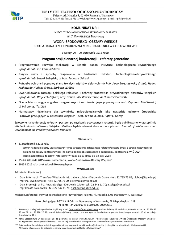 INSTYTUT TECHNOLOGICZNO-PRZYRODNICZY Falenty, Al. Hrabska 3, 05-090 Raszyn k. Warszawy Tel.: 22 628 37 63; fax: 22 735 75 06; http://www.itp.edu.pl; e-mail: [email protected] _______________________________________________________________________________________________________ KOMUNIKAT NR II INSTYTUT TECHNOLOGICZNO-PRZYRODNICZY ZAPRASZA NA 7. KONFERENCJĘ NAUKOWĄ WODAŚRODOWISKOOBSZARY WIEJSKIE POD PATRONATEM HONOROWYM MINISTRA ROLNICTWA I ROZWOJU WSI Falenty, 25 – 26 listopada 2015 roku Program sesji plenarnej konferencji – referaty generalne Programowanie rozwoju melioracji - prof. dr hab. inż. Edmund Kaca w świetle badań Instytutu Technologiczno-Przyrodniczego suszy i sposoby reagowania w badaniach - prof. dr hab. Leszek Łabędzki; dr hab. Tadeusz Liziński Instytutu Technologiczno-Przyrodniczego Ryzyko Potrzeba ochrony i poprawy stanu trwałych użytków zielonych - dr hab. Jerzy Barszczewski; dr hab. Halina Jankowska-Huflejt; dr hab. Barbara Wróbel Uwarunkowania rozwoju polskiego rolnictwa i ochrony środowiska przyrodniczego obszarów wiejskich - prof. dr hab. Wojciech Ziętara, prof. dr hab. Wiesław Dembek; dr Hubert Piórkowski Ocena bilansu węgla w glebach organicznych i możliwości jego poprawy - dr hab. Zygmunt Miatkowski; dr inż. Janusz Turbiak Normatywy higieniczne dla czynników mikrobiologicznych jako narzędzie ochrony środowiska i zdrowia pracujących w obszarach wiejskich - prof. dr hab. n. med. Rafał L. Górny Zgłoszone na konferencję referaty i postery, po uzyskaniu pozytywnych recenzji, będą publikowane w czasopiśmie Woda–Środowisko-Obszary Wiejskie. Możliwy będzie również druk w czasopismach Journal of Water and Land Development lub Problemy Inżynierii Rolniczej WAŻNE DATY: 31 października 2015 roku termin nadesłania karty uczestnictwa** oraz streszczenia zgłaszanego referatu/posteru (max. 1 strona maszynopisu) dokonania opłaty konferencyjnej (na konto banku obsługującego z dopiskiem „Konferencja W-Ś-OW”) termin nadesłania tekstów referatów*** (obj. do 10 stron, ok. 0,5 ark. wyd.) 25–26 listopada 2015 roku - Konferencja „Woda–Środowisko–Obszary Wiejskie” 2015 i 2016 rok - druk zakwalifikowanych prac WAŻNE ADRESY: Sekretariat Konferencji: Dział Informacji i Transferu Wiedzy: dr inż. Izabela Lubbe - Kierownik Działu - tel.: 22 735 75 89; [email protected]; mgr inż. Ewa Szymczak - tel.: 22 735 75 90; [email protected] Dział Promocji: dr inż. Andrzej Seliga - Kierownik Działu - tel.: 22 542 11 70; [email protected] mgr Renata Kalinowska - tel.: 22 542 11 71; [email protected] Miejsce Konferencji: Instytut Technologiczno-Przyrodniczy, Falenty, Al. Hrabska 3, 05-090 Raszyn k. Warszawy Bank obsługujący: BGŻ S.A. II Oddział Operacyjny w Warszawie, Al. Niepodległości 119 nr konta: 24 2030 0045 1110 0000 0029 2710 * Rezerwacja noclegów indywidualna. Najbliższy hotel: Centrum Konferencyjne Falenty – Adres: Falenty, Al. Hrabska 4, 05-090 Raszyn; tel.: 22 720 27 75 do 77; fax: 22 720 27 78; e-mail: [email protected]; cena noclegu ze śniadaniem w pokoju 1-osobowym wynosi 110 zł, w pokoju 2-osobowym 70 zł ** Karta uczestnictwa w załączeniu lub do pobrania ze strony www.itp.edu.pl: 7.Konferencja Naukowa „Woda-Środowisko-Obszary Wiejskie”. Po wypełnieniu należy przesłać faxem (22 735 75 06), e-mailem lub pocztą na adres Działu Informacji i Transferu Wiedzy ITP *** Teksty referatów należy przesłać drogą elektroniczną ([email protected]) lub zwykłą (z płytą CD) na adres Działu Wydawnictw ITP. Wytyczne dla autorów do pobrania ze strony www.itp.edu.pl: zakładka „Wydawnictwo” Konferencja pod patronatem czasopisma „Woda–Środowisko–Obszary Wiejskie” KOMITET HONOROWY KONFERENCJI (Rada Naukowa czasopisma) Prof. dr hab. Leszek Łabędzki (przewodniczący) ITP, K-POB w Bydgoszczy (Polska) Prof. dr hab. Eugeniusz Karol Chyłek MRiRW, Warszawa (Polska) Prof. dr hab. Andrzej Kędziora ZBŚRiL PAN i UP, Poznań (Polska) Prof. dr hab. Stanisława Okularczyk MRiRW, Warszawa (Polska) Prof. dr hab. Stanisław Twardy ITP, MOB w Krakowie (Polska) Prof. dr hab. Maciej Zalewski UŁ w Łodzi (Polska) Prof. Dr. Okke Batelaan Vrije Universiteit Brussel (Belgia) Prof. Kireyheva Liudmila Vladimirovna All-Russian Research Institute for Hydraulic Engineering and Land Reclamation, Moskwa (Rosja) Dr. hab. Jurík Lubos PhD. Slovak Agricultural University in Nitra (Slovakia) Prof. Viktor Moshynsky Ukrainian State University of Water Management & Natural Resources Use (NUWM), Rivne (Ukraina) Prof. Dr. Oene Oenema Wageningen University and Research Center, Alterra (Holandia) Prof. Dr. Giuseppe Parente University of Udine (Włochy) Prof. Dr. Alain Peeters RHEA - Natural Resources, Human Environment and Agronomy (Gentinnes, Belgia) KOMITET NAUKOWY KONFERENCJI (Komitet Redakcyjny czasopisma) Prof. dr hab. Edmund Kaca redaktor naczelny gospodarka wodna, melioracje wodne, ochrona jakości wód Prof. dr hab. Szczepan L. Dąbkowski zastępca redaktora naczelnego kształtowanie środowiska, inżynieria wodna, budownictwo wodno-melioracyjne, hydrologia Prof. dr hab. Magdalena Borys inżynieria wodna, budownictwo wodno-melioracyjne, geotechnika Prof. dr hab. Wiesław Dembek ochrona środowiska, ochrona przyrody Dr hab. Halina Jankowska-Huflejt sekretarz łąkarstwo, agronomia Dr hab. Tadeusz Liziński ekonomia zasobów Prof. dr hab. Waldemar Mioduszewski kształtowanie środowiska, inżynieria wodnomelioracyjna, gospodarka wodna Prof. dr hab. Janusz Ostrowski gleboznawstwo melioracyjne, kartografia Prof. dr hab. Stefan Russel biologia środowiska, sanitacja i higienizacja terenów wiejskich, bioremediacja gleby Prof. dr hab. Andrzej Sapek chemia środowiska i chemia rolna Dr hab. Zbigniew Wasilewski łąkarstwo i łąkoznawstwo Falenty, listopad 2015 roku