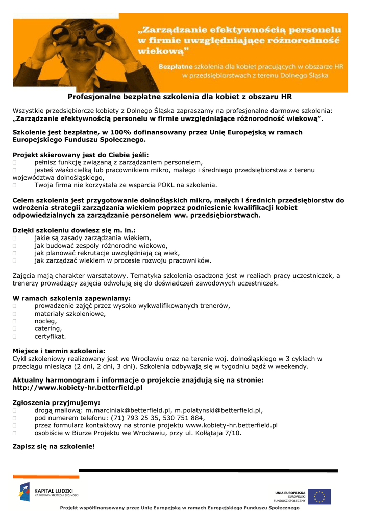 Profesjonalne bezpłatne szkolenia dla kobiet z obszaru HR Wszystkie przedsiębiorcze kobiety z Dolnego Śląska zapraszamy na profesjonalne darmowe szkolenia: „Zarządzanie efektywnością personelu w firmie uwzględniające różnorodność wiekową”. Szkolenie jest bezpłatne, w 100% dofinansowany przez Unię Europejską w ramach Europejskiego Funduszu Społecznego. Projekt skierowany jest do Ciebie jeśli: pełnisz funkcję związaną z zarządzaniem personelem, jesteś właścicielką lub pracownikiem mikro, małego i średniego przedsiębiorstwa z terenu województwa dolnośląskiego, Twoja firma nie korzystała ze wsparcia POKL na szkolenia. Celem szkolenia jest przygotowanie dolnośląskich mikro, małych i średnich przedsiębiorstw do wdrożenia strategii zarządzania wiekiem poprzez podniesienie kwalifikacji kobiet odpowiedzialnych za zarządzanie personelem ww. przedsiębiorstwach. Dzięki szkoleniu dowiesz się m. in.: jakie są zasady zarządzania wiekiem, jak budować zespoły różnorodne wiekowo, jak planować rekrutacje uwzględniają cą wiek, jak zarządzać wiekiem w procesie rozwoju pracowników. Zajęcia mają charakter warsztatowy. Tematyka szkolenia osadzona jest w realiach pracy uczestniczek, a trenerzy prowadzący zajęcia odwołują się do doświadczeń zawodowych uczestniczek. W ramach szkolenia zapewniamy: prowadzenie zajęć przez wysoko wykwalifikowanych trenerów, materiały szkoleniowe, nocleg, catering, certyfikat. Miejsce i termin szkolenia: Cykl szkoleniowy realizowany jest we Wrocławiu oraz na terenie woj. dolnośląskiego w 3 cyklach w przeciągu miesiąca (2 dni, 2 dni, 3 dni). Szkolenia odbywają się w tygodniu bądź w weekendy. Aktualny harmonogram i informacje o projekcie znajdują się na stronie: http://www.kobiety-hr.betterfield.pl Zgłoszenia przyjmujemy: drogą mailową: [email protected], [email protected], pod numerem telefonu: (71) 793 25 35, 530 751 884, przez formularz kontaktowy na stronie projektu www.kobiety-hr.betterfield.pl osobiście w Biurze Projektu we Wrocławiu, przy ul. Kołłątaja 7/10. Zapisz się na szkolenie! Projekt współfinansowany przez Unię Europejską w ramach Europejskiego Funduszu Społecznego