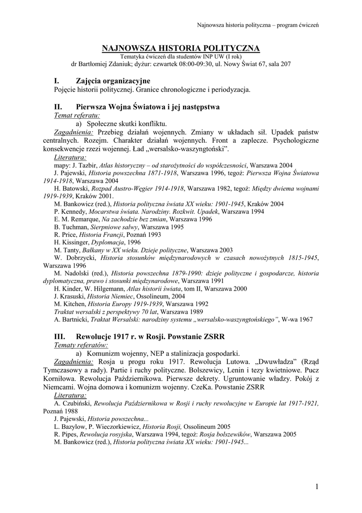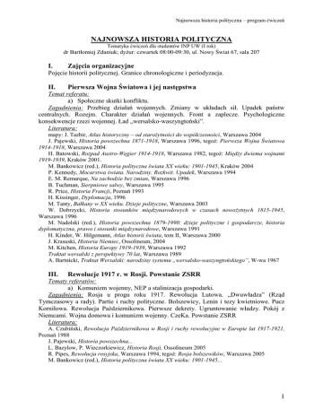 Najnowsza historia polityczna – program ćwiczeń NAJNOWSZA HISTORIA POLITYCZNA Tematyka ćwiczeń dla studentów INP UW (I rok) dr Bartłomiej Zdaniuk; dyŜur: czwartek 08:00-09:30, ul. Nowy Świat 67, sala 207 I. Zajęcia organizacyjne Pojęcie historii politycznej. Granice chronologiczne i periodyzacja. II. Pierwsza Wojna Światowa i jej następstwa Temat referatu: a) Społeczne skutki konfliktu. Zagadnienia: Przebieg działań wojennych. Zmiany w układach sił. Upadek państw centralnych. Rozejm. Charakter działań wojennych. Front a zaplecze. Psychologiczne konsekwencje rzezi wojennej. Ład „wersalsko-waszyngtoński”. Literatura: mapy: J. Tazbir, Atlas historyczny – od staroŜytności do współczesności, Warszawa 2004 J. Pajewski, Historia powszechna 1871-1918, Warszawa 1996, tegoŜ: Pierwsza Wojna Światowa 1914-1918, Warszawa 2004 H. Batowski, Rozpad Austro-Węgier 1914-1918, Warszawa 1982, tegoŜ: Między dwiema wojnami 1919-1939, Kraków 2001. M. Bankowicz (red.), Historia polityczna świata XX wieku: 1901-1945, Kraków 2004 P. Kennedy, Mocarstwa świata. Narodziny. Rozkwit. Upadek, Warszawa 1994 E. M. Remarque, Na zachodzie bez zmian, Warszawa 1996 B. Tuchman, Sierpniowe salwy, Warszawa 1995 R. Price, Historia Francji, Poznań 1993 H. Kissinger, Dyplomacja, 1996 M. Tanty, Bałkany w XX wieku. Dzieje polityczne, Warszawa 2003 W. Dobrzycki, Historia stosunków międzynarodowych w czasach nowoŜytnych 1815-1945, Warszawa 1996 M. Nadolski (red.), Historia powszechna 1879-1990: dzieje polityczne i gospodarcze, historia dyplomatyczna, prawo i stosunki międzynarodowe, Warszawa 1991 H. Kinder, W. Hilgemann, Atlas historii świata, tom II, Warszawa 2000 J. Krasuski, Historia Niemiec, Ossolineum, 2004 M. Kitchen, Historia Europy 1919-1939, Warszawa 1992 Traktat wersalski z perspektywy 70 lat, Warszawa 1989 A. Bartnicki, Traktat Wersalski: narodziny systemu „wersalsko-waszyngtońskiego”, W-wa 1967 III. Rewolucje 1917 r. w Rosji. Powstanie ZSRR Tematy referatów: a) Komunizm wojenny, NEP a stalinizacja gospodarki. Zagadnienia: Rosja u progu roku 1917. Rewolucja Lutowa. „Dwuwładza” (Rząd Tymczasowy a rady). Partie i ruchy polityczne. Bolszewicy, Lenin i tezy kwietniowe. Pucz Korniłowa. Rewolucja Październikowa. Pierwsze dekrety. Ugruntowanie władzy. Pokój z Niemcami. Wojna domowa i komunizm wojenny. CzeKa. Powstanie ZSRR Literatura: A. Czubiński, Rewolucja Październikowa w Rosji i ruchy rewolucyjne w Europie lat 1917-1921, Poznań 1988 J. Pajewski, Historia powszechna... L. Bazylow, P. Wieczorkiewicz, Historia Rosji, Ossolineum 2005 R. Pipes, Rewolucja rosyjska, Warszawa 1994, tegoŜ: Rosja bolszewików, Warszawa 2005 M. Bankowicz (red.), Historia polityczna świata XX wieku: 1901-1945... 1 Najnowsza historia polityczna – program ćwiczeń IV. Kryzys demokracji w okresie międzywojennym: faszyzm włoski, nazizm niemiecki, państwa autorytarne Tematy referatów: a) Etapy kształtowania państwa totalnego we Włoszech (od marszu na Rzym) i w Niemczech (od powstania rządu Hitlera). b) Totalitaryzmy i autorytaryzmy – podobieństwa i róŜnice. Zagadnienia: Włochy po zakończeniu Wojny Światowej: niestabilna sytuacja społecznopolityczna. Mussolini. Pierwsza i druga organizacja faszystowska. Metoda działania. Przejęcie i ugruntowanie władzy. Państwo totalitarne. Polityka zagraniczna. Chaos społeczno-polityczny w Niemczech po rozejmie z listopada 1918. Kryzys roku 1923. Plan Dawesa i plan Younga. OdpręŜenie: era Brianda-Stresemana. Skutki gospodarczospołeczne kryzysu roku 1929. Niestabilność polityczna. Hitler i partia nazistowska. Hitler a klasa polityczna. Przejęcie władzy przez NSDAP. Likwidacja opozycji wewnątrz- i pozapartyjnej. Mechanizmy władzy państwa totalitarnego. Ustroje autorytarne Półwyspu Iberyjskiego. Wojna domowa w Hiszpanii. Franizm. Salazaryzm i ideologia „nowego państwa”. Cechy szczególne ustrojów autorytarnych w Europie Środkowej i Wschodniej. Literatura: J. W. Borejsza, Mussolini był pierwszy..., Warszawa 1989 S. Sierpowski, Faszyzm we Włoszech 1919-1926, Ossolineum, 1973 T. Kotłowski, Historia Republiki Weimarskiej 1919-1933, Poznań 2004 M. Kitchen, Historia Europy 1919-1939, Wrocław 1997 M. Bankowicz (red.), Historia polityczna świata XX wieku: 1901-1945... F. Ryszka, Państwo stanu wyjątkowego: rzecz o systemie państwa i prawa III Rzeszy, Warszawa 1985, tegoŜ: Noc i mgła, Warszawa-Wrocław-Kraków 1966 J. Baszkiewicz, Powszechna historia ustrojów państwowych, Gdańsk 2001 J. Gierowski, Historia Włoch, Wrocław 2003 J. Krasuski, Historia Niemiec... R. Grunberger, Historia społeczna Trzeciej Rzeszy, Warszawa 1994 M. Włodarczyk, „Frankizm i salazaryzm – autorytaryzmy Półwyspu Iberyjskiego”, Społeczeństwo i Polityka. Pismo edukacyjne, nr 2(19)/2009 M. Tanty, Bałkany w XX wieku... B. Zdaniuk, „Kształtowanie się reŜimów autorytarnych w Europie Środkowej i Wschodniej okresu międzywojennego – analiza porównawcza”, Społeczeństwo i Polityka. Pismo edukacyjne, nr 2(19)/2009 V. Polityka zagraniczna III Rzeszy Tematy referatów: a) Stosunki włosko-niemiecko-japońskie (1933-1945). b) Okoliczności zawarcia układu Ribbentrop-Mołotow. Zagadnienia: Naruszanie przez Niemcy postanowień Traktatu Wersalskiego. Tworzenie osi Berlin-Rzym-Tokio (pakt antykominternowski, pakt stalowy). Zajęcie Austrii. Konferencja monachijska. Rozbiór Czechosłowacji. Układ Ribbentrop-Mołotow i jego zmiana. Literatura: mapy: J. Tazbir, Atlas historyczny... W. Dobrzycki, Historia stosunków międzynarodowych... H. Batowski, Między dwiema wojnami..., tegoŜ: Zdrada monachijska, Poznań 1973, Europa zmierza ku przepaści, Poznań 1989. H. Kissinger, Dyplomacja... G. Gafencu, Ostatnie dni Europy, Warszawa 1984 2 Najnowsza historia polityczna – program ćwiczeń VI. Druga Wojna Światowa Temat referatu: a) Kształtowanie się koalicji antyhitlerowskiej. Zagadnienia: Napaść Niemiec na Polskę. Agresje radz