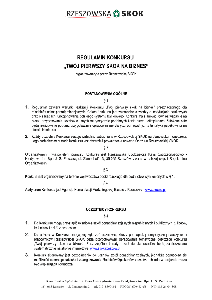 REGULAMIN KONKURSU „TWÓJ PIERWSZY SKOK NA BIZNES” organizowanego przez Rzeszowską SKOK POSTANOWIENIA OGÓLNE §1 1. Regulamin zawiera warunki realizacji Konkursu „Twój pierwszy skok na biznes” przeznaczonego dla młodzieży szkół ponadgminazjalnych. Celem konkursu jest wzmocnienie wiedzy o instytucjach bankowych oraz o zasadach funkcjonowania polskiego systemu bankowego. Konkurs ma stanowić również wsparcie na rzecz przygotowania uczniów w innych merytorycznie podobnych konkursach i olimpiadach. Założone cele będą realizowane poprzez przygotowanie opracowań merytorycznych zgodnych z tematyką publikowaną na stronie Konkursu. 2. Każdy uczestnik Konkursu zostaje wirtualnie zatrudniony w Rzeszowskiej SKOK na stanowisku menedżera. Jego zadaniem w ramach Konkursu jest otwarcie i prowadzenie nowego Oddziału Rzeszowskiej SKOK. §2 Organizatorem i właścicielem pomysłu Konkursu jest Rzeszowska Spółdzielcza Kasa Oszczędnościowo Kredytowa im. Bpa J. S. Pelczara, ul. Zamenhoffa 3, 35-065 Rzeszów, zwana w dalszej części Regulaminu Organizatorem. §3 Konkurs jest organizowany na terenie województwa podkarpackiego dla podmiotów wymienionych w § 1. §4 Audytorem Konkursu jest Agencja Komunikacji Marketingowej Exacto z Rzeszowa - www.exacto.pl UCZESTNICY KONKURSU §4 1. Do Konkursu mogą przystąpić uczniowie szkół ponadgimnazjalnych niepublicznych i publicznych tj. liceów, techników i szkół zawodowych, 2. Do udziału w Konkursie mogą się zgłaszać uczniowie, którzy pod opieką merytoryczną nauczycieli i pracowników Rzeszowskiej SKOK będą przygotowywali opracowania tematyczne dotyczące konkursu „Twój pierwszy skok na biznes”. Poszczególne tematy i zadania dla uczniów będą zamieszczane systematycznie na stronie internetowej www.skok.rzeszow.pl 3. Konkurs skierowany jest bezpośrednio do uczniów szkół ponadgimnazjalnych, jednakże dopuszcza się możliwość czynnego udziału i zaangażowania Rodziców/Opiekunów uczniów. Ich rola w projekcie może być wspierająca i doradcza. Rzeszowska Spółdzielcza Kasa Oszczędnościowo–Kredytowa im. Bpa J. S. Pelczara 35 - 065 Rzeszów ul. Zamenhoffa 3 tel. 017 8590101 REGON 690463458 NIP 813-24-04-508 WARUNKI KONKURSU §5 1. W celu wzięcia udziału w Konkursie, niezbędna jest deklaracja udziału zawierająca dane osoby – Uczestnika, zgodnie z załącznikiem nr 1. 2. Deklaracje należy wypełnić i złożyć w siedzibie Organizatora osobiście lub przez Rodzica/Opiekuna ucznia, do dnia 15 listopada 2010 roku. Deklarację uważa się za przyjętą w sytuacji otrzymania przez zgłaszającego potwierdzenia uczestnictwa w Konkursie, zgodnie z załącznikiem nr 2. 3. W przypadku osób, które nie ukończyły 18 lat konieczna jest zgoda Rodzica/Opiekuna na uczestnictwo syna/córki/podopiecznego w konkursie oraz wyrażenie zgody na przetwarzanie danych osobowych syna/córki/podopiecznego. 4. Konkurs będzie trwał od 16 listopada 2010 roku do marca 2011 roku. 5. Organizator dopuszcza możliwość przesunięcia ww. terminów. 6. Warunkiem udziału w Konkursie, jest terminowe dostarczenie prac na każdym jego etapie do siedziby Organizatora. Przyjęcie pracy zostanie każdorazowo potwierdzone na Karcie Konkursowej, która stanowi załącznik nr 2. 7. Terminy oddania prac będą zamieszczone na stronie www.skok.rzeszow.pl i przesłane do Uczestników pocztą elektroniczną. 8. Prace powinny być oddawane w wersji wydrukowanego dokumentu Word, napisane czcionką 12, Times New Roman lub Arial, z zachowaniem marginesów 2,5 z każdej strony oraz odstępu pomiędzy wierszami 1,5. Maksymalna objętość każdego opracowania z danego etapu powinna wynosić do 3 stron A4. W opracowaniu mogą być zamieszczane tabele, wykresy, zdjęcia, szkice i schematy. 9. Prace powinny być autorskimi opracowaniami Uczestników Konkursu. Nie jest dopuszczalne kopiowanie i przepisywanie innych opracowań włącznie z opracowaniami zawartymi w internecie. W przypadku wykrycia plagiatu, Organizator dokona dyskwalifikacji takiego Uczestnika. 10. Po każdym etapie Konkursu prace będą poddawane ocenie, zaś o zwycięstwie decydować będzie sumaryczna liczba punktów uzyskanych przez Uczestnika przez cały okres trwania Konkursu. 11. Lista zwycięzców zostanie ogłoszona w kwietnia 2011 roku. Wręczenie nagród odbędzie się w miejscu i terminie wskazanym przez Organizatora. Najlepsze prace zostaną zaprezentowane podczas uroczystej Gali, w której wezmą udział uczniowie, ich Rodzicie/Opiekunowie, nauczyciele i goście specjalni. 12. Organizator zastrzega sobie prawo częściowego lub całościowego wykorzystania opracowań Uczestników Konkursu. Uczestnik – autor opracowania tym samym przekazuje Organizatorowi prawa autorskie do pełnego wykorzystania pomysłów i danych zawartych w opracowaniu. KOMISJA KONKURSOWA §6 1. Prace będą oceniane systematycznie, po każdym etapie Konkursu przez Komisje Konkursowe, w skład których wchodzić będą specjaliści z Rzeszowskiej SKOK, nauczyciele wybranych szkół z terenu Podkarpacia oraz przedstawiciel Audytora Konkursu, firmy EXACTO. 2. Każda praca będzie sprawdzana przez trzyosobową Komisję Konkursową. W każdej Komisji zawsze znajdować się będzie przynajmniej jeden przedstawiciel Organizatora. Rzeszowska Spółdzielcza Kasa Oszczędnościowo–Kredytowa im. Bpa J. S. Pelczara 35 - 065 Rzeszów ul. Zamenhoffa 3 tel. 017 8590101 REGON 690463458 NIP 813-24-04-508 3. Wyniki z każdego etapu będą przekazywane uczestnikom Konkursu indywidualnie drogą elektroniczną. O liczbie punktów będzie można się dowiedzieć również osobiście w Oddziale lub Centrali Rzeszowskiej SKOK. 4. Oceny będą dokonywane przez członków każdej Komisji anonimowo, każda praca otrzyma swój kod. Za kodowanie i rozkodowywanie będą odpowiedzialni: przedstawiciel Organizatora oraz Audytora Konkursu. NAGRODY §7 1. Nagrodami w Konkursie są min.: a. Notebook b. Odtwarzacze MP4 c. Kamera