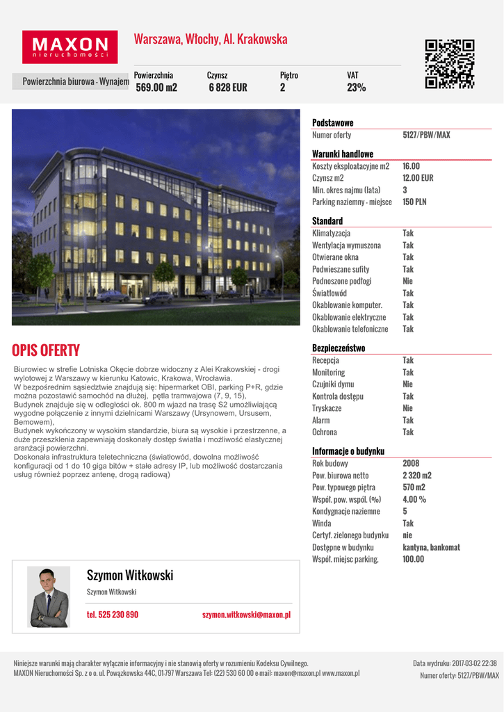 Warszawa, Włochy, Al. Krakowska Powierzchnia biurowa - Wynajem Powierzchnia 569.00 m2 Czynsz 6 828 EUR Piętro VAT 2 23% Podstawowe Numer oferty 5127/PBW/MAX Warunki handlowe Koszty eksploatacyjne m2 16.00 Czynsz m2 12.00 EUR Min. okres najmu (lata) 3 Parking naziemny - miejsce 150 PLN Standard Klimatyzacja Tak Wentylacja wymuszona Tak Otwierane okna Tak Podwieszane sufity Tak Podnoszone podłogi Nie Światłowód Tak Okablowanie komputer. Tak Okablowanie elektryczne Tak Okablowanie telefoniczne Tak OPIS OFERTY Bezpieczeństwo Biurowiec w strefie Lotniska Okęcie dobrze widoczny z Alei Krakowskiej - drogi wylotowej z Warszawy w kierunku Katowic, Krakowa, Wrocławia. W bezpośrednim sąsiedztwie znajdują się: hipermarket OBI, parking P+R, gdzie można pozostawić samochód na dłużej, pętla tramwajowa (7, 9, 15), Budynek znajduje się w odległości ok. 800 m wjazd na trasę S2 umożliwiającą wygodne połączenie z innymi dzielnicami Warszawy (Ursynowem, Ursusem, Bemowem), Budynek wykończony w wysokim standardzie, biura są wysokie i przestrzenne, a duże przeszklenia zapewniają doskonały dostęp światła i możliwość elastycznej aranżacji powierzchni. Doskonała infrastruktura teletechniczna (światłowód, dowolna możliwość konfiguracji od 1 do 10 giga bitów + stałe adresy IP, lub możliwość dostarczania usług również poprzez antenę, drogą radiową) Recepcja Tak Monitoring Tak Czujniki dymu Nie Kontrola dostępu Tak Tryskacze Nie Alarm Tak Ochrona Tak Informacje o budynku Rok budowy 2008 Pow. biurowa netto 2 320 m2 Pow. typowego piętra 570 m2 Współ. pow. wspól. (%) 4.00 % Kondygnacje naziemne 5 Winda Tak Certyf. zielonego budynku nie Dostępne w budynku kantyna, bankomat Współ. miejsc parking. 100.00 Szymon Witkowski Szymon Witkowski tel. 525 230 890 [email protected] Niniejsze warunki mają charakter wyłącznie informacyjny i nie stanowią oferty w rozumieniu Kodeksu Cywilnego. MAXON Nieruchomości Sp. z o o. ul. Powązkowska 44C, 01-797 Warszawa Tel: (22) 530 60 00 e-mail: [email protected] www.maxon.pl Data wydruku: 2017-03-02 22:38 Numer oferty: 5127/PBW/MAX
